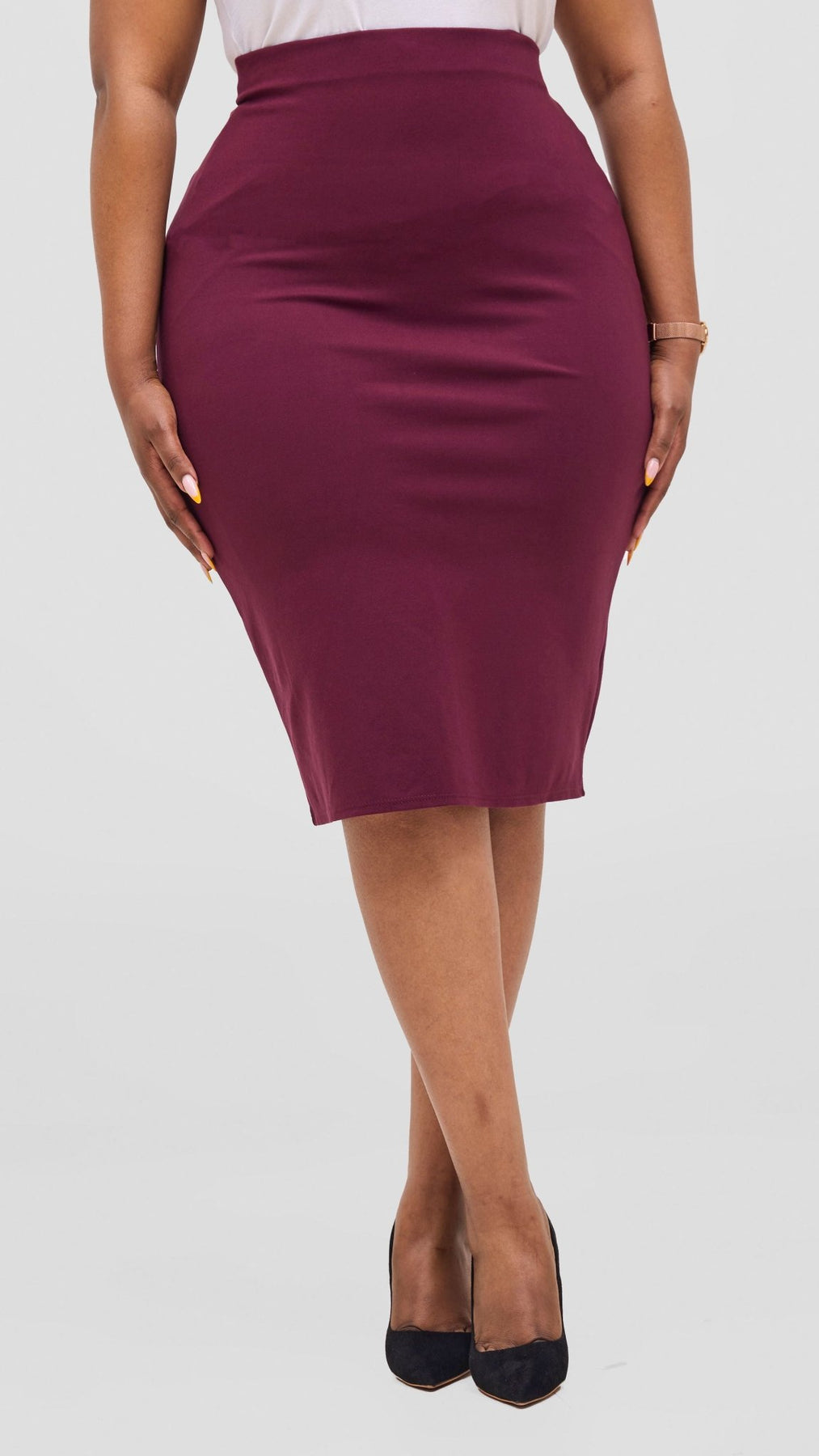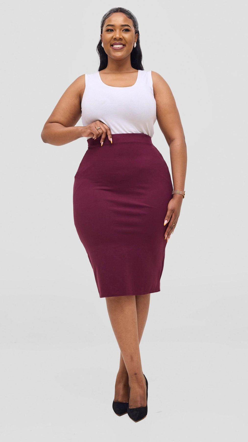 Elevate your wardrobe with the Vivo Basic Waridi Pencil Skirt in rich burgundy. Designed to flatter your silhouette, this skirt offers a sleek, tailored fit perfect for both office days and evening outings. Its deep burgundy hue adds a touch of sophistication, making it a versatile piece that pairs effortlessly with your favorite tops. Experience comfort and style combined in one essential skirt that enhances your confidence wherever you go.