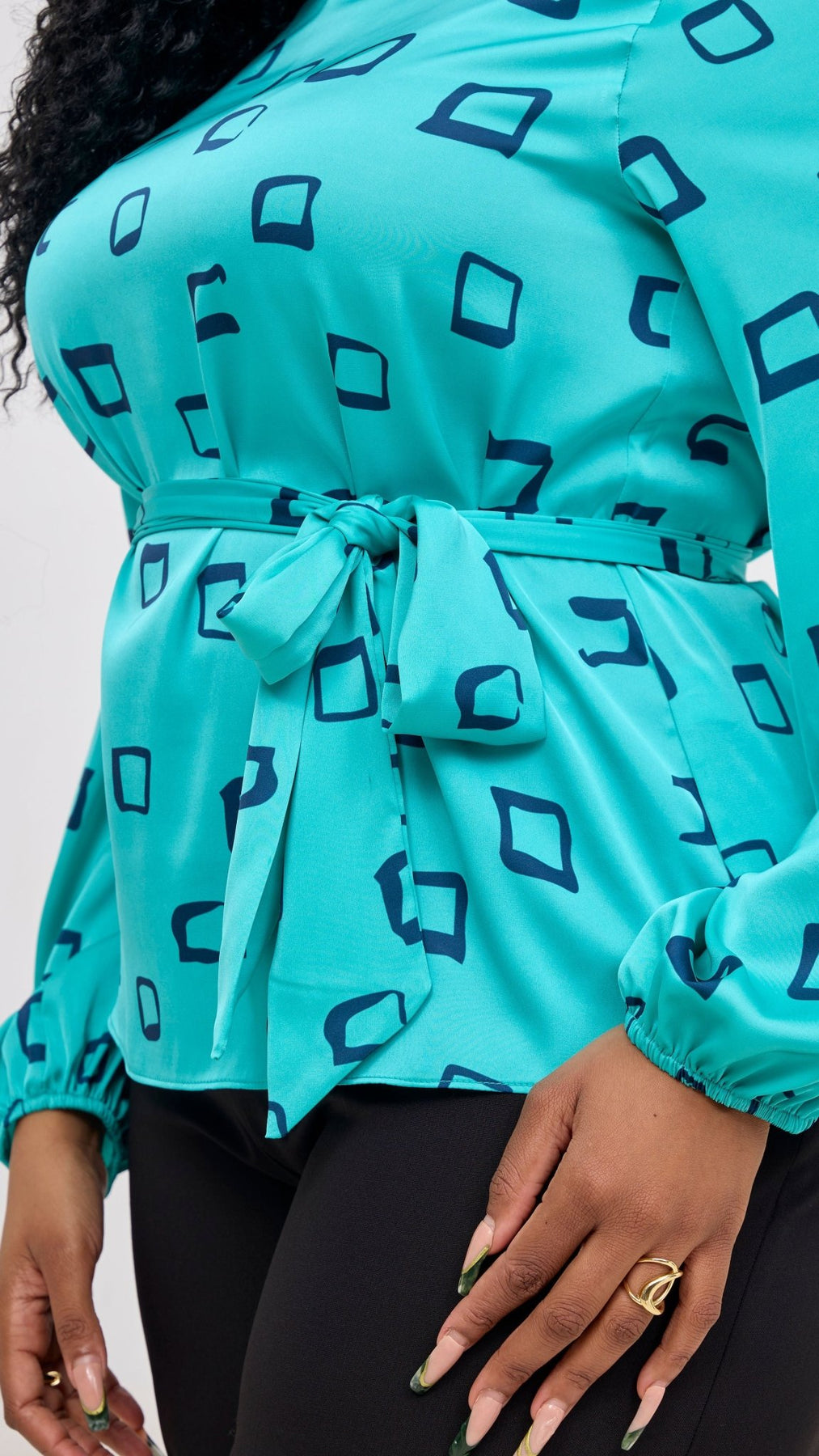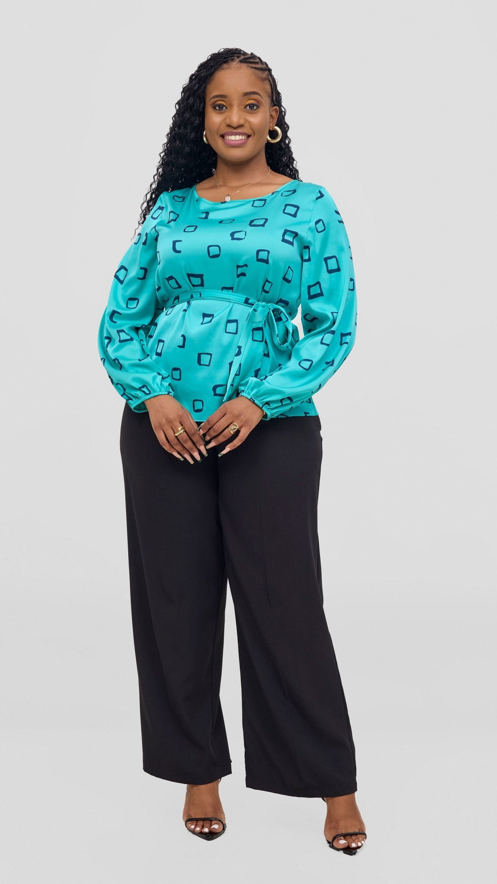 The Vivo Basic Satin Bishop Sleeve Top in Sea Green with Navy Nita Print offers a graceful blend of style and comfort. Crafted from smooth satin, its bishop sleeves add volume and drama, while the subtle contrast of sea green and navy print provides a chic, sophisticated look suitable for both office wear and elegant outings.