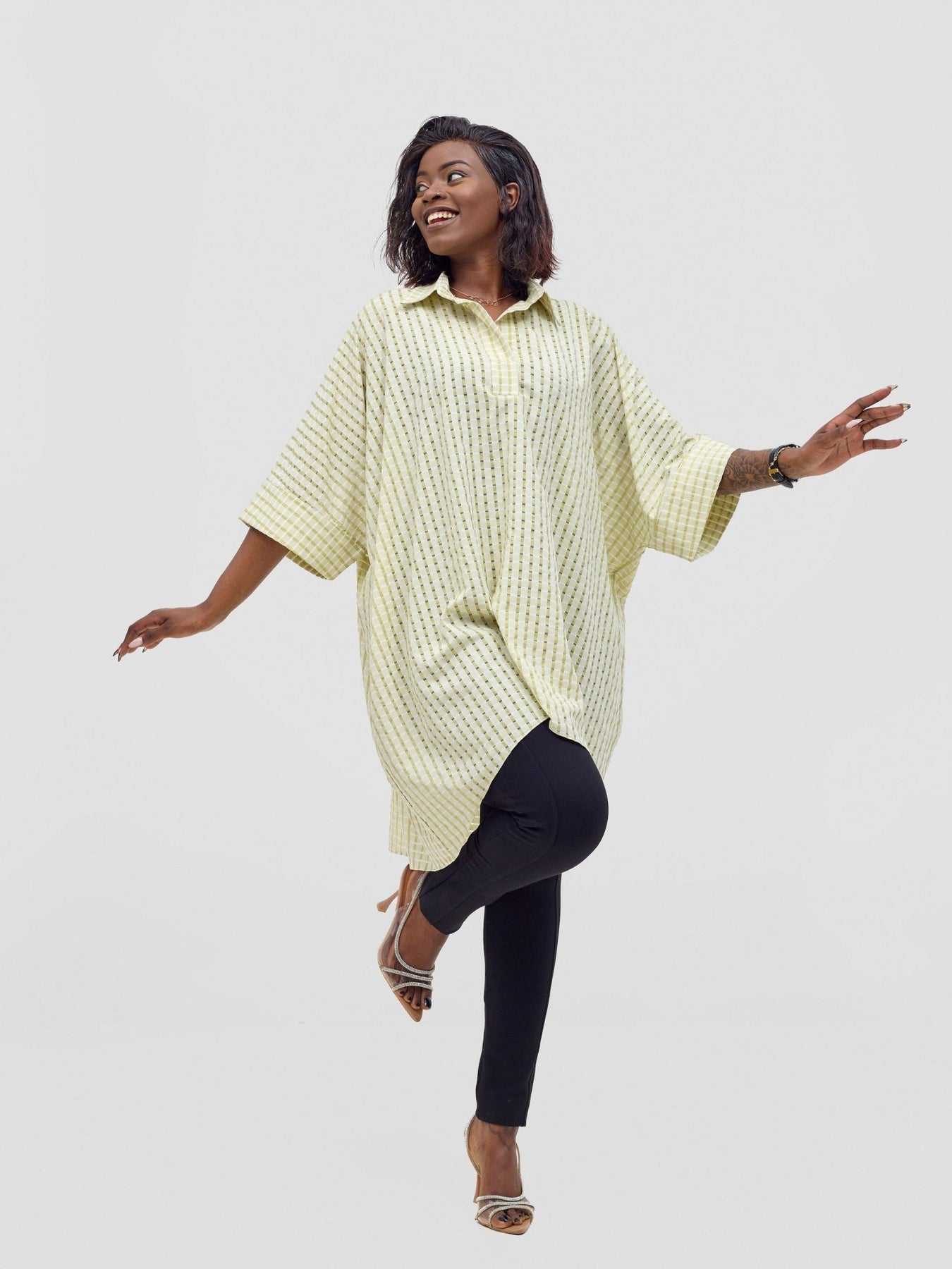 Vivo Mistari 3/4 Sleeve V - Neck Collared Tunic Top - Light Olive Checkered - Shopzetu