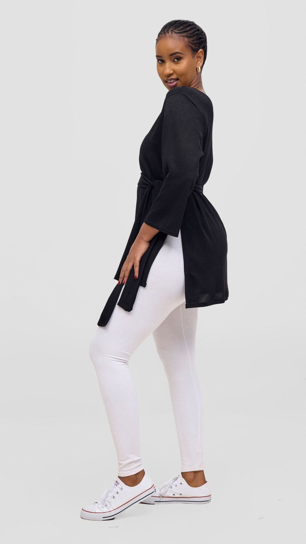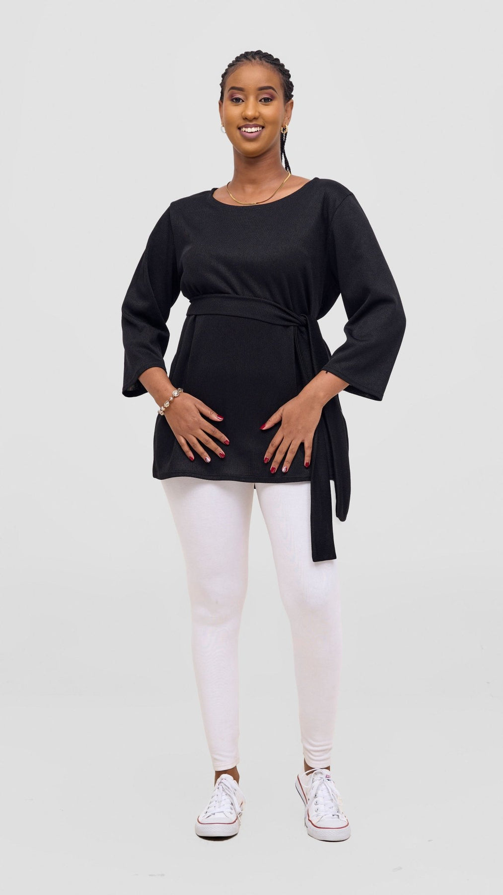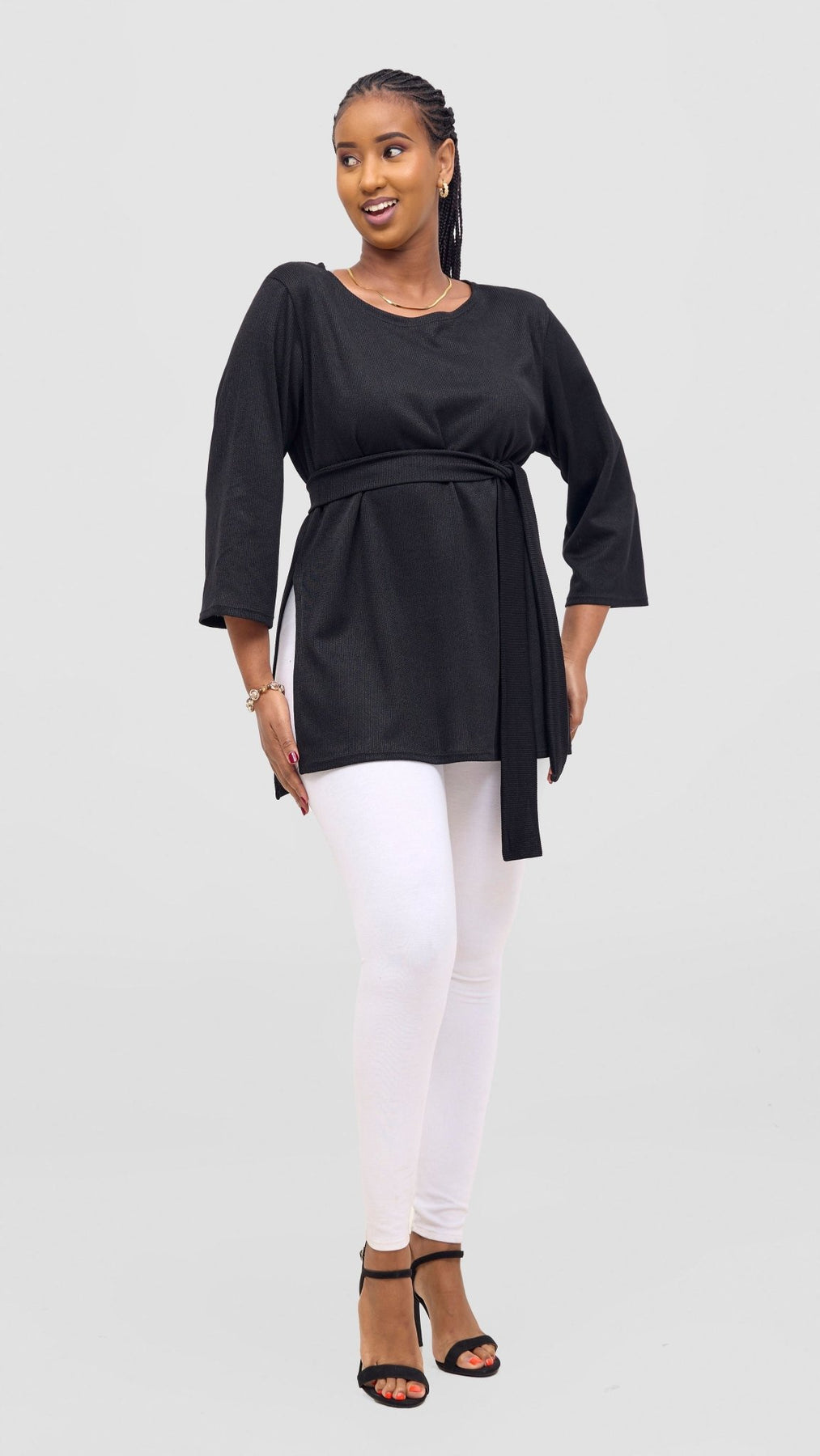 The Vivo Rema 3/4 Sleeve Side Slit Tunic Top in black offers a refined silhouette with its tailored fit and subtle side slits, enhancing comfort and movement. Crafted for versatility, this tunic pairs effortlessly with both casual and professional wardrobes, while the rich dark olive hue adds a sophisticated touch to your ensemble. Ideal for layering or wearing alone, it balances style and practicality for everyday wear.