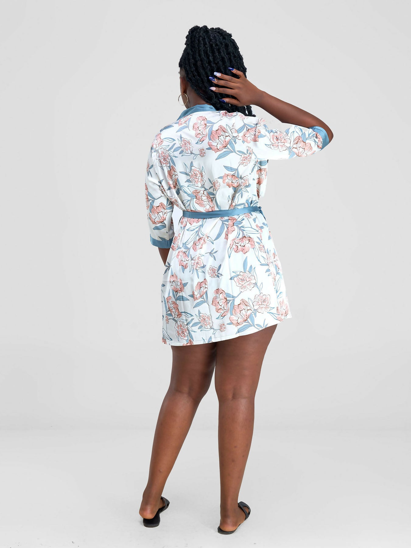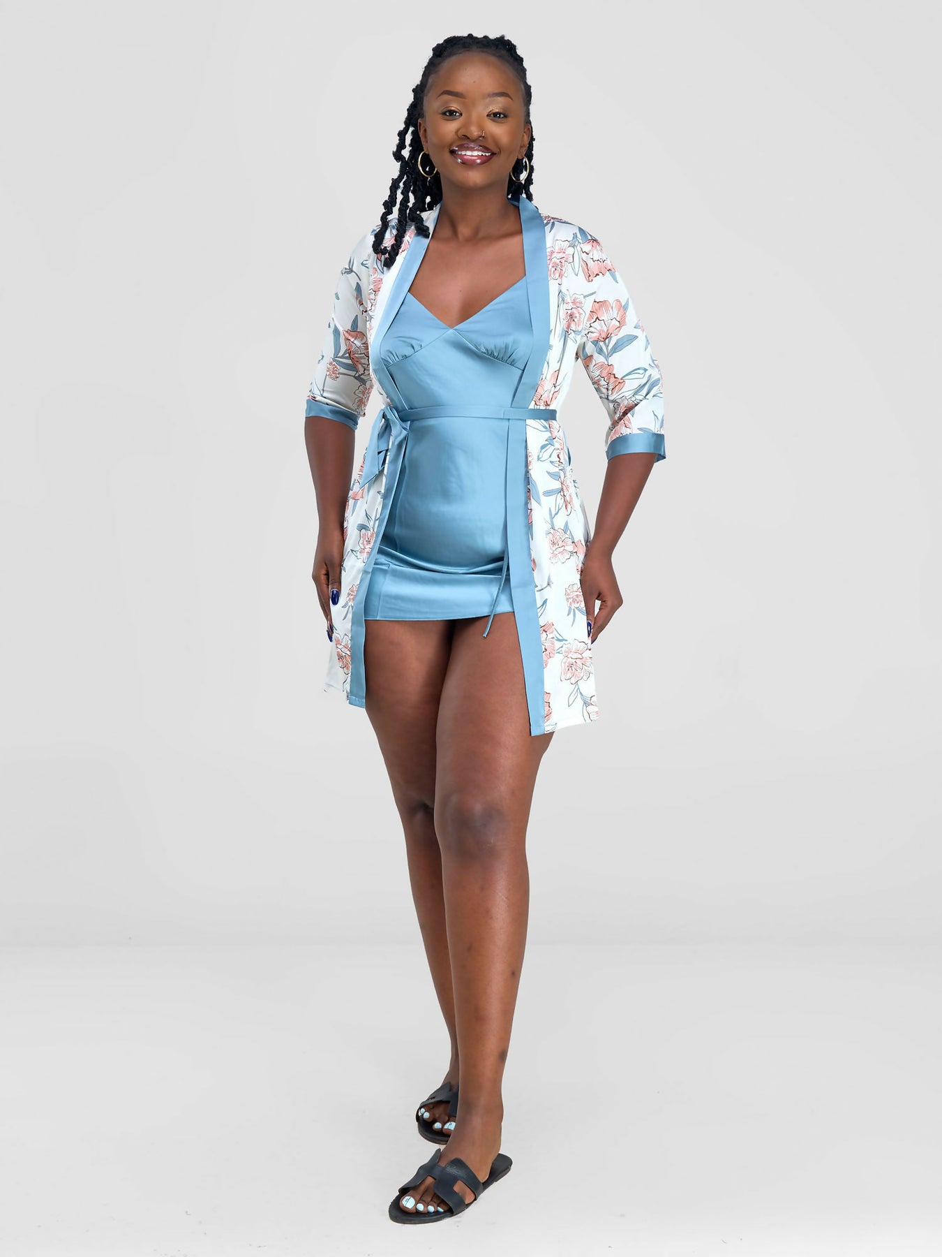 Silk Dress & Robe Set in Blue With Floral Details