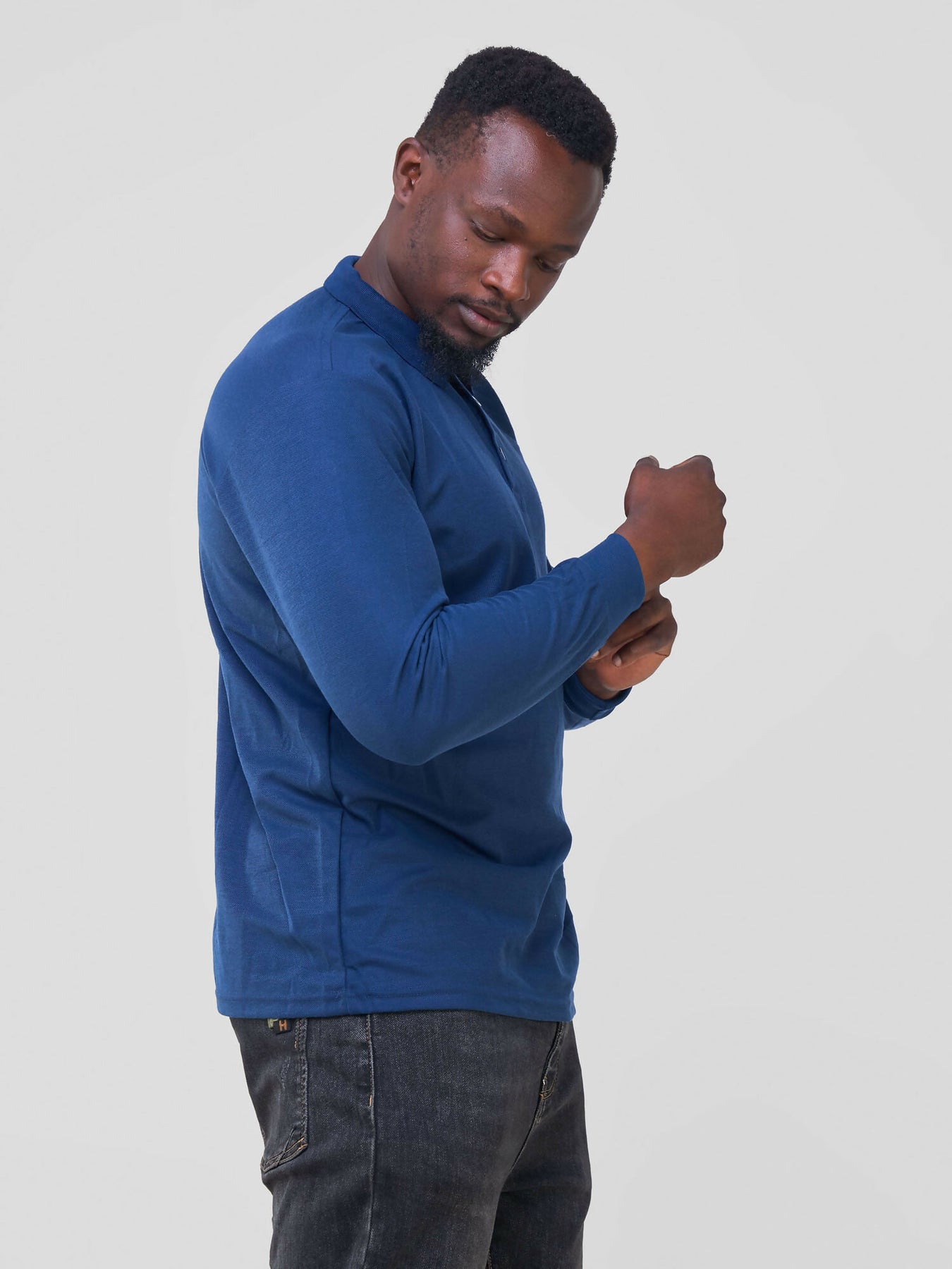 Long Sleeved Polo T-Shirt - Navy Blue - Shopzetu
