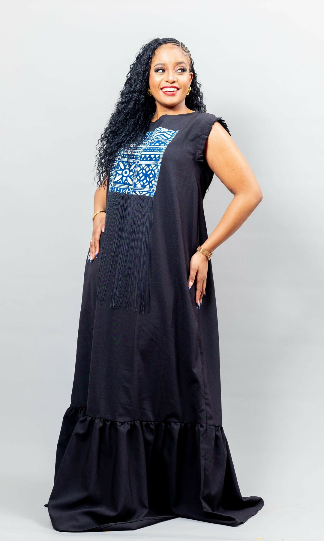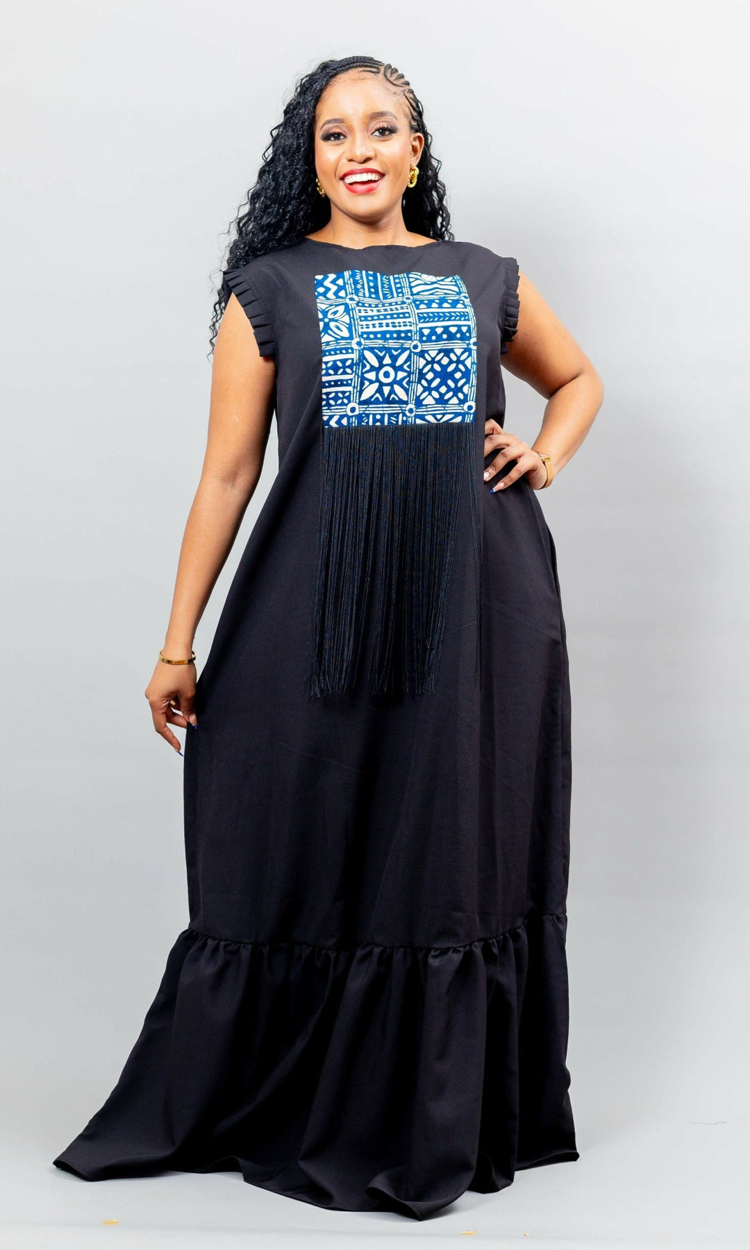 Make a bold and sophisticated statement with this long black maxi dress, featuring exquisite African print patchwork and delicate front frills. Designed for elegance and movement, this dress is the perfect wedding guest outfit, effortlessly blending culture and class.
