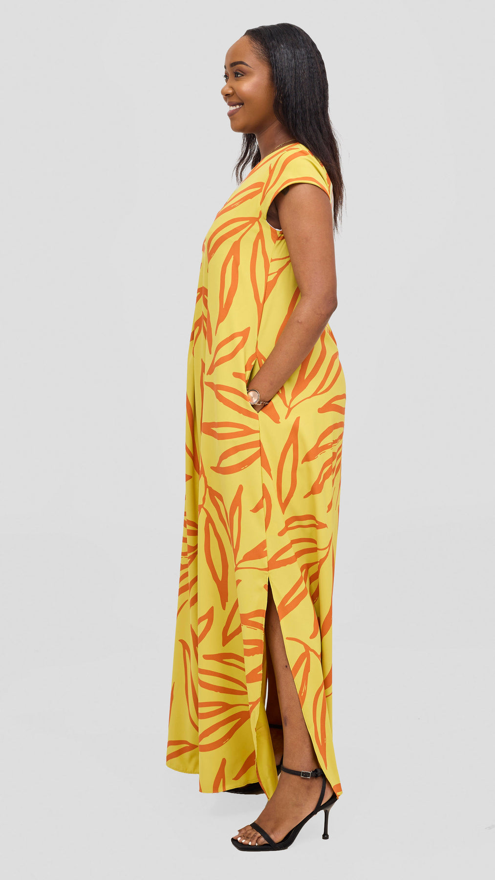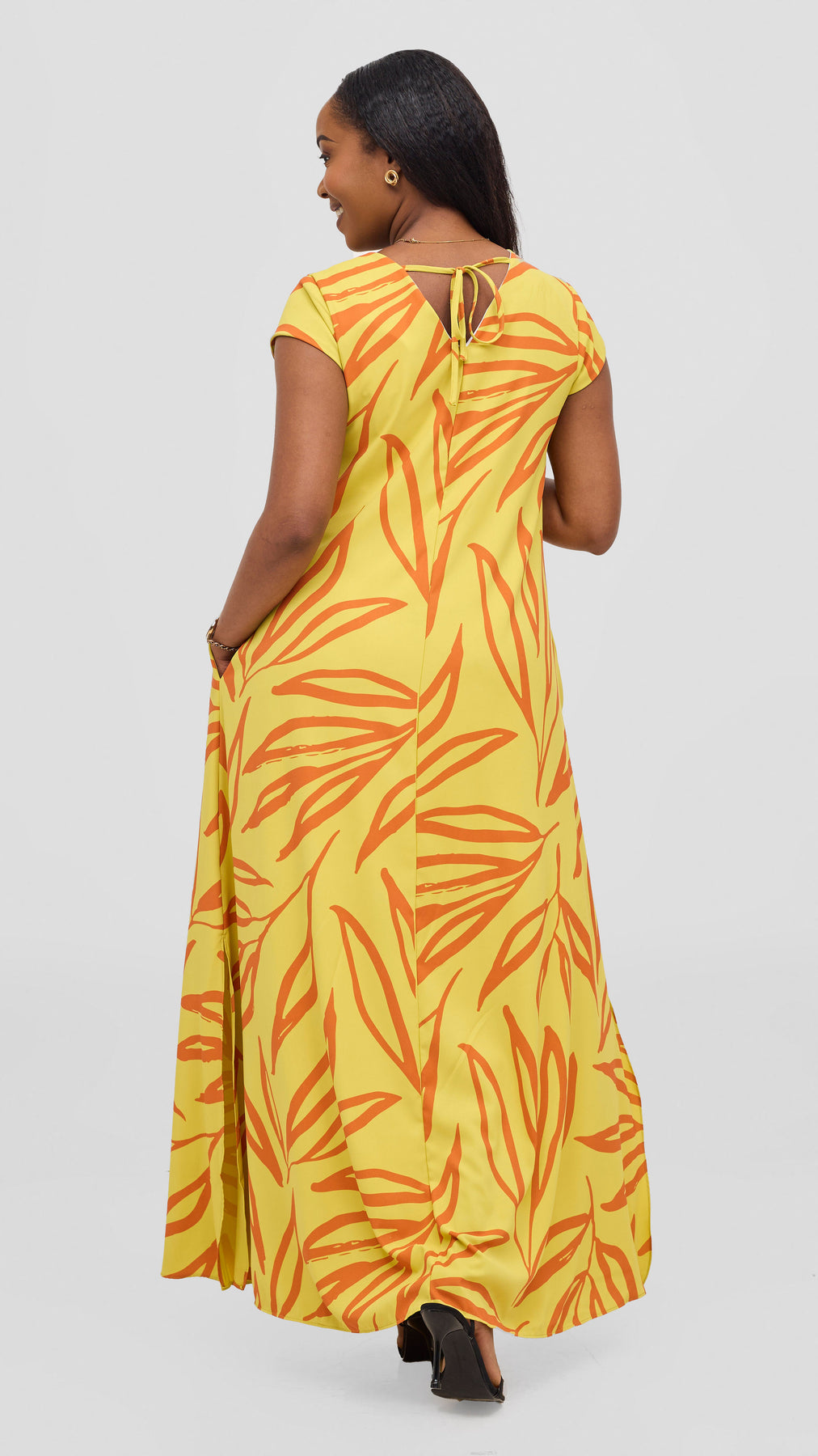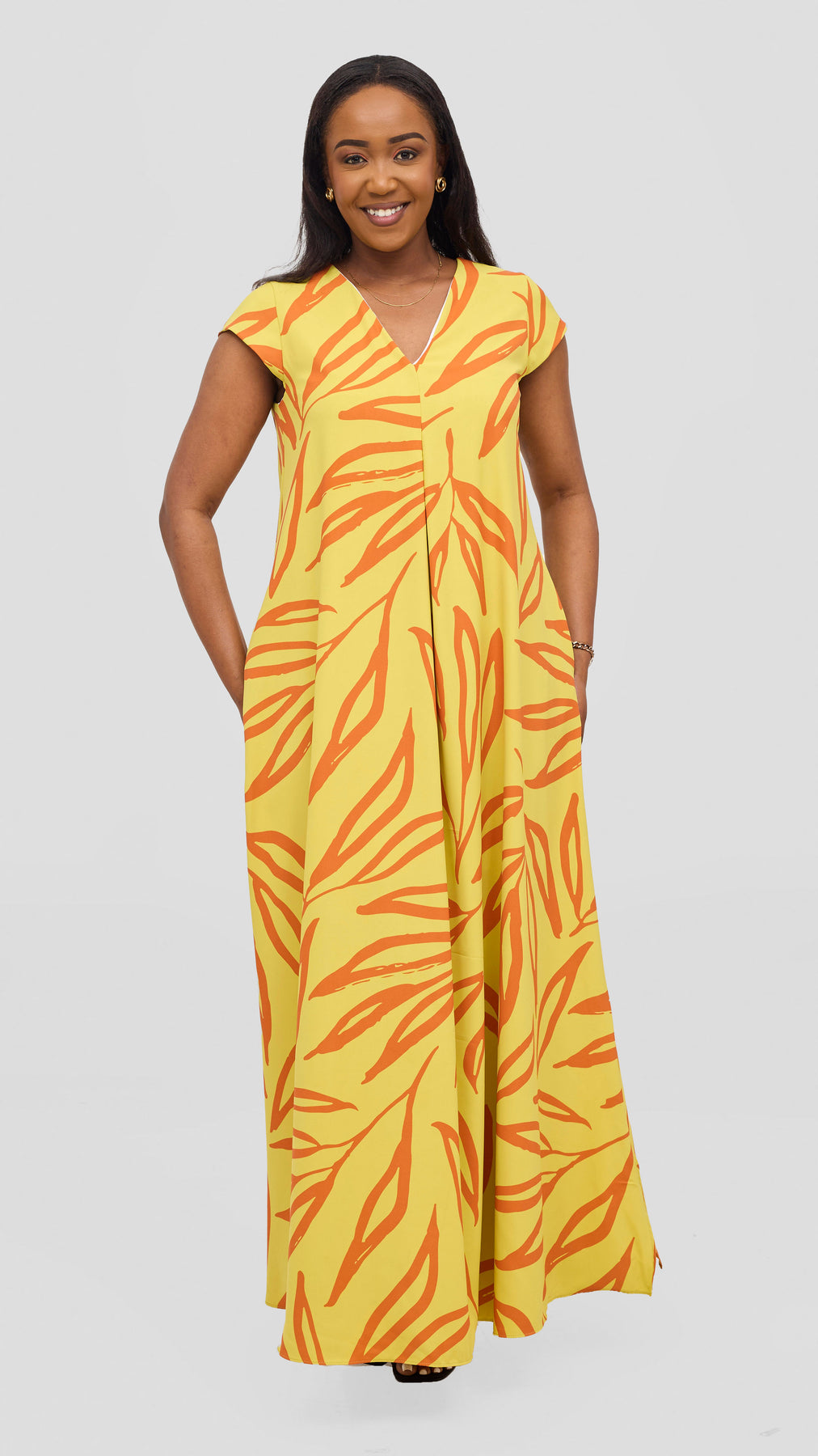 This Vivo Kani cap sleeve maxi dress features a striking lime and orange sari print, combining traditional patterns with modern style. Designed with a flattering V-neck and practical pockets, it offers both elegance and convenience. The lightweight fabric and cap sleeves make it ideal for warm weather, ensuring comfort throughout the day. Perfect for casual outings or special occasions, this dress balances cultural charm with contemporary fashion.