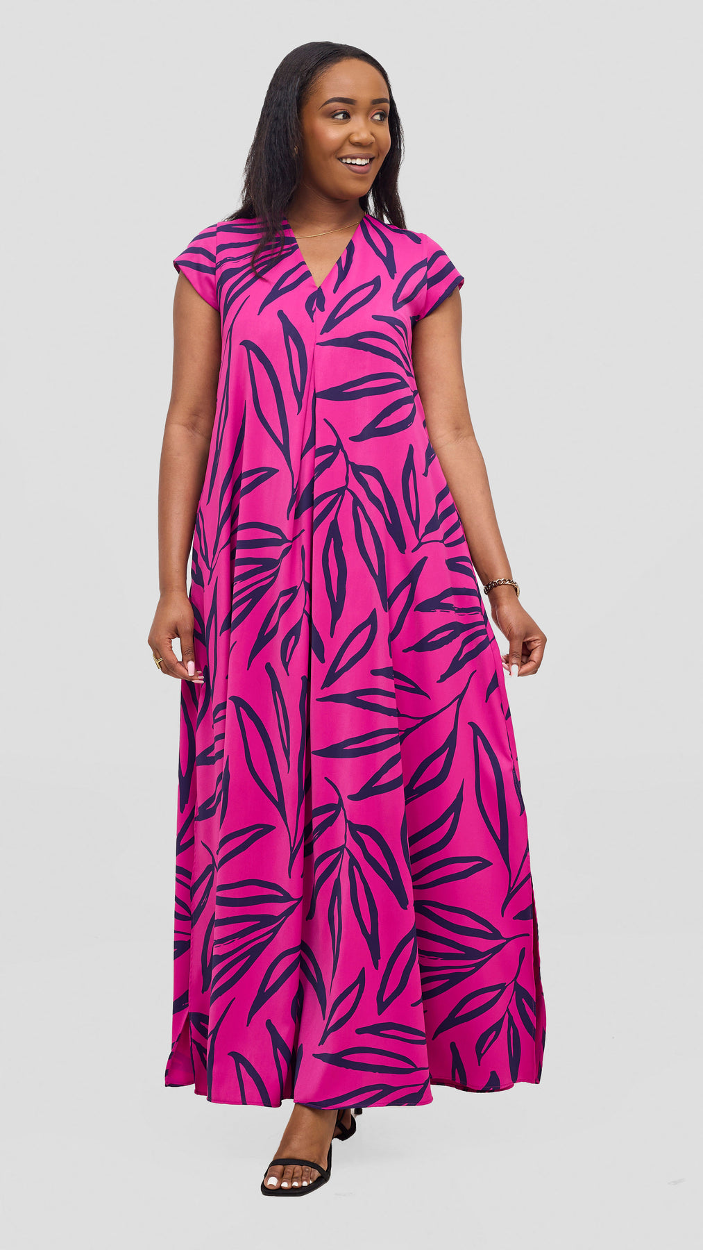 This Vivo Kani cap sleeve maxi dress features a striking magenta and navy sari print, combining traditional patterns with modern style. Designed with a flattering V-neck and practical pockets, it offers both elegance and convenience. The lightweight fabric and cap sleeves make it ideal for warm weather, ensuring comfort throughout the day. Perfect for casual outings or special occasions, this dress balances cultural charm with contemporary fashion.