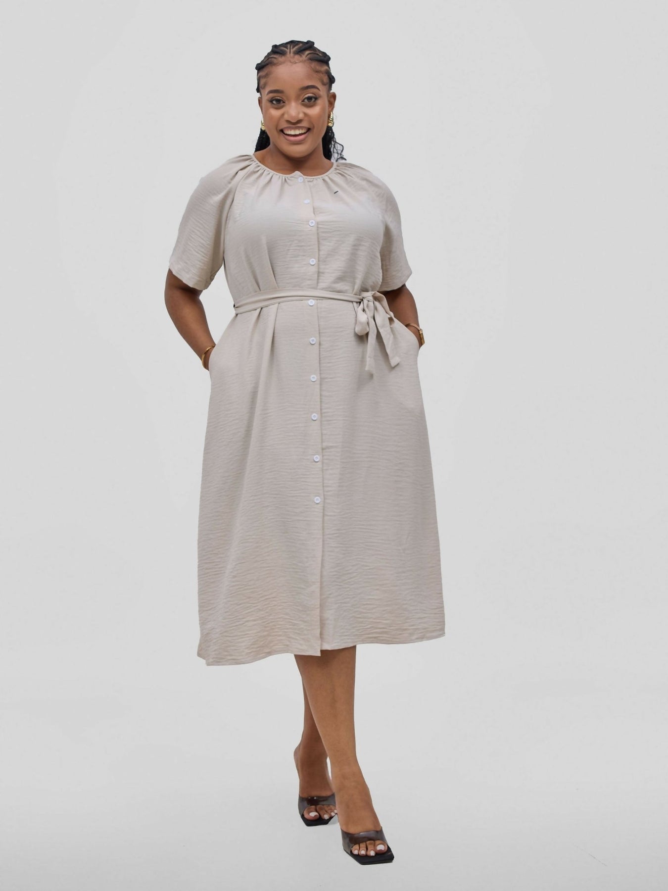 Hessed Long Buttoned Short Sleeve Dresses - Cream White