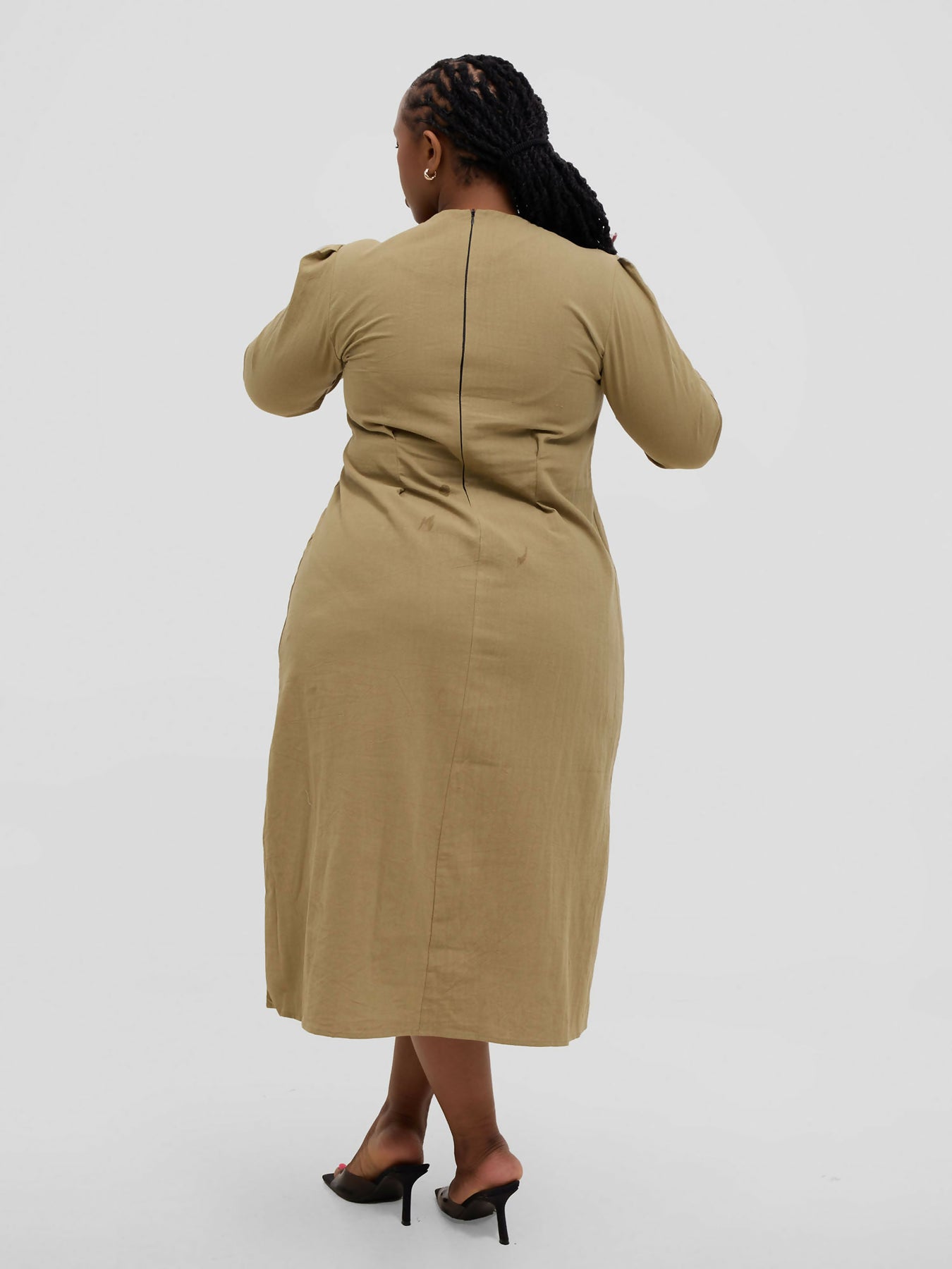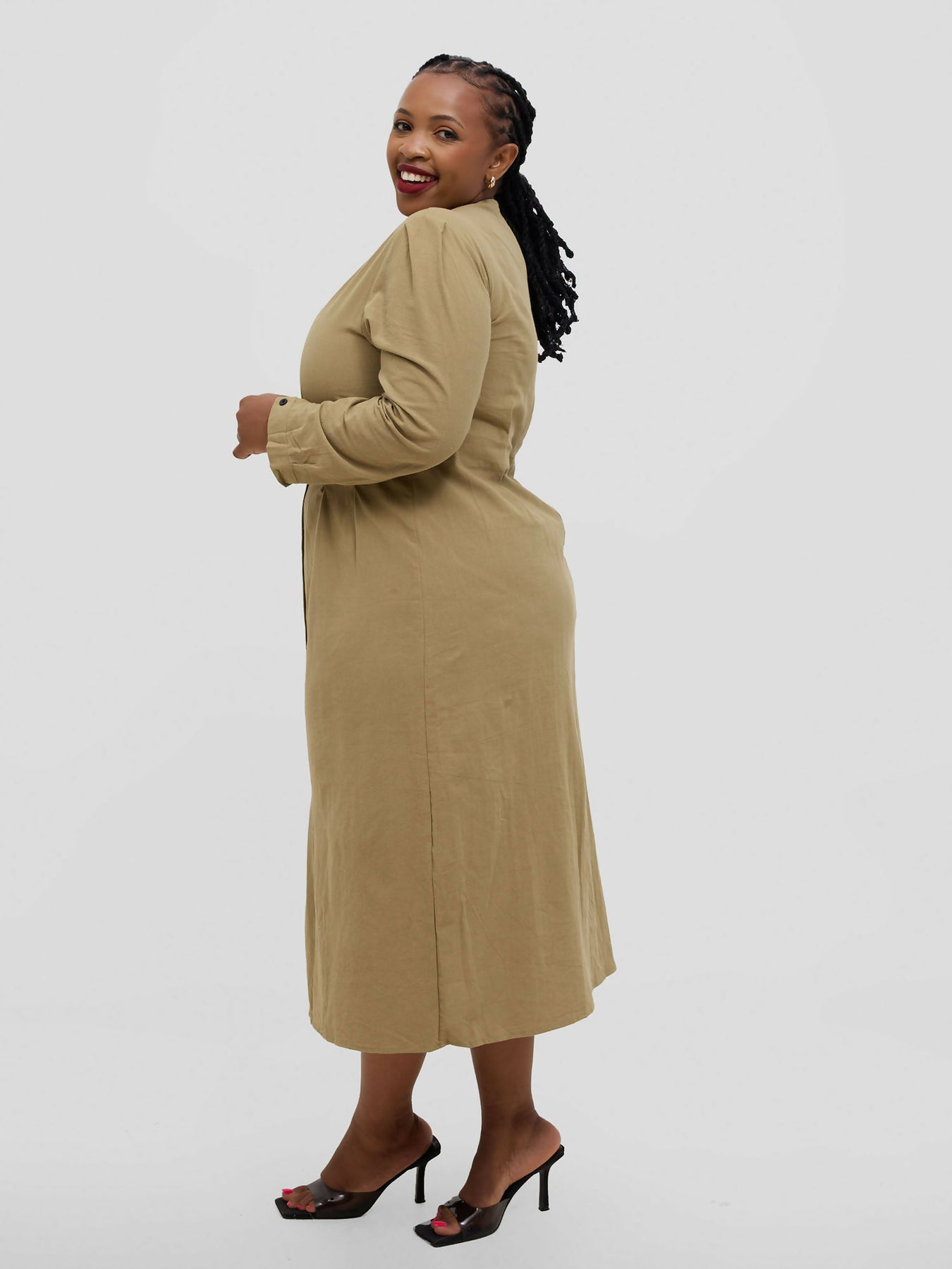 Hessed Long Sleeved Buttoned Dress - Khaki - Shopzetu