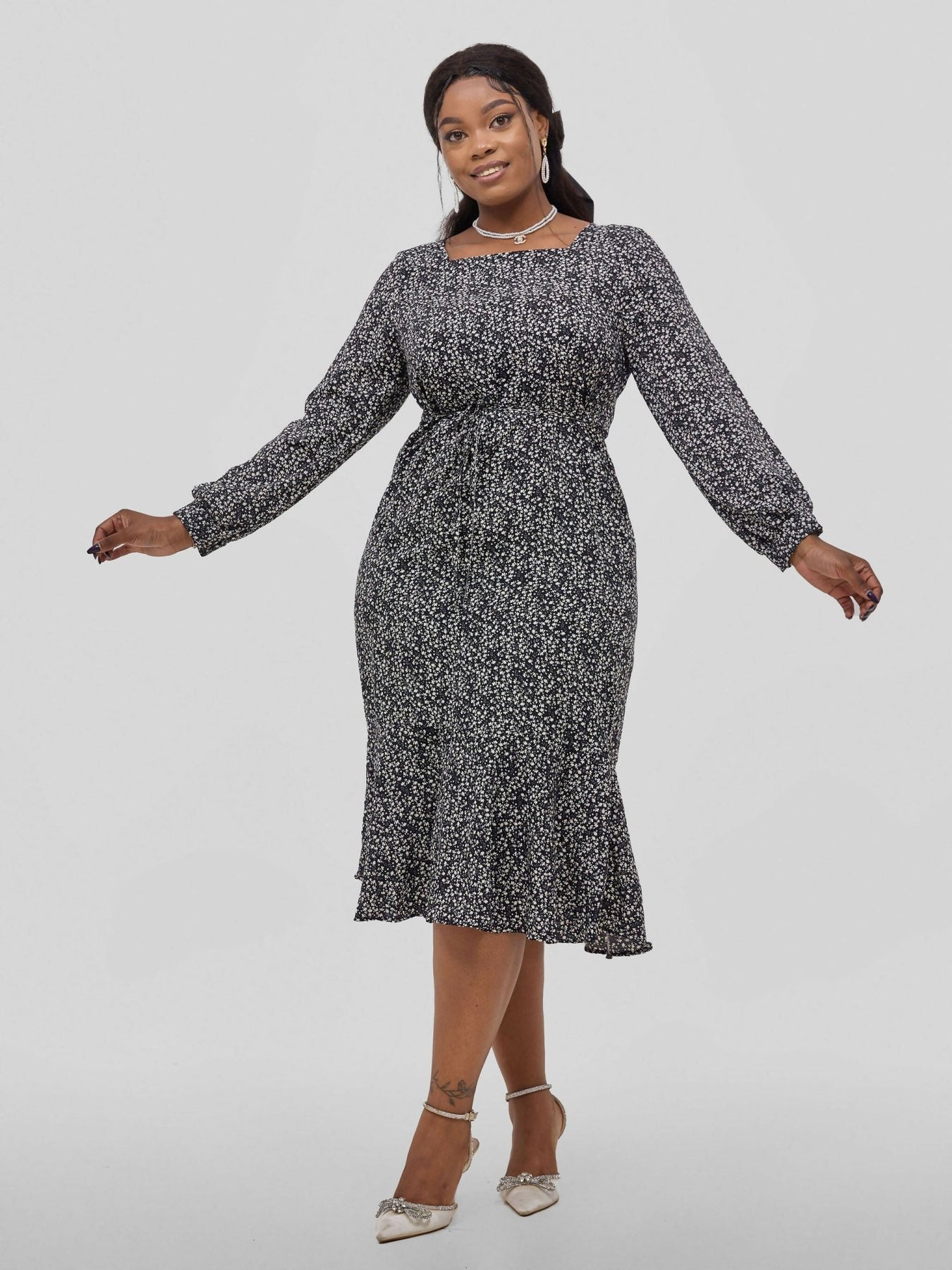 Hessed Square Neck Long Sleeves Floral Print Fit & Flare Dress - Black - Shopzetu