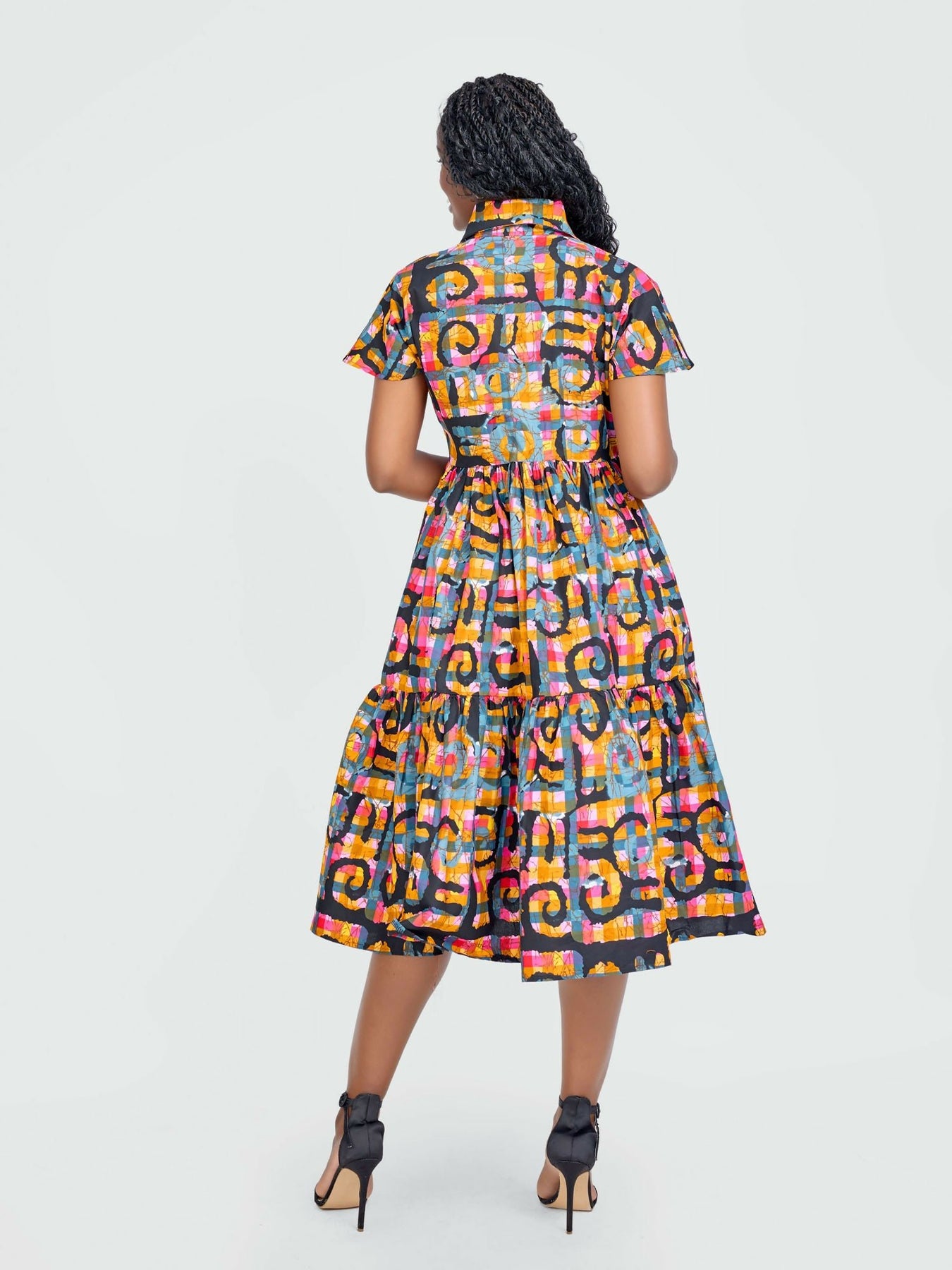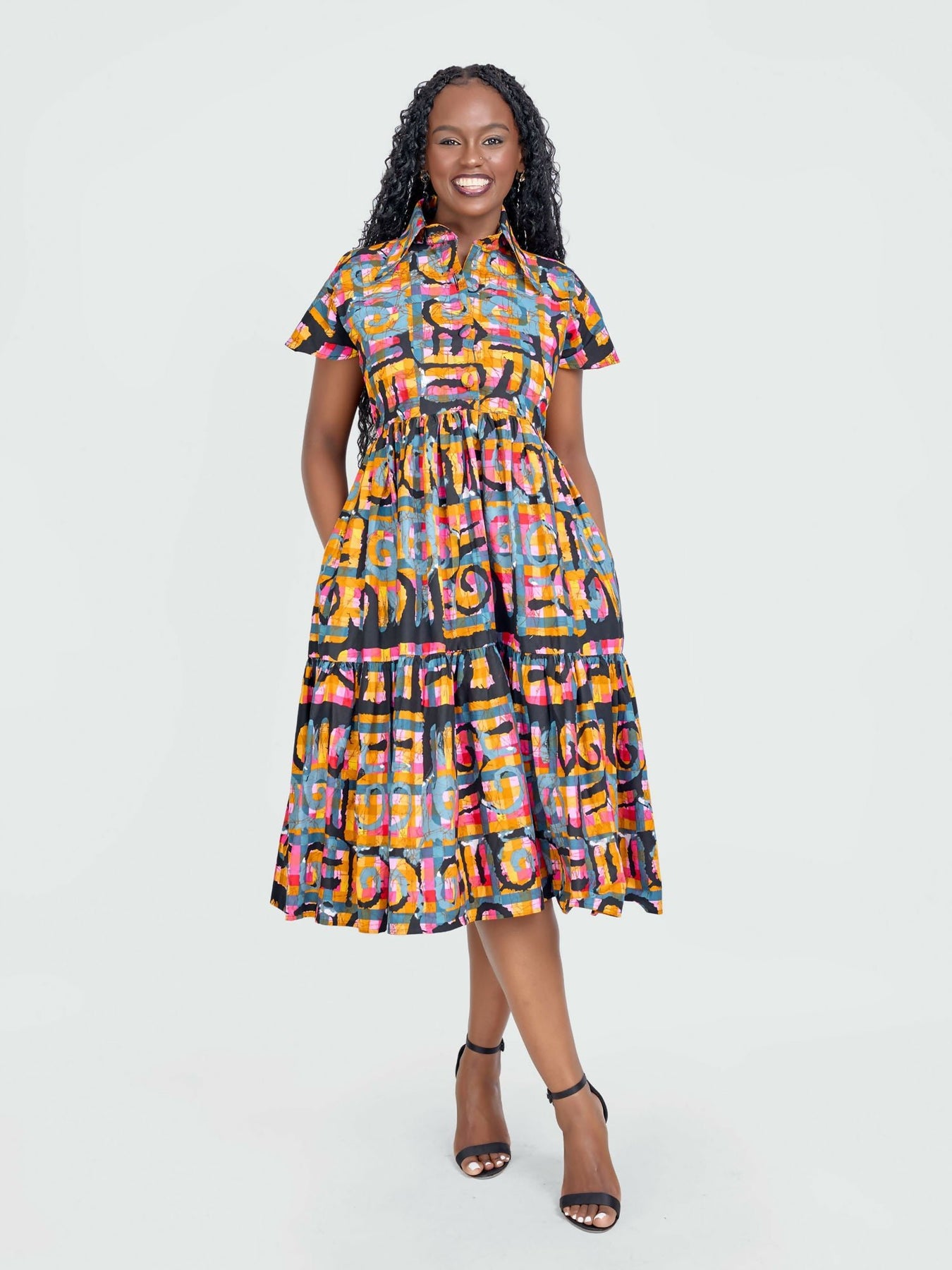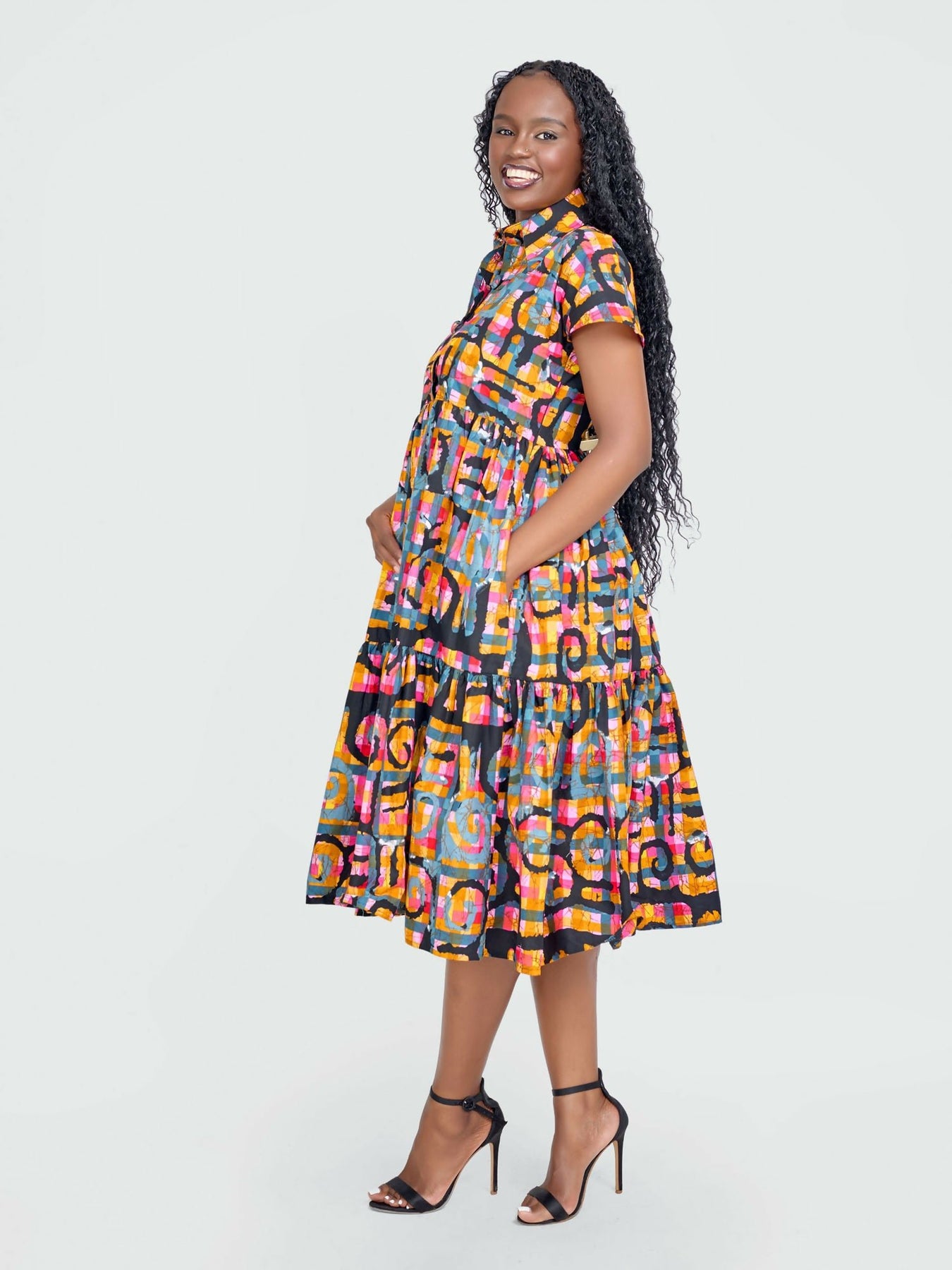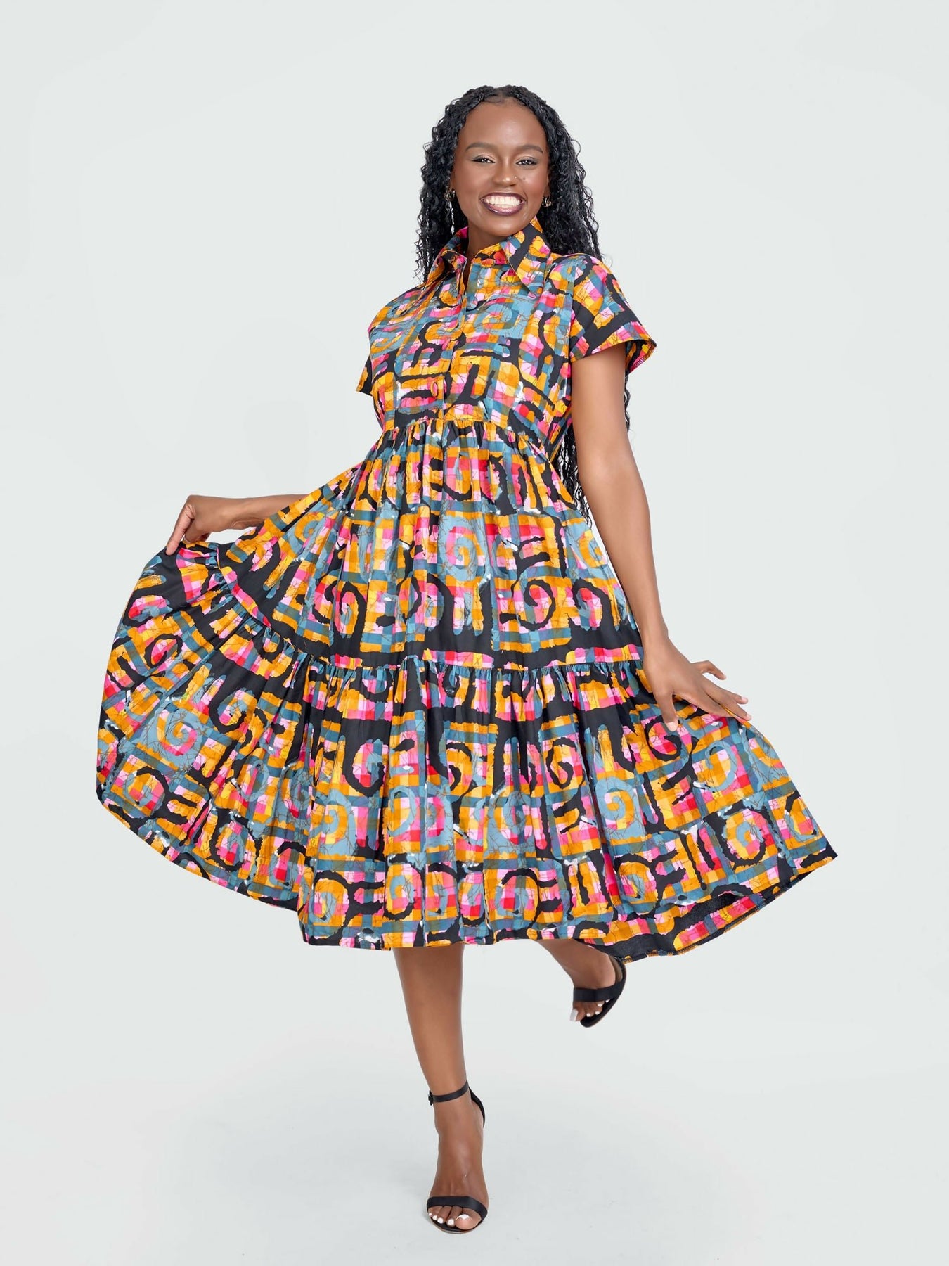 Product Details: This midi dress features gathered layers for a unique, flattering silhouette. It's versatile and comfortable with buttons down to below the bust that adds a touch of elegance.