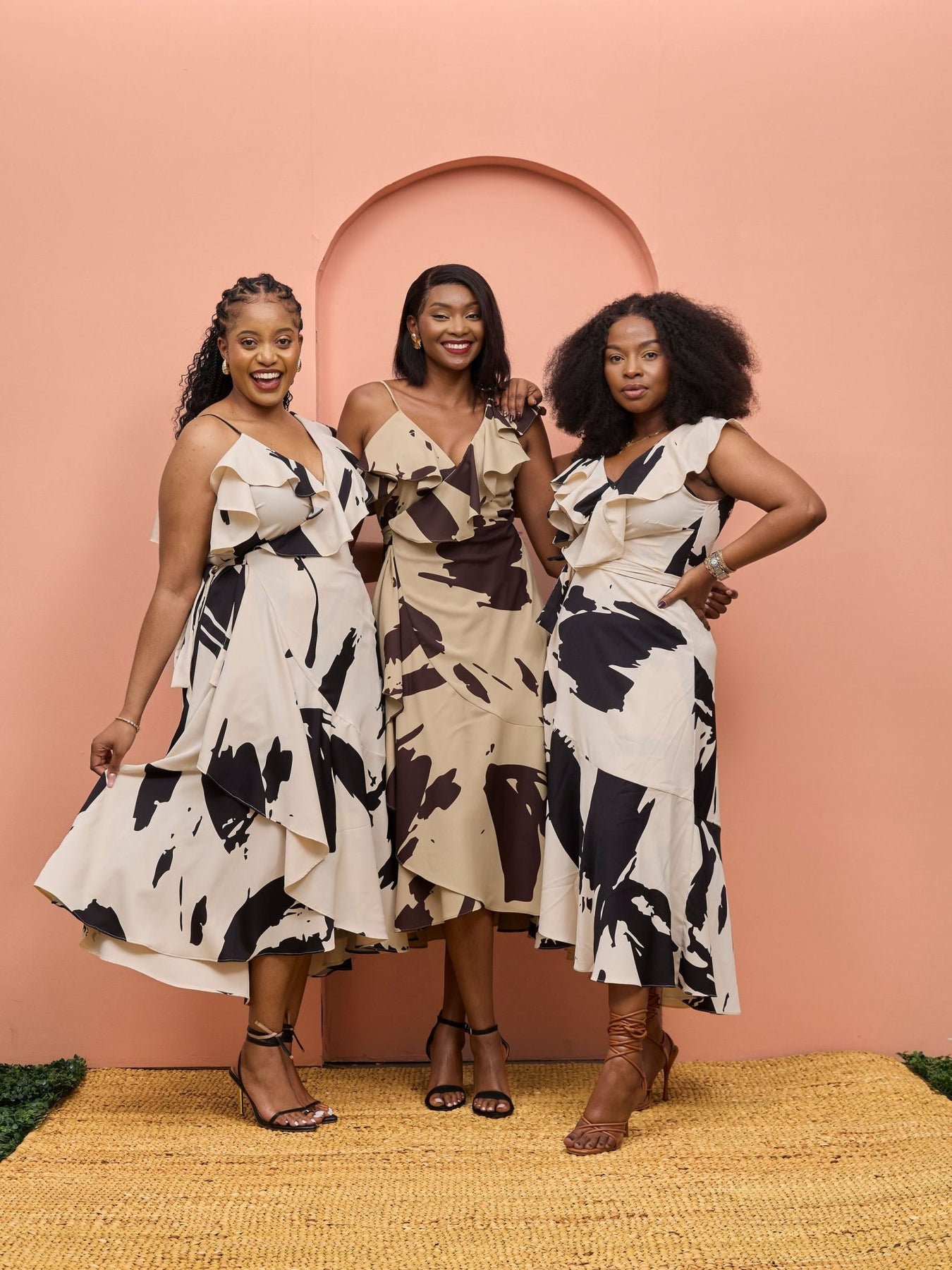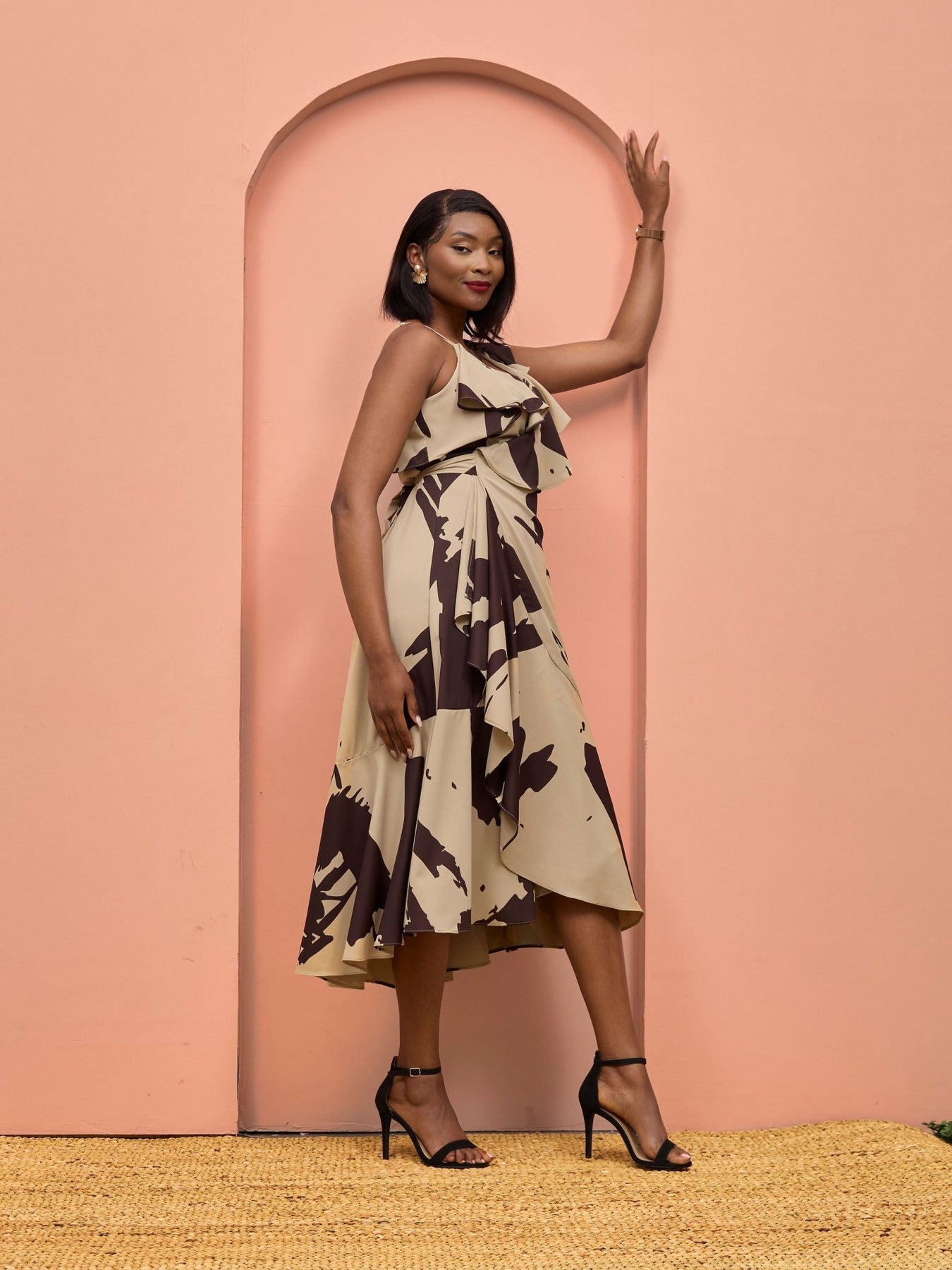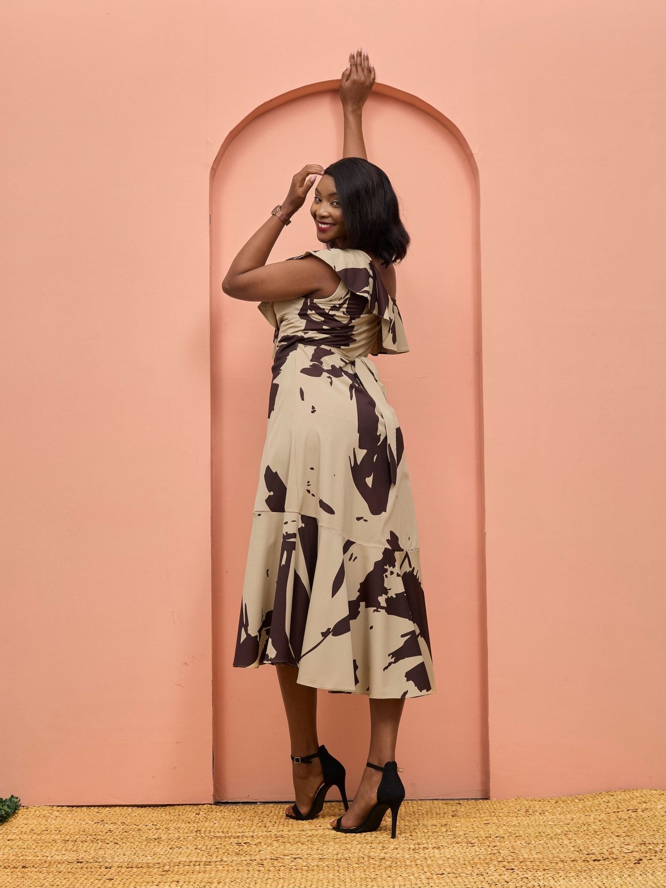 Vivo Beali Wrap Asymmetrical Midi Dress - Taupe / Chocolate Lea Print - Shopzetu