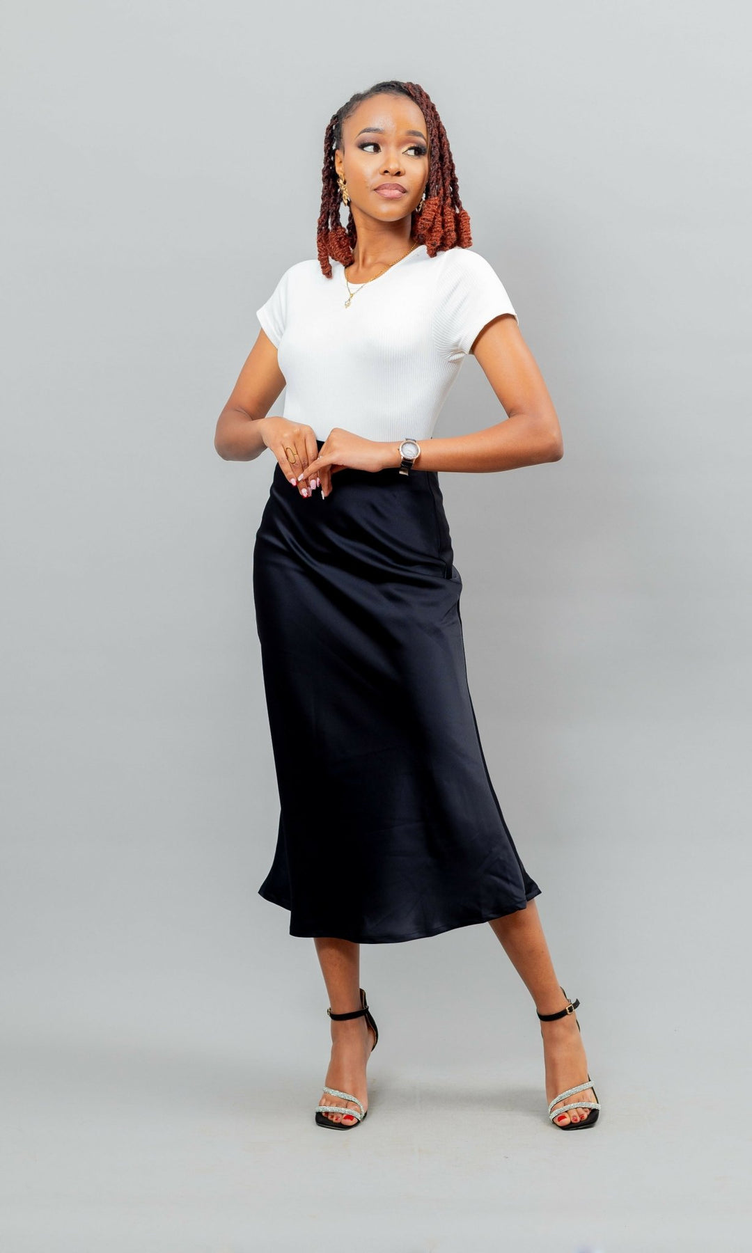 Turn heads in our stunning black silk midi skirt. This eye-catching skirt features a sleek, body-skimming silhouette that falls gracefully below the knee, offering both class and allure.