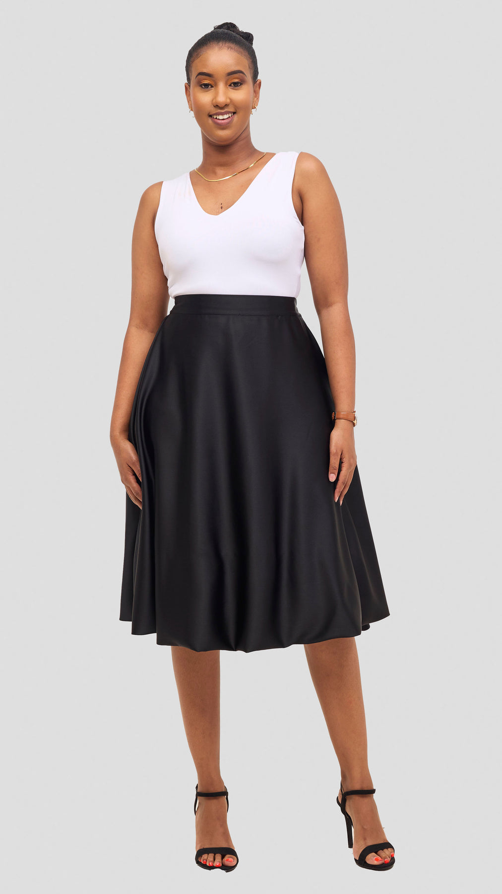 The Vivo Iyana Bubble Midi Skirt in black Print offers a stylish blend of playful volume and vibrant colors. Its bubble design creates a flattering silhouette that moves beautifully, while the bold yellow and lilac tones bring a lively, fresh feel to your outfit. Ideal for making a confident statement, this skirt pairs effortlessly with both casual and dressy tops, adding charm and character to any wardrobe.