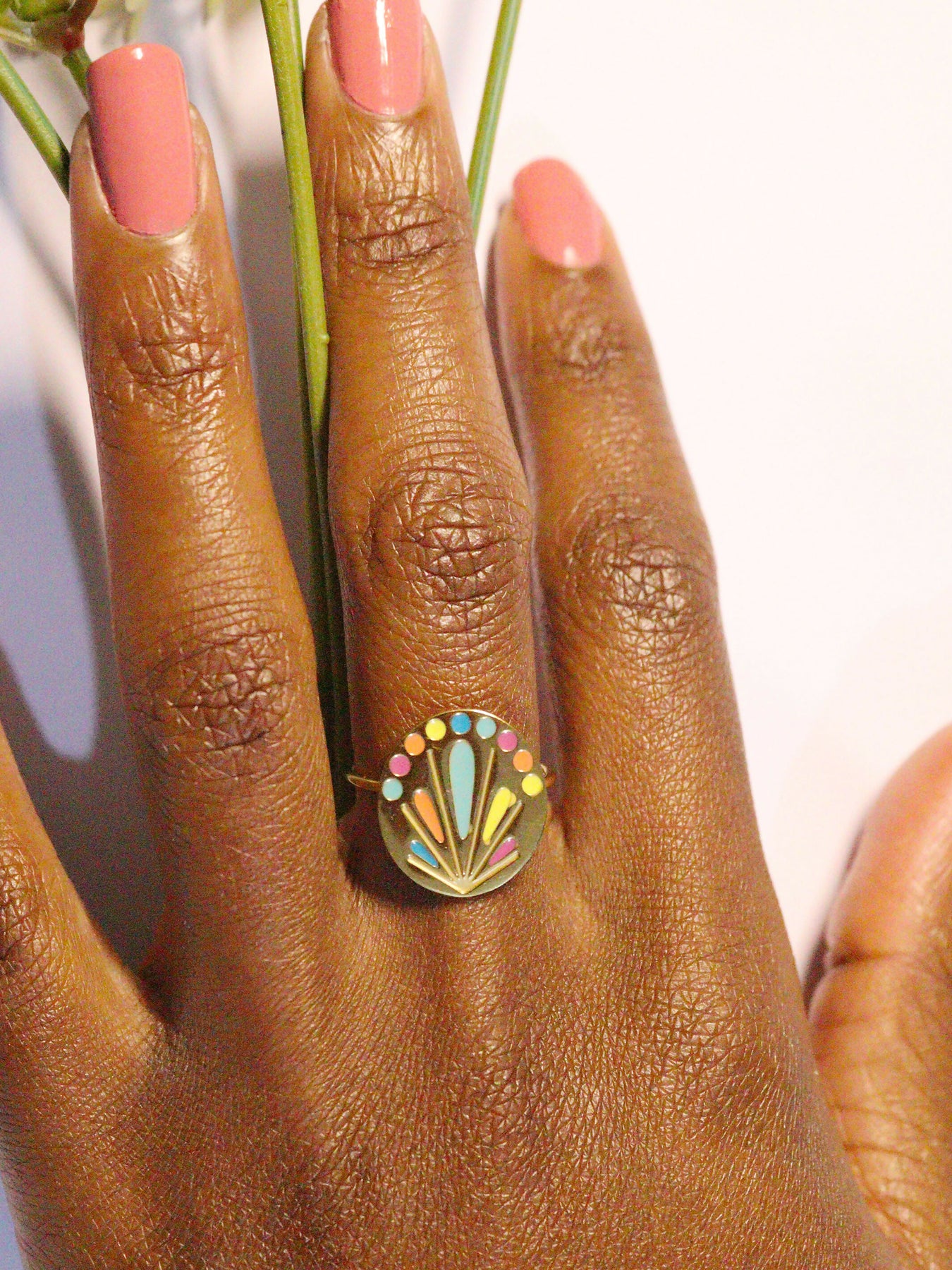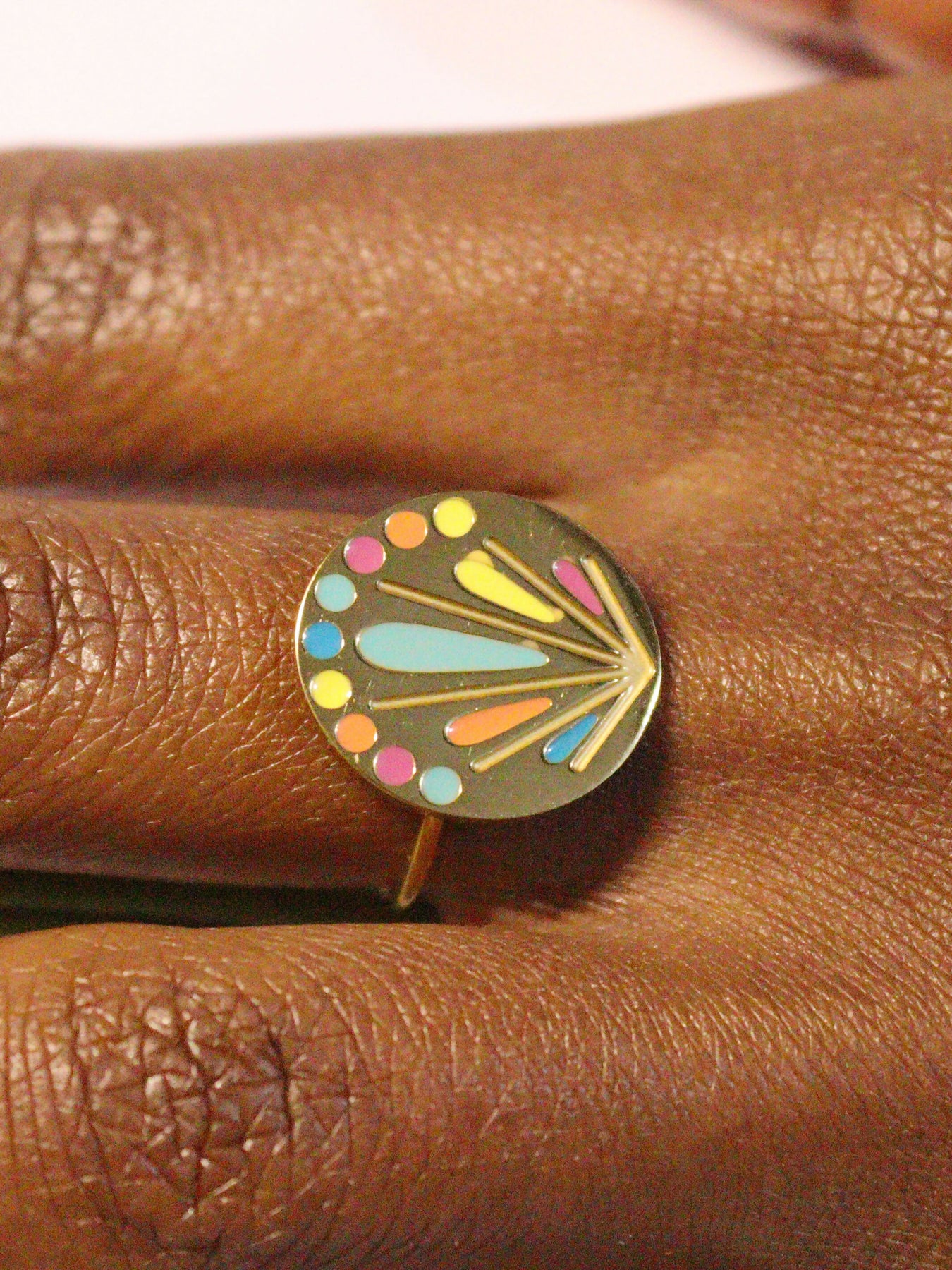 Featuring a bold circular disc with playful multicolor accents, this ring is designed to catch the eye and spark conversations. Lightweight yet striking, its ring band is 1mm yet sturdy designed to make the band seem invisible and the face of the ring to stand out.