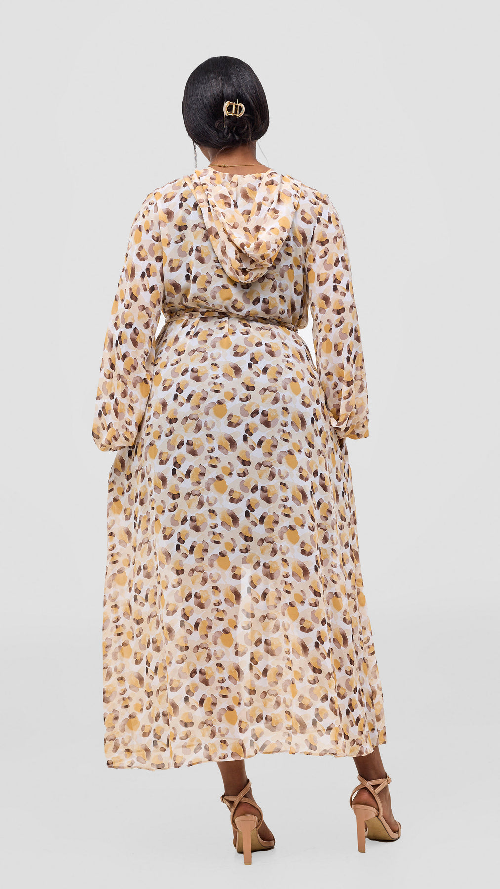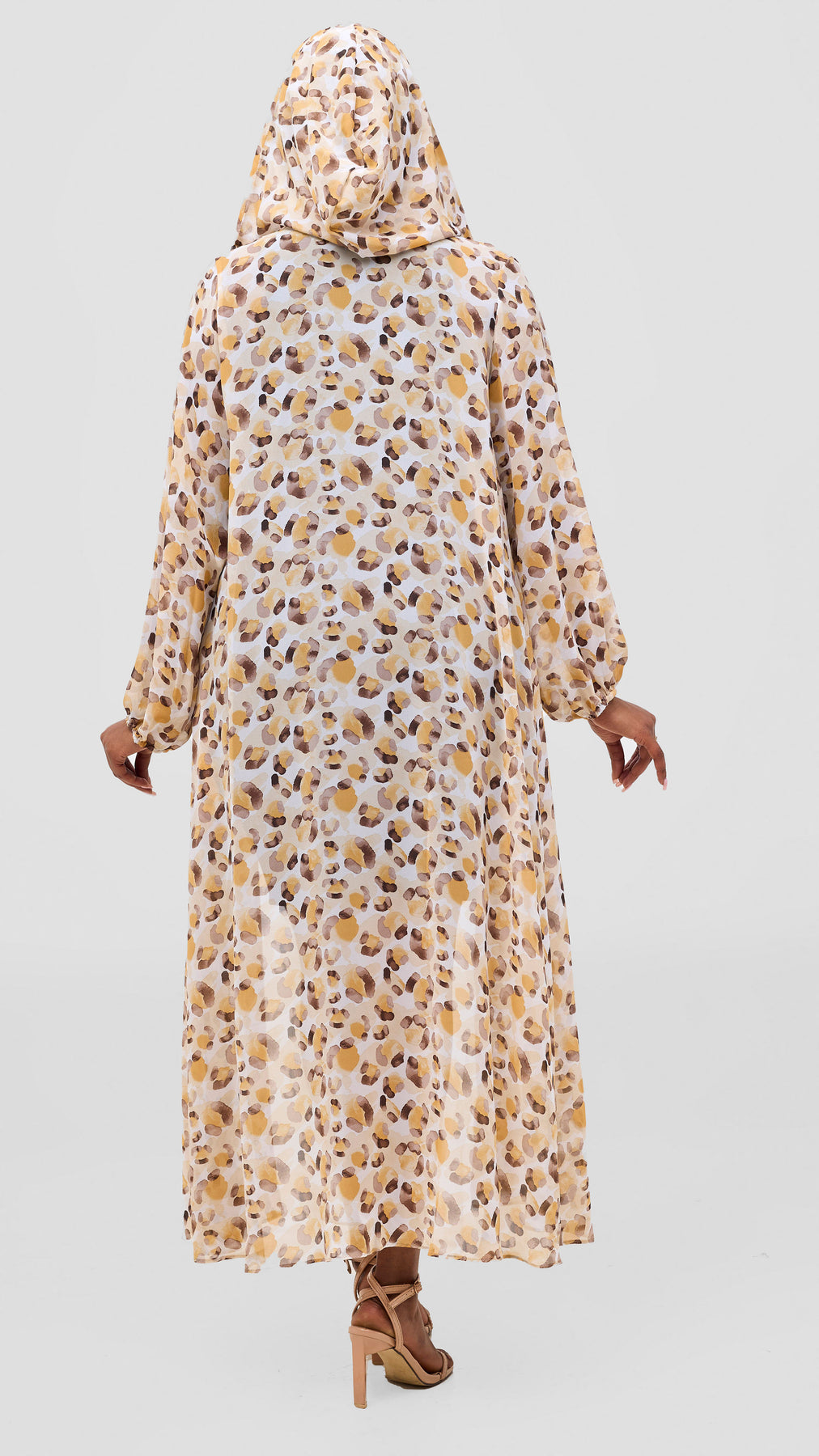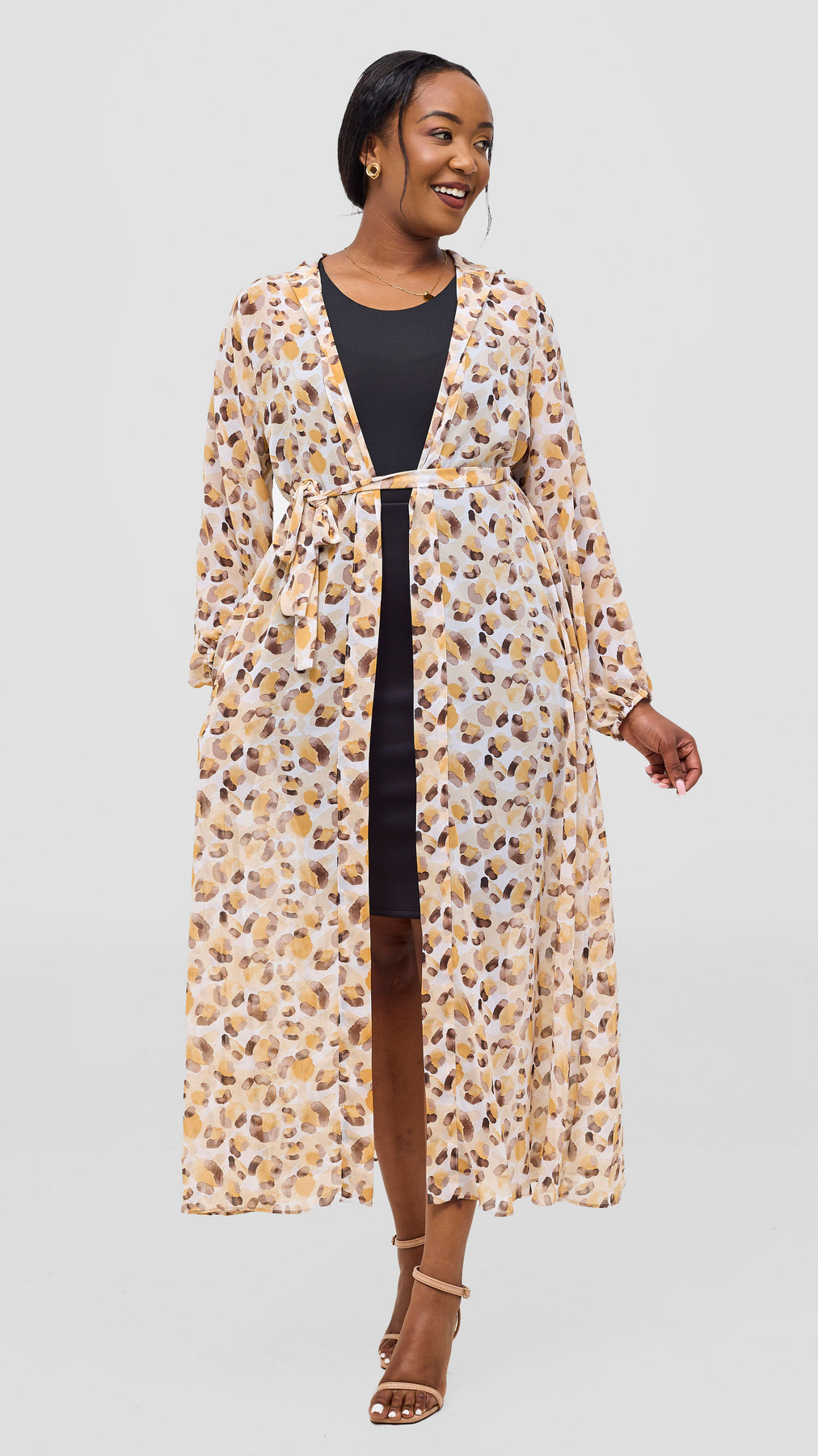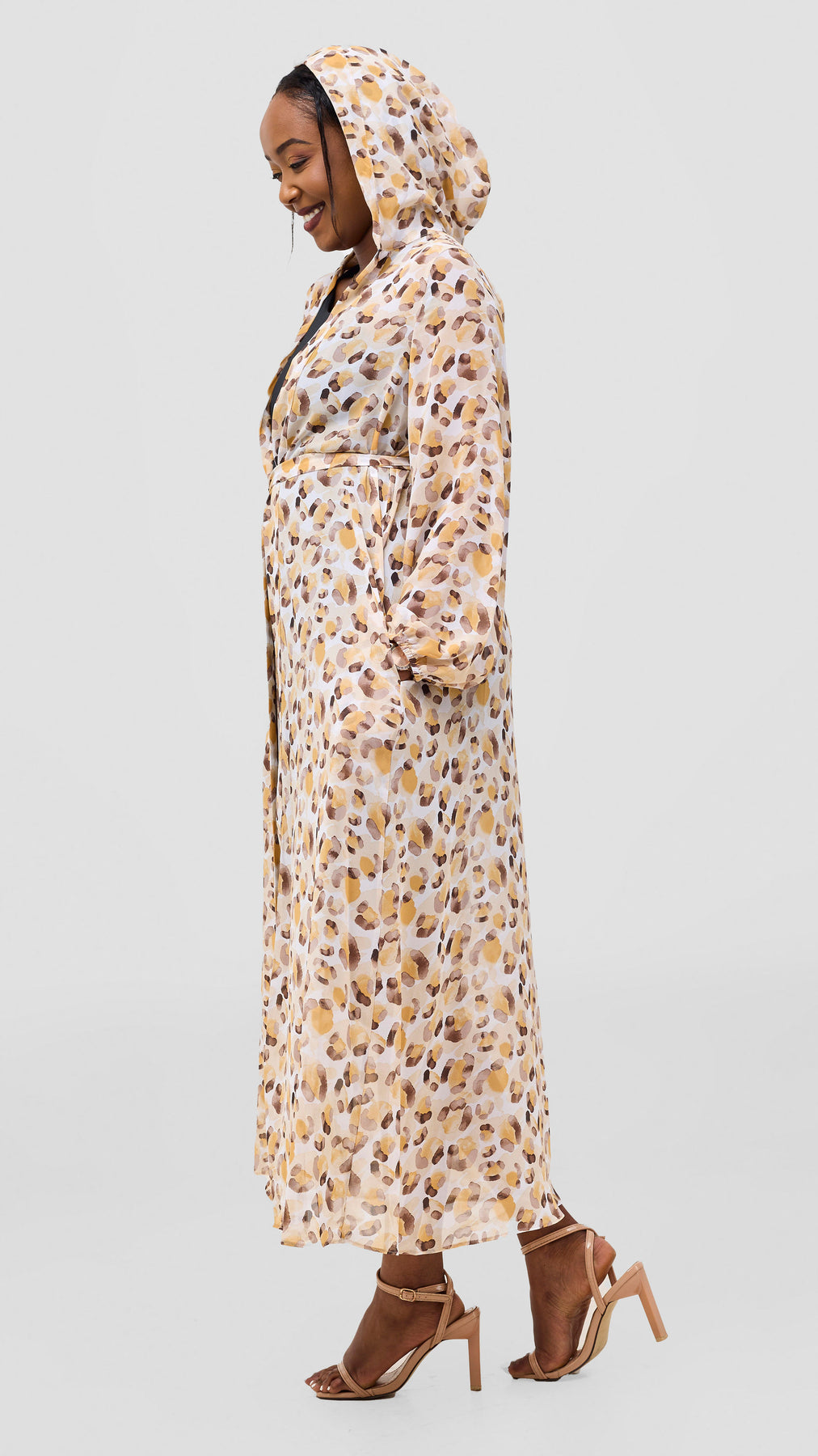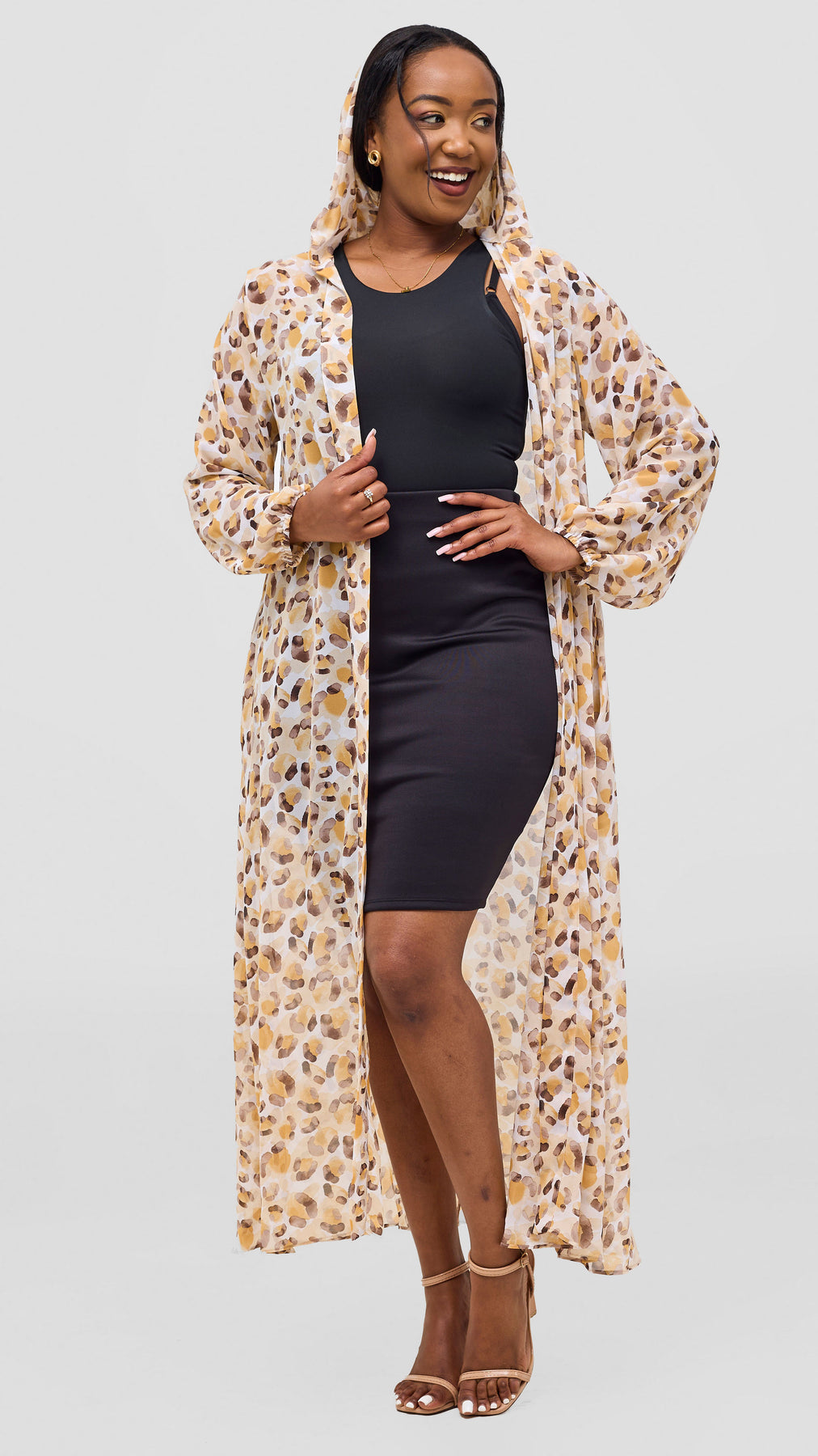 The Vivo Basic Hooded Kimono in white with brown print combines traditional style with modern comfort. Crafted for versatility, its lightweight fabric and hood provide both breathability and protection, making it ideal for layering in various settings. The striking red print adds a bold accent to the classic black base, offering a refined yet edgy look suitable for casual or statement wear.