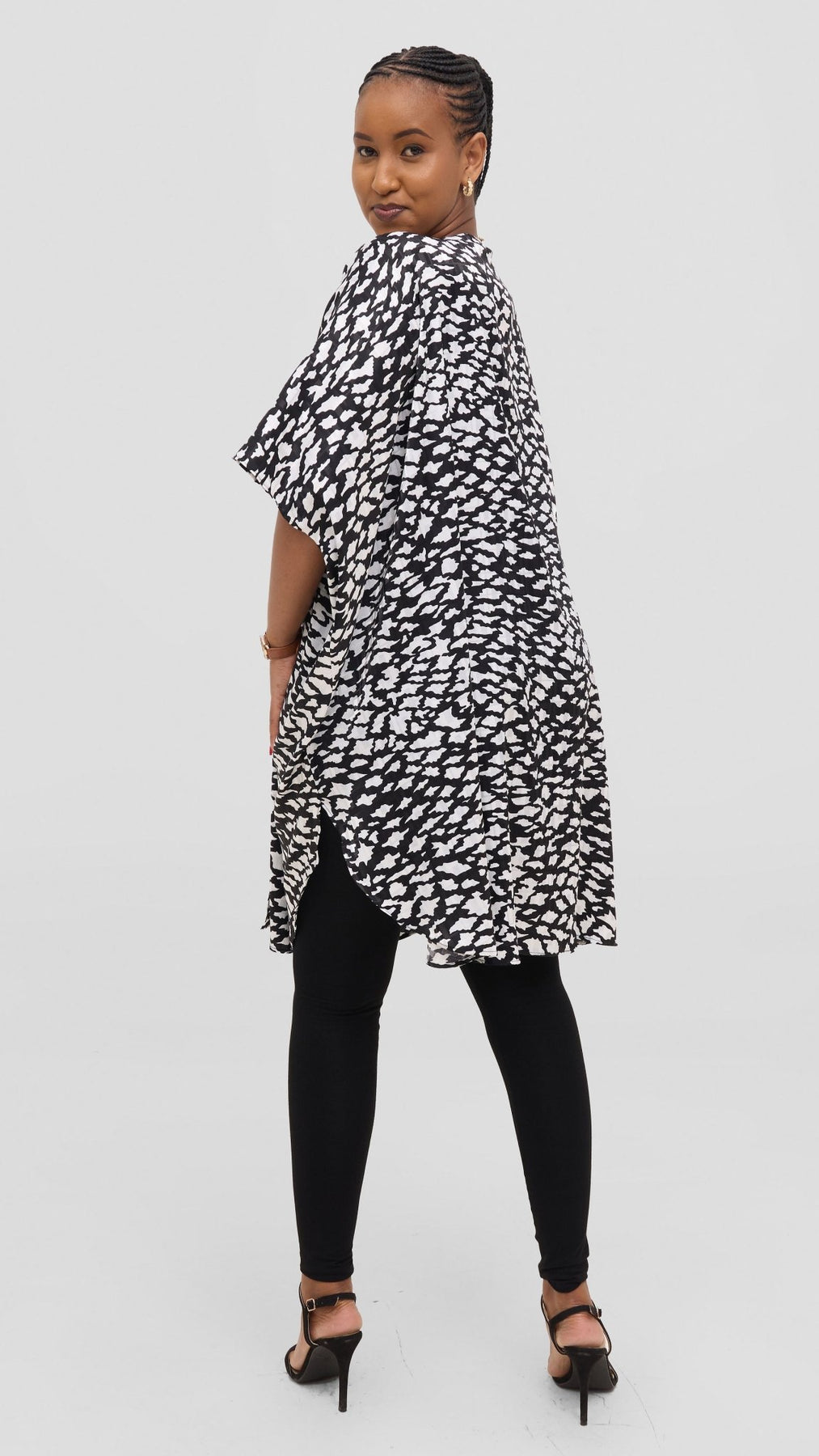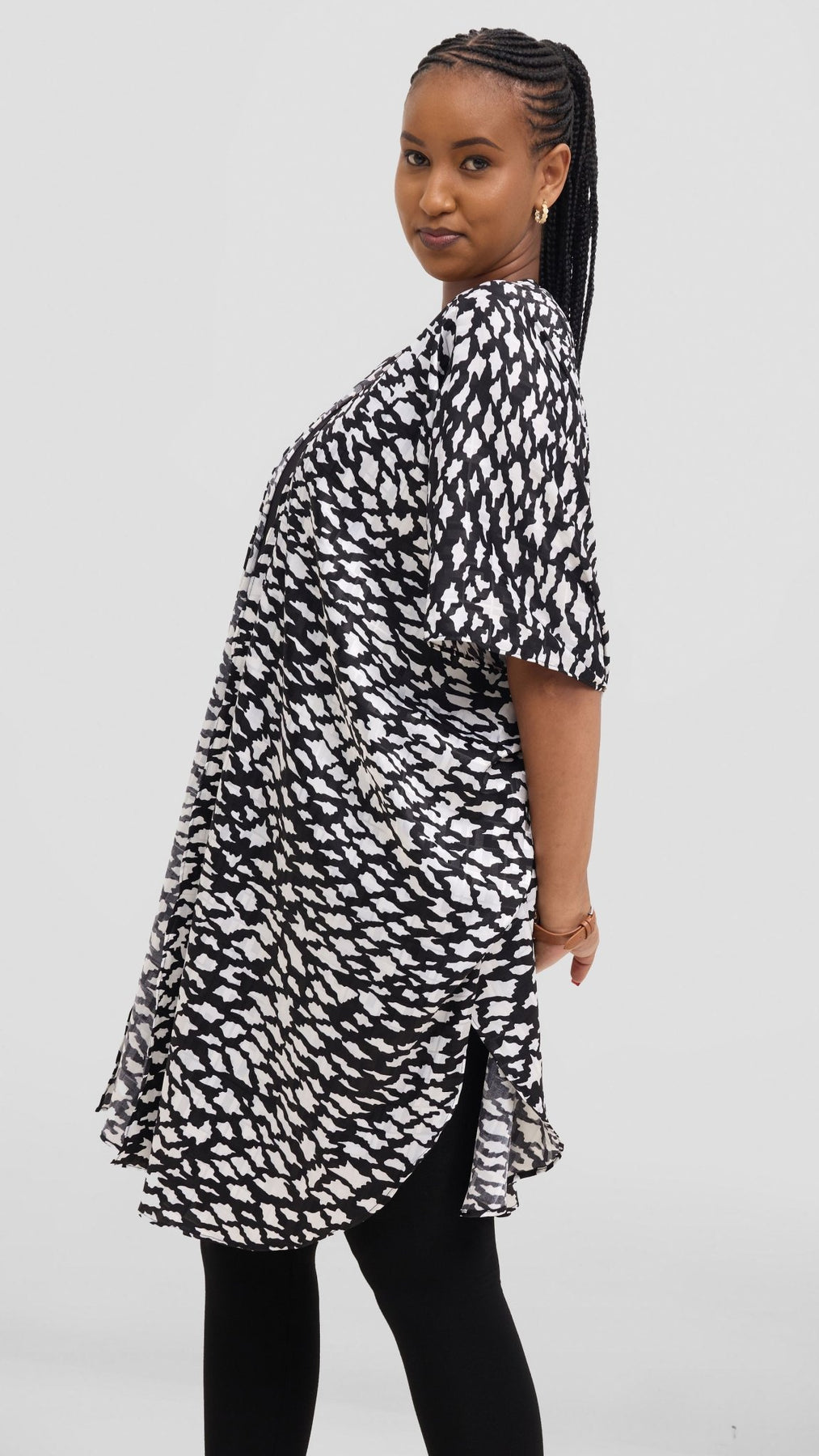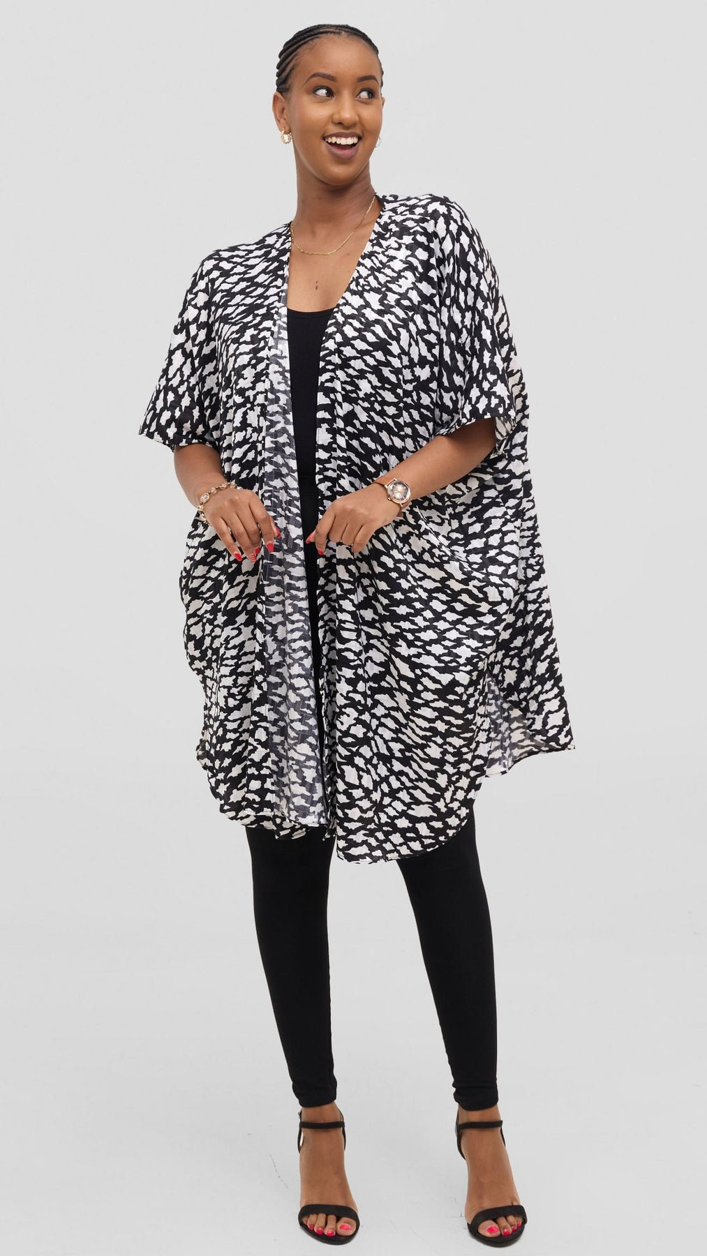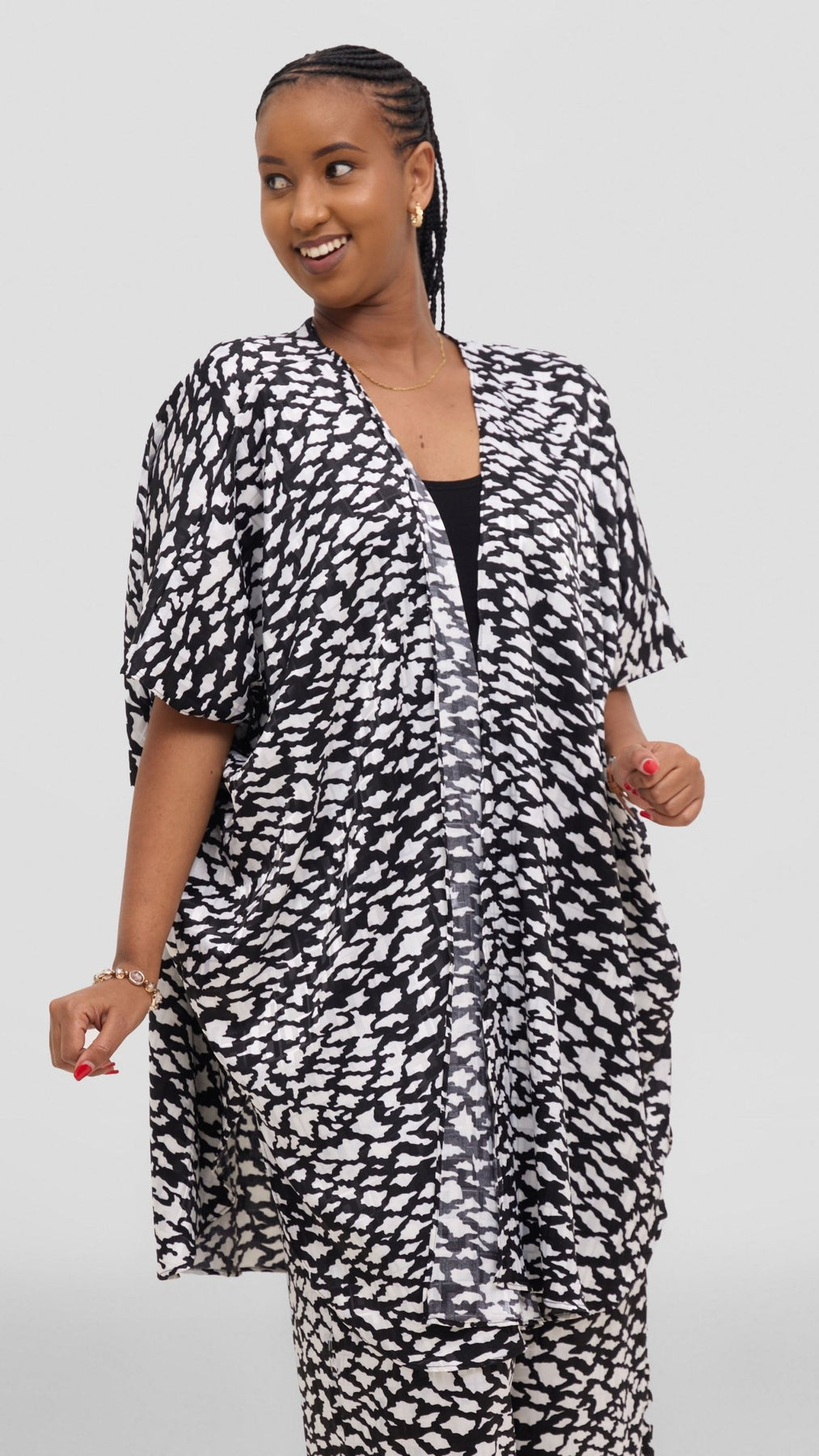 The Vivo Samira Wide Satin Kimono in white with black print offers versatile styling options. Wear it alone for a sleek, elegant look or pair it with the matching pants to create a coordinated ensemble. Its wide cut and smooth satin fabric make it ideal for layering over various outfits, adding both comfort and sophistication to your wardrobe.