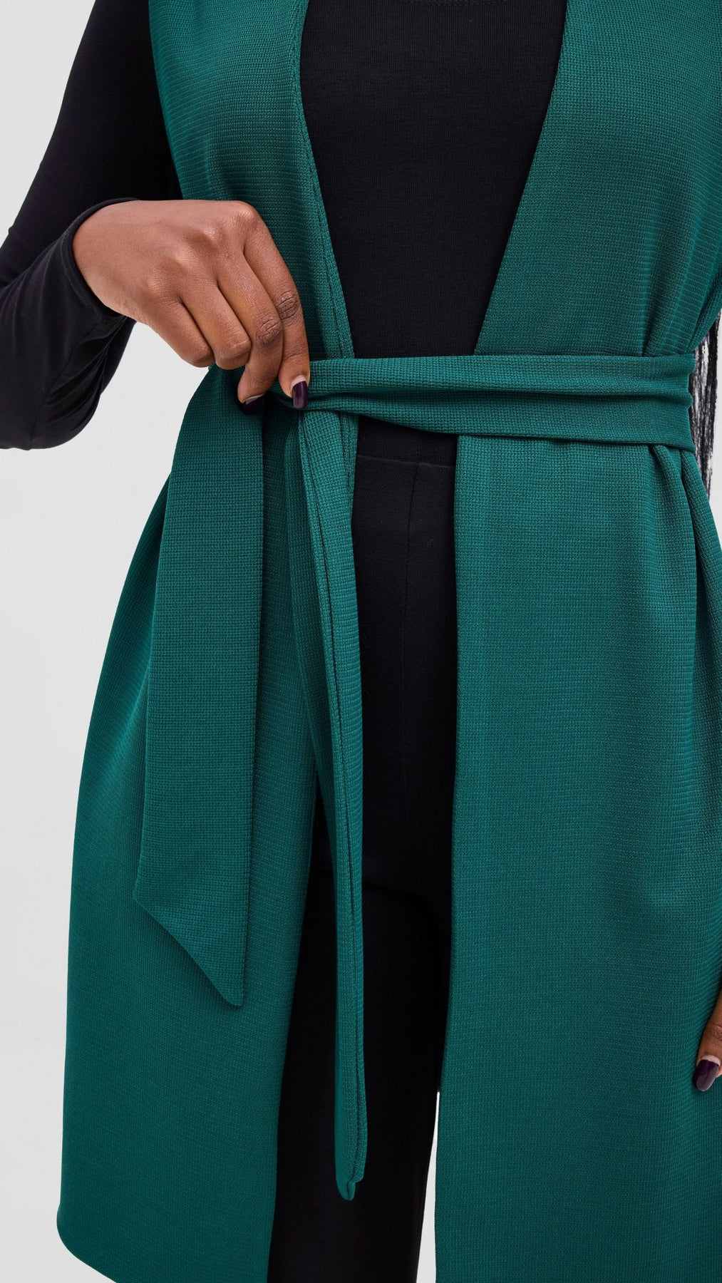 The Vivo Selah Double Layered Coat in dark green offers a sleek, sleeveless design with a belt to define your waist comfortably. Its versatile style makes it easy to dress up for special events or dress down for everyday wear, providing you with a flexible and stylish layering option. This coat is designed to support your fashion needs while keeping your look polished and effortless.