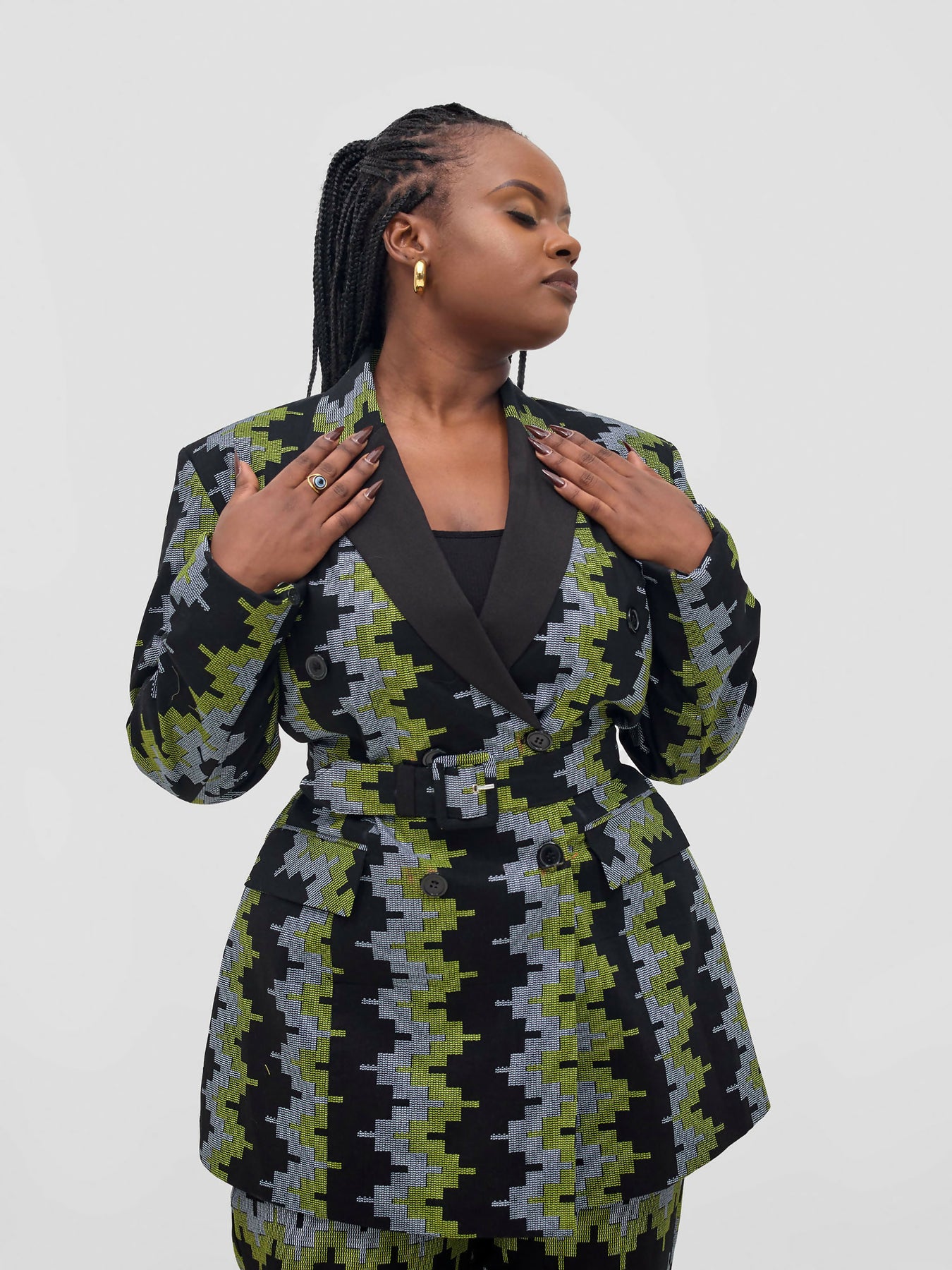 This stylish black and green Ankara pant suit is a perfect blend of elegance and versatility. The set includes a 32-inch-long blazer featuring a bold black lapel, double-breasted buttons, and functional pockets on both the jacket and the 42-inch-long pants. With a 34-inch waist, this suit offers a structured yet comfortable fit. The eye-catching geometric pattern in black and green, accented with gray, adds a modern touch to the traditional Ankara fabric. Ideal for both formal functions and casual occasions, it can be styled with heels for a power look or dressed down with sneakers for a relaxed yet sophisticated ensemble.