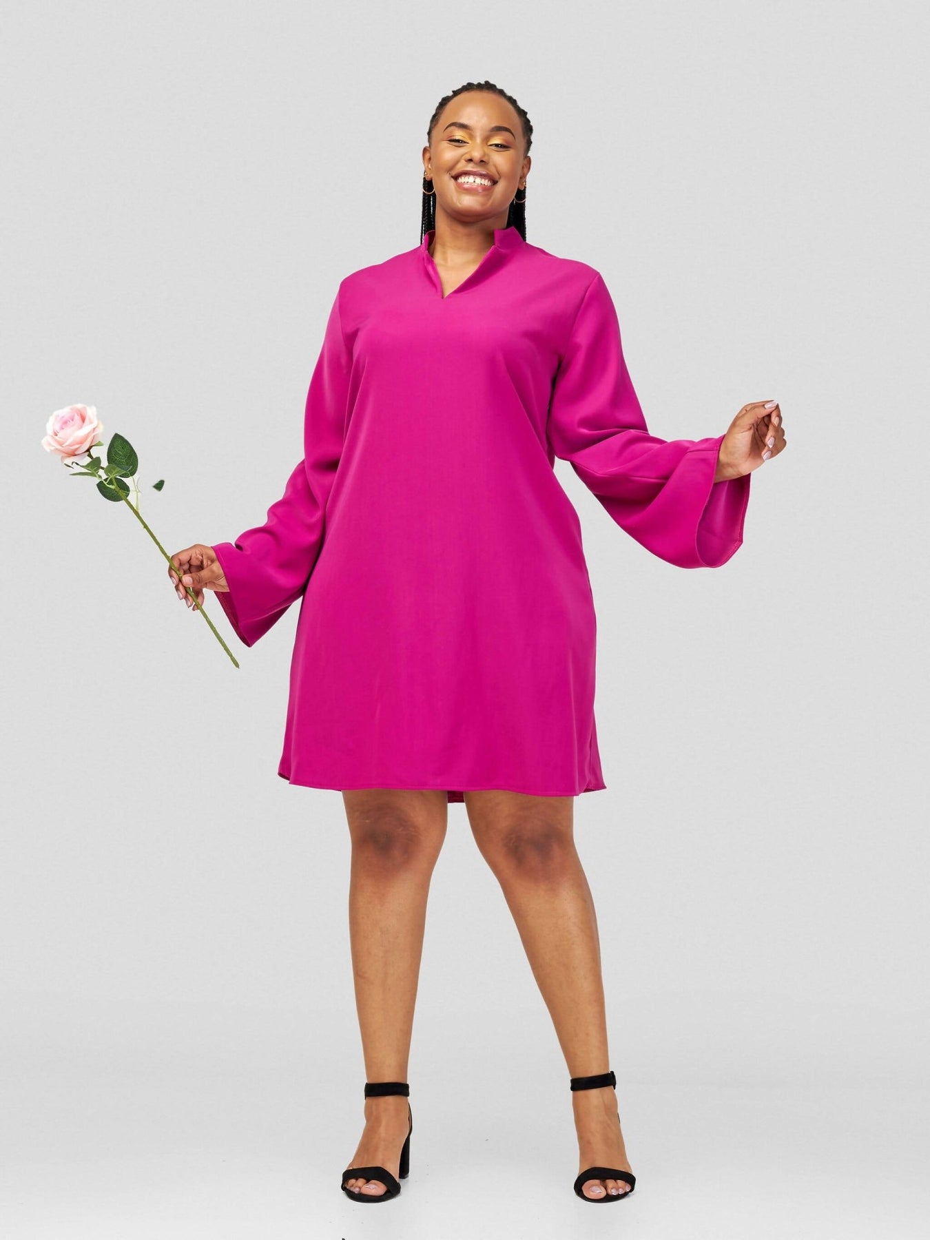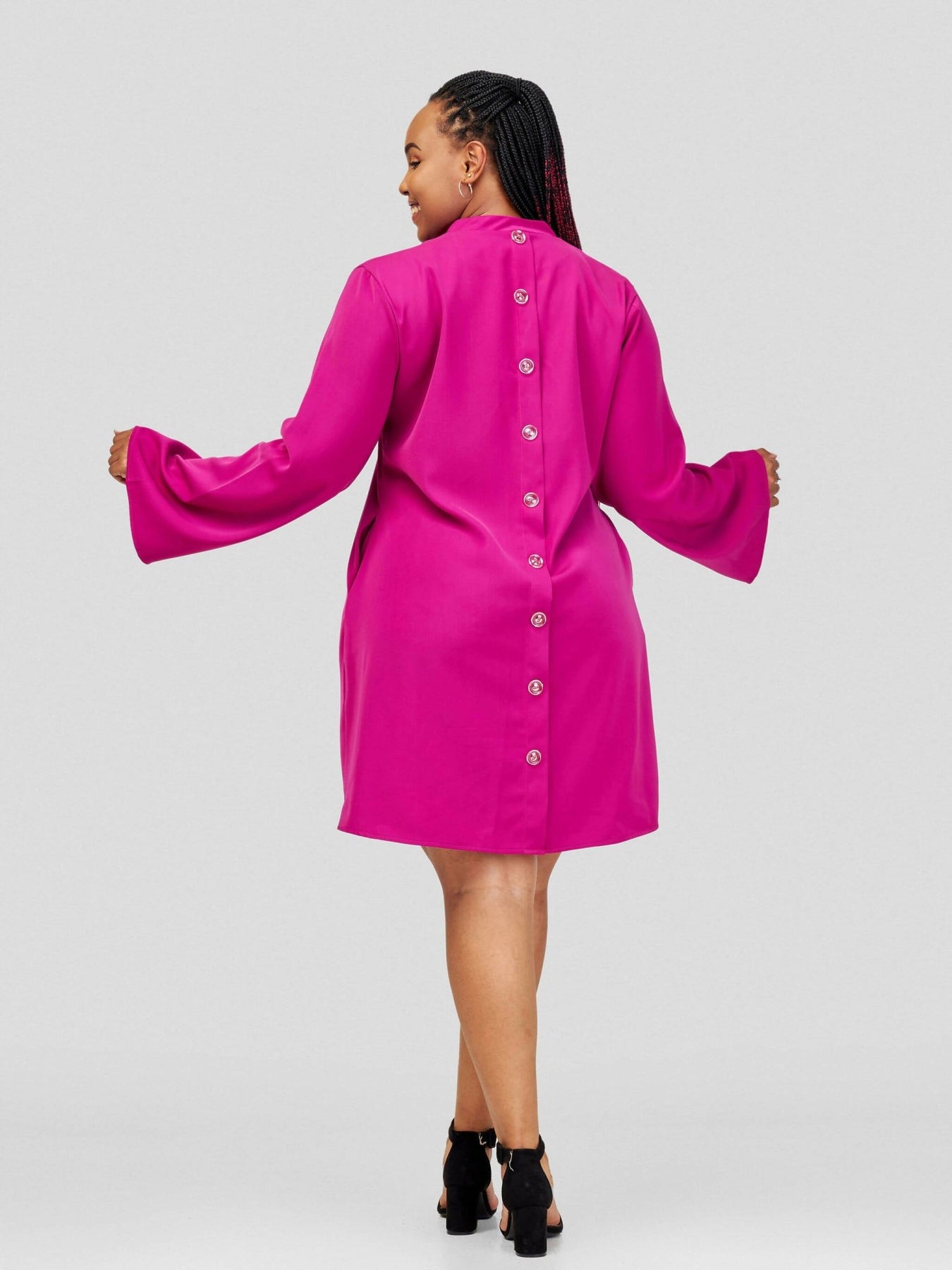 Azani Pink, this shift dress was designed for the woman who values comfort and simplicity. It has a Chinese collar, long sleeved with buttons at the back. The material is not stretchy.