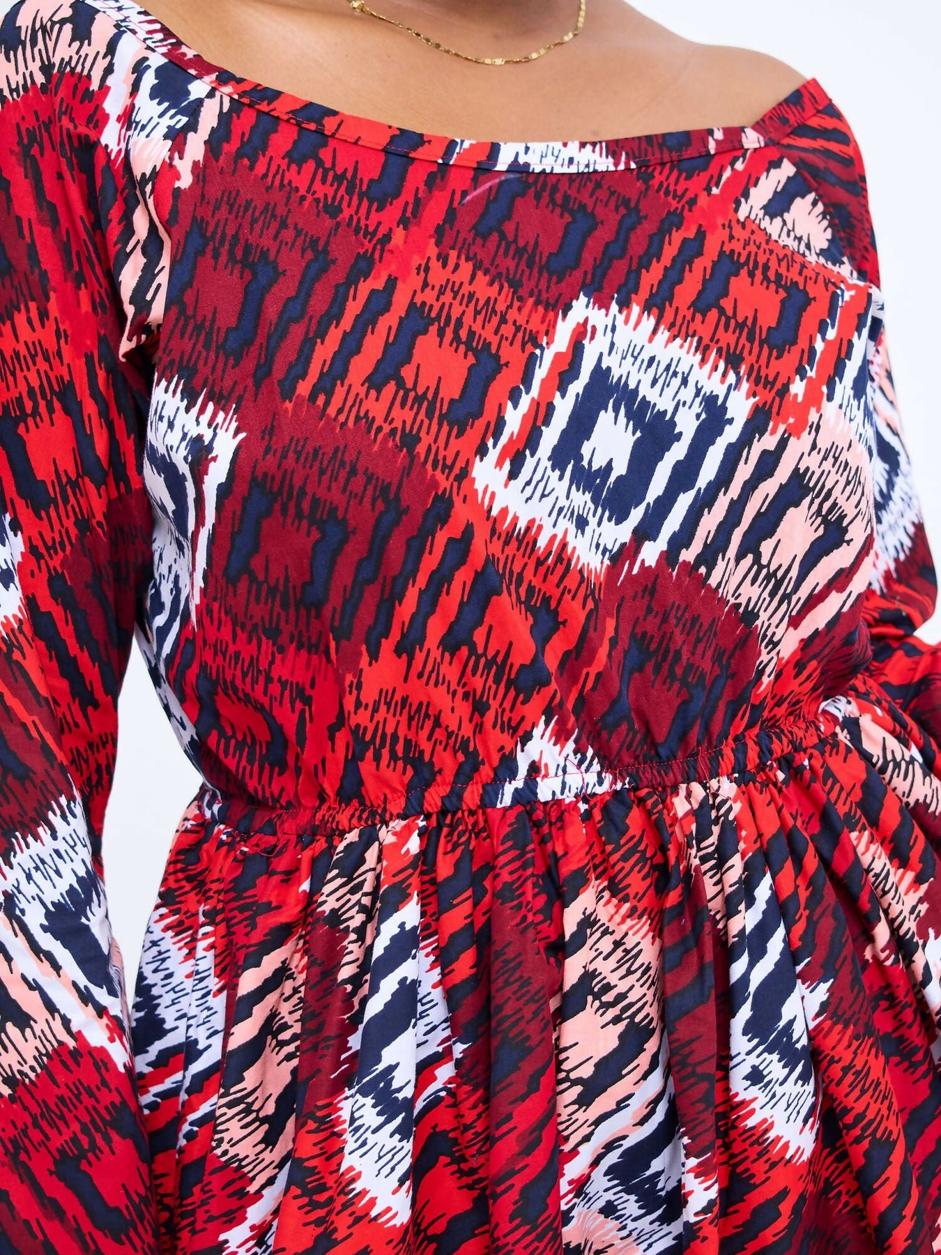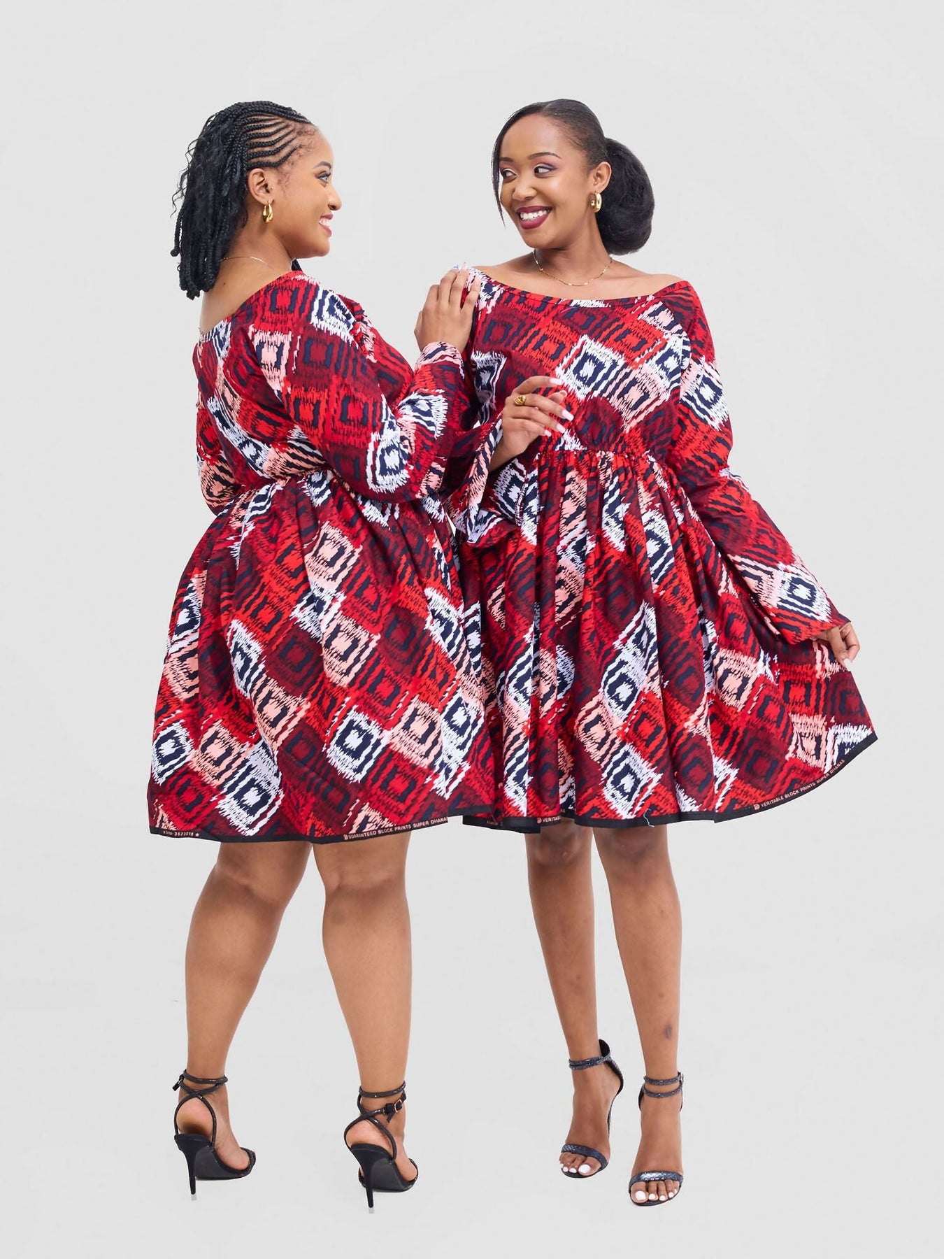 Turn heads and own your spotlight in the Crimson Charm Off-Shoulder Skater Dress — a bold blend of color, culture, and confidence. Featuring a striking red-toned geometric print, this dress is designed with an elegant off-shoulder neckline and flared bell sleeves for that extra touch of drama.