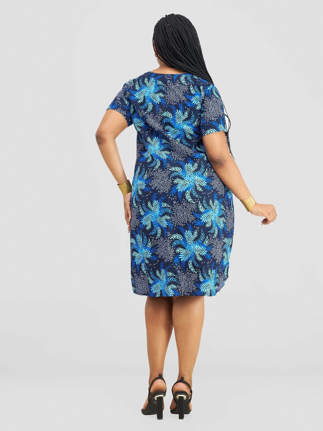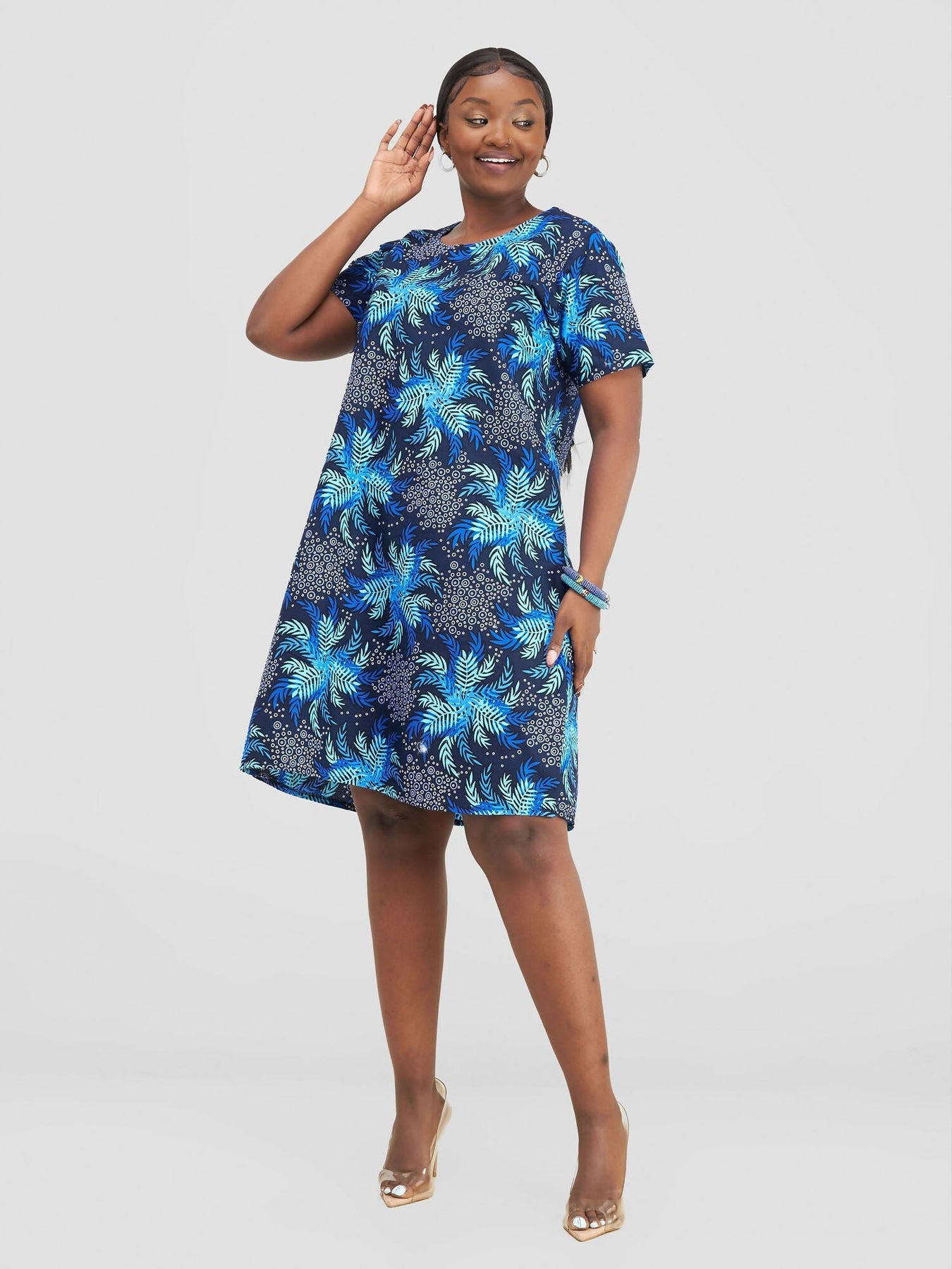 The dress is the epitome of a vibrant mix of colors, including light blue and dark blue. The pattern is bold and eye-catching, with a geometric, pixelated design.