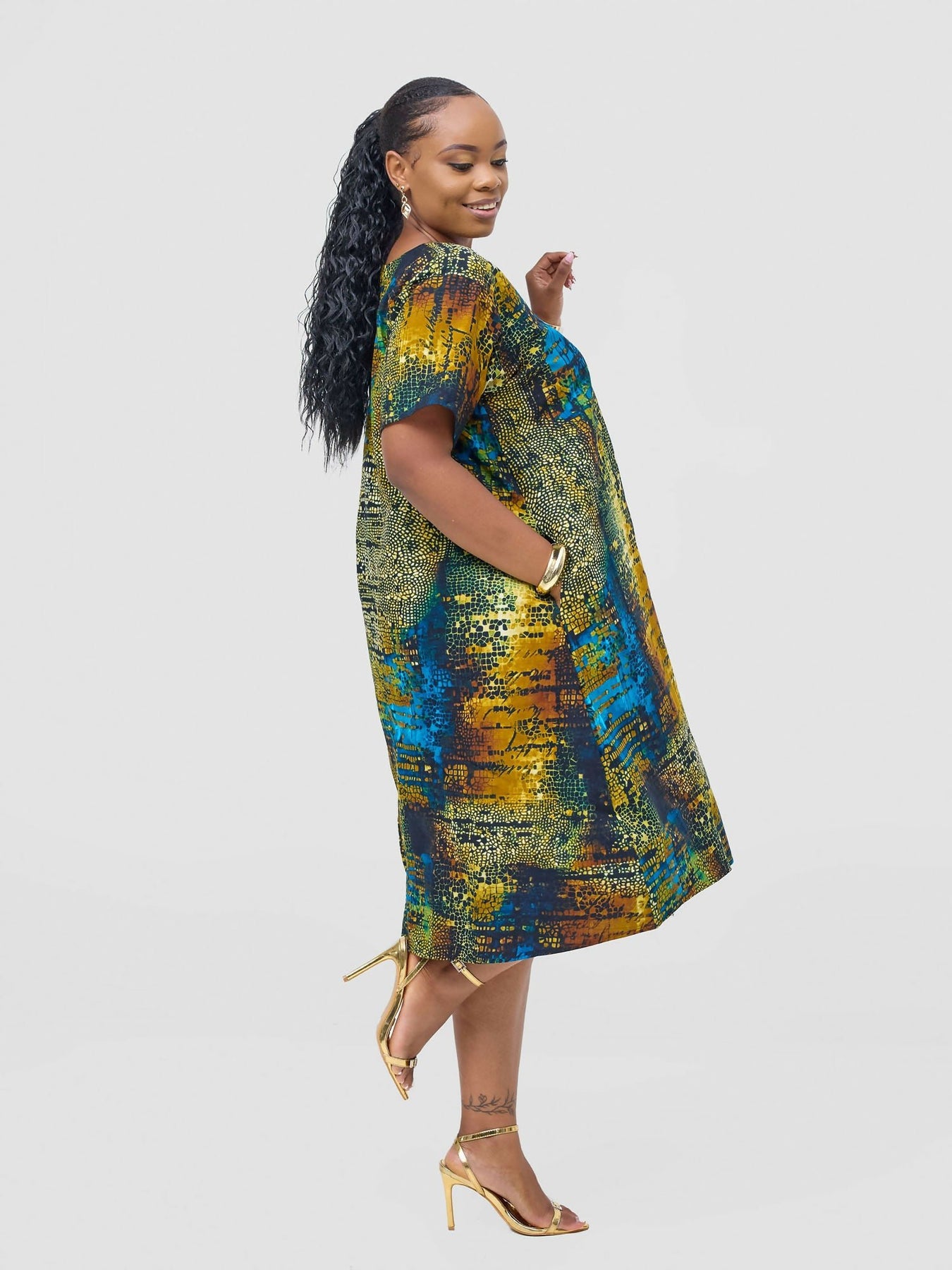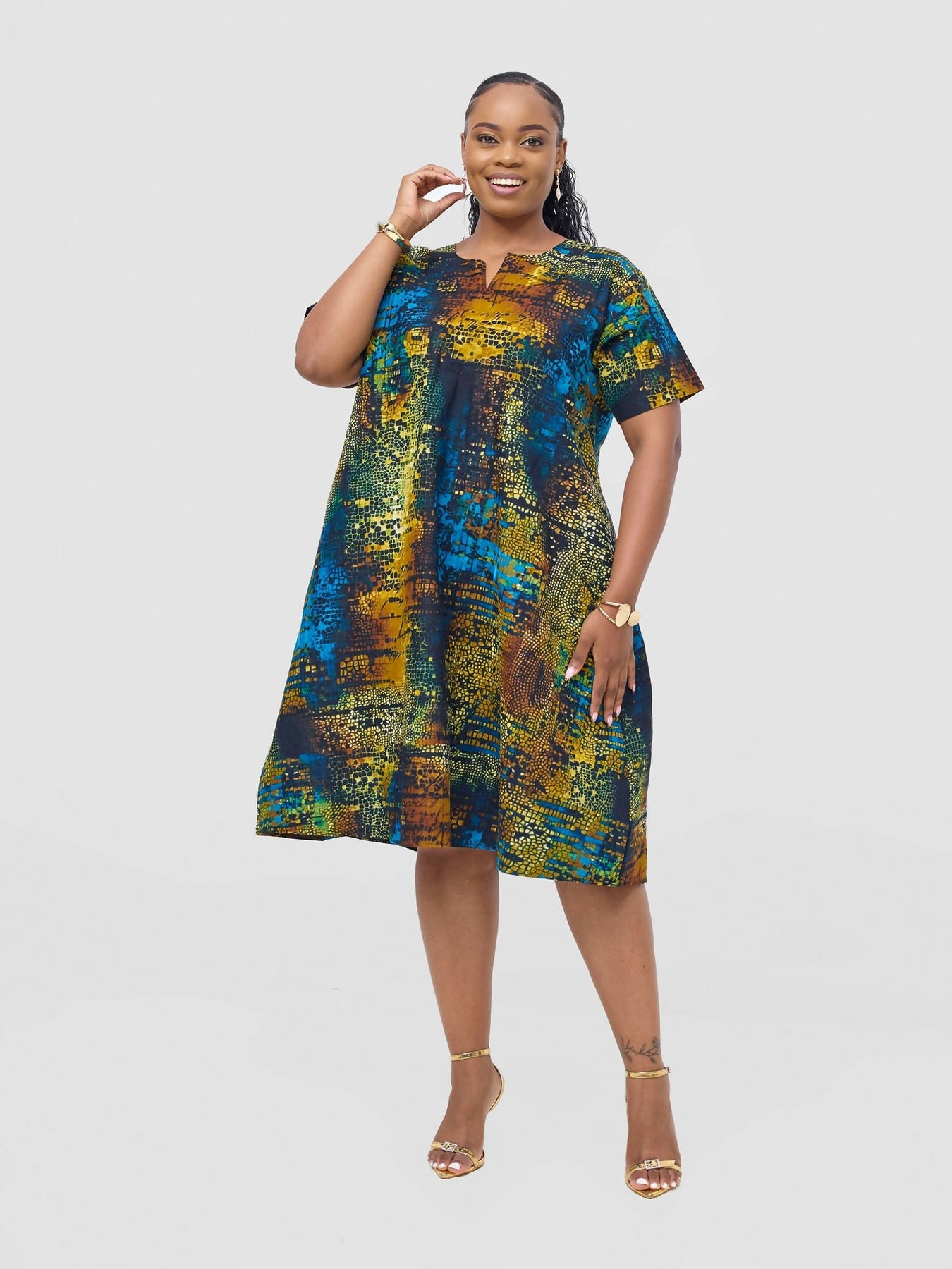 Simple, striking, and effortlessly chic — the Amani Abstract Shift Dress is your new go-to for standout style with zero fuss. Designed for the modern woman who values comfort without compromising on elegance, this short-sleeved shift dress features a vibrant, abstract pattern in earthy yellows, rich blues, and deep browns — reminiscent of contemporary art with an African soul.