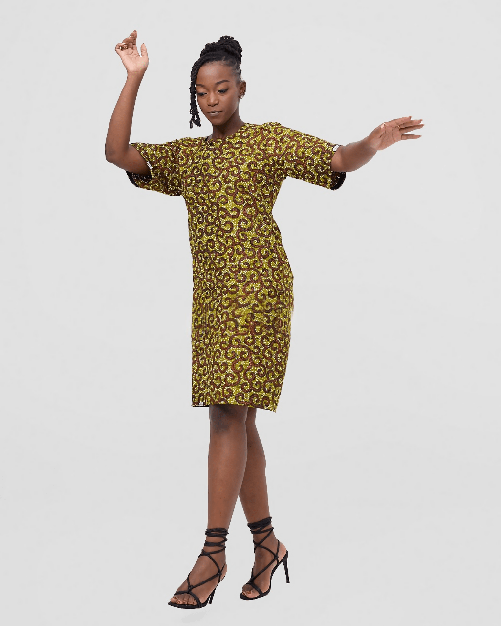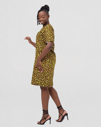 This eye-catching shift dress features a lively Ankara print in a rich palette of yellow, brown, and hints of white, showcasing a dynamic circular and geometric pattern. The simple round neckline and short sleeves create a relaxed and versatile silhouette that's perfect for everyday wear or dressing up for a special occasion.