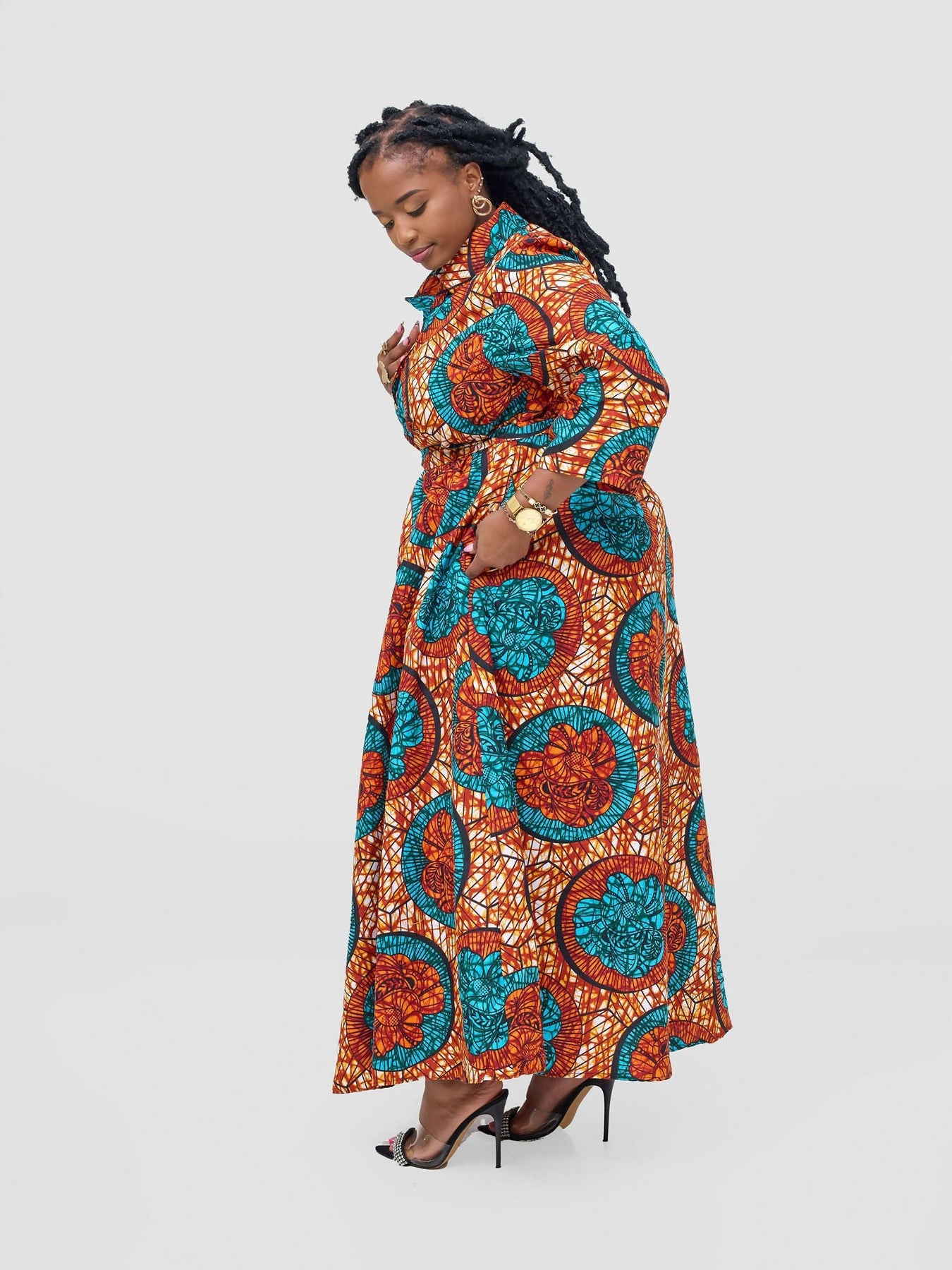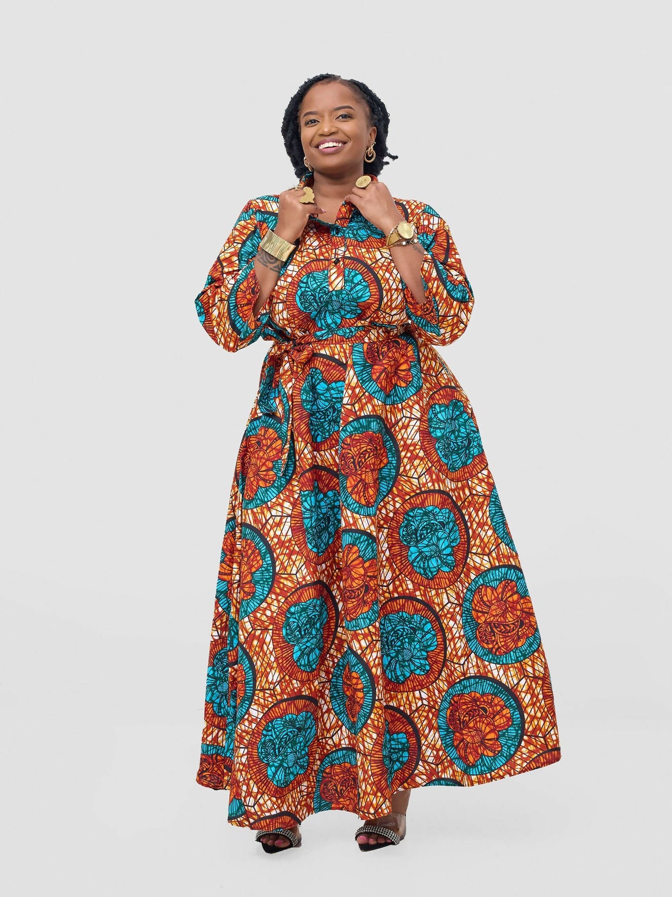 Make a bold, beautiful statement with the Zawadi Maxi Dress, a stunning celebration of African heritage and effortless elegance. Crafted from high-quality Ankara fabric, this full-length shirt dress features a vibrant blend of deep orange, teal blue, and warm red tones in a striking circular floral pattern that exudes confidence and culture.