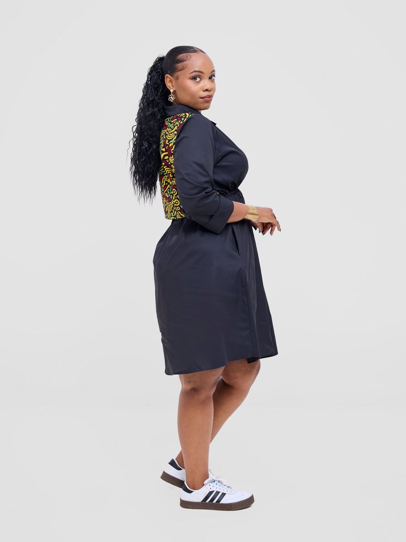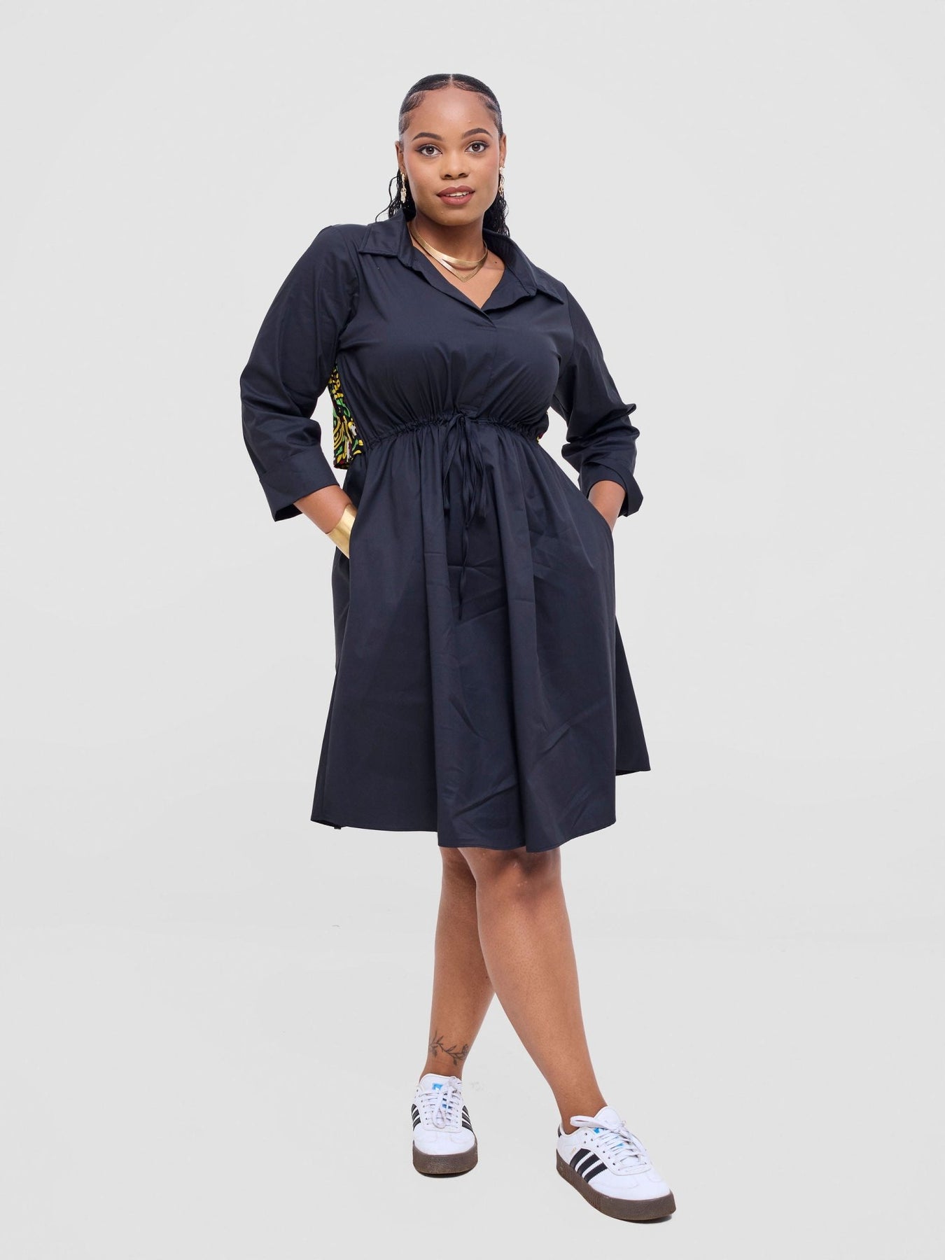Safari Lira Drawstring Knee Length Dress - Black + Tafo Print - Shopzetu