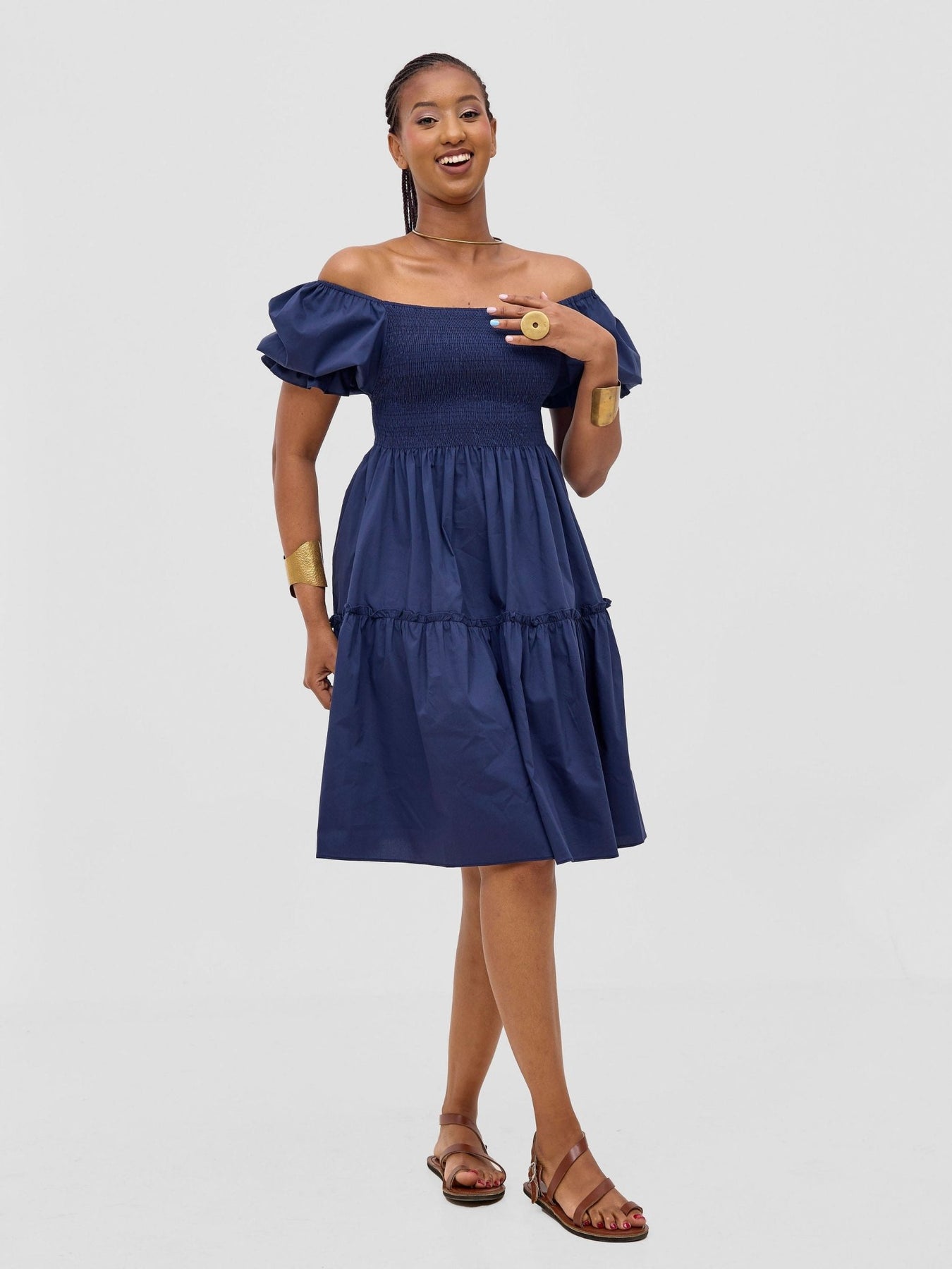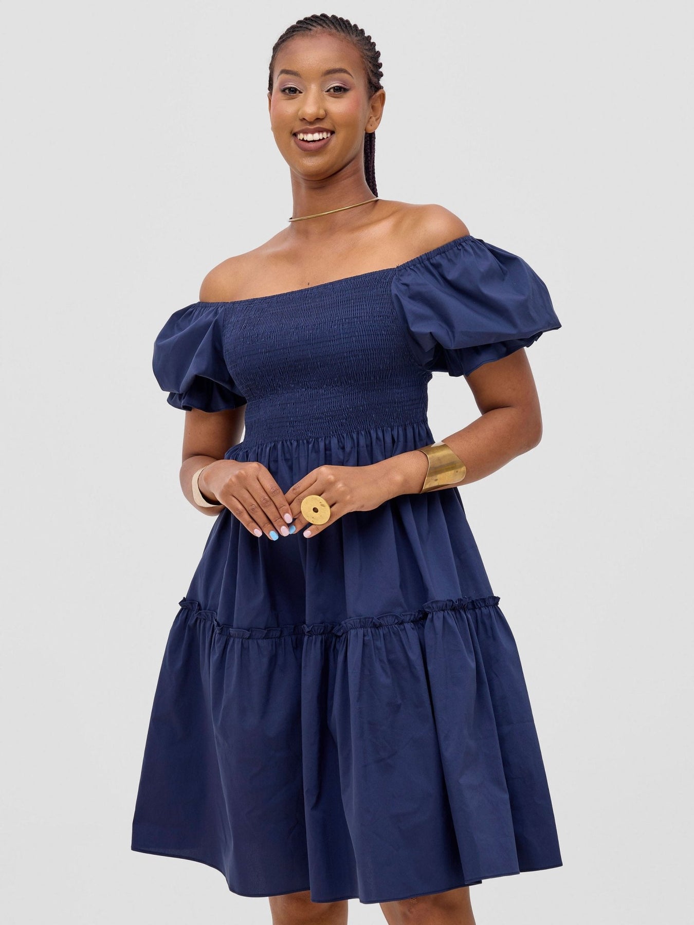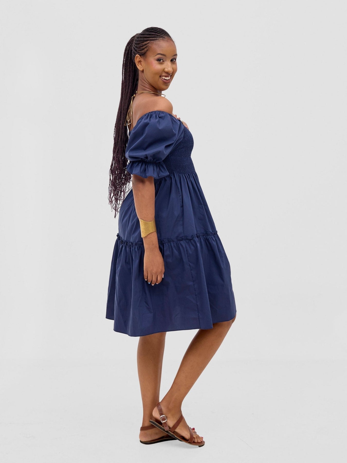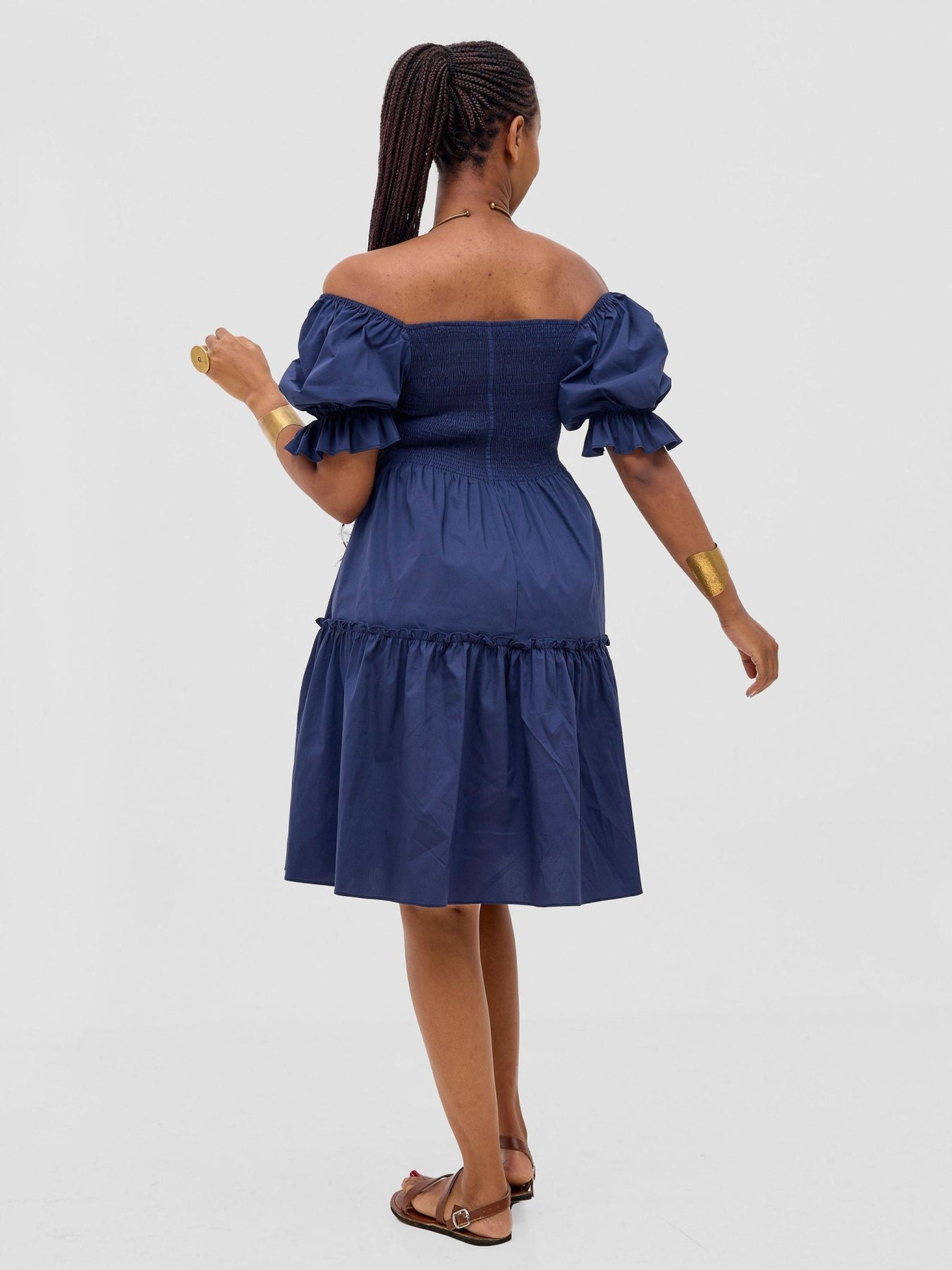 Safari Mara Shirred Bishop Sleeve Dress - Navy - Shopzetu
