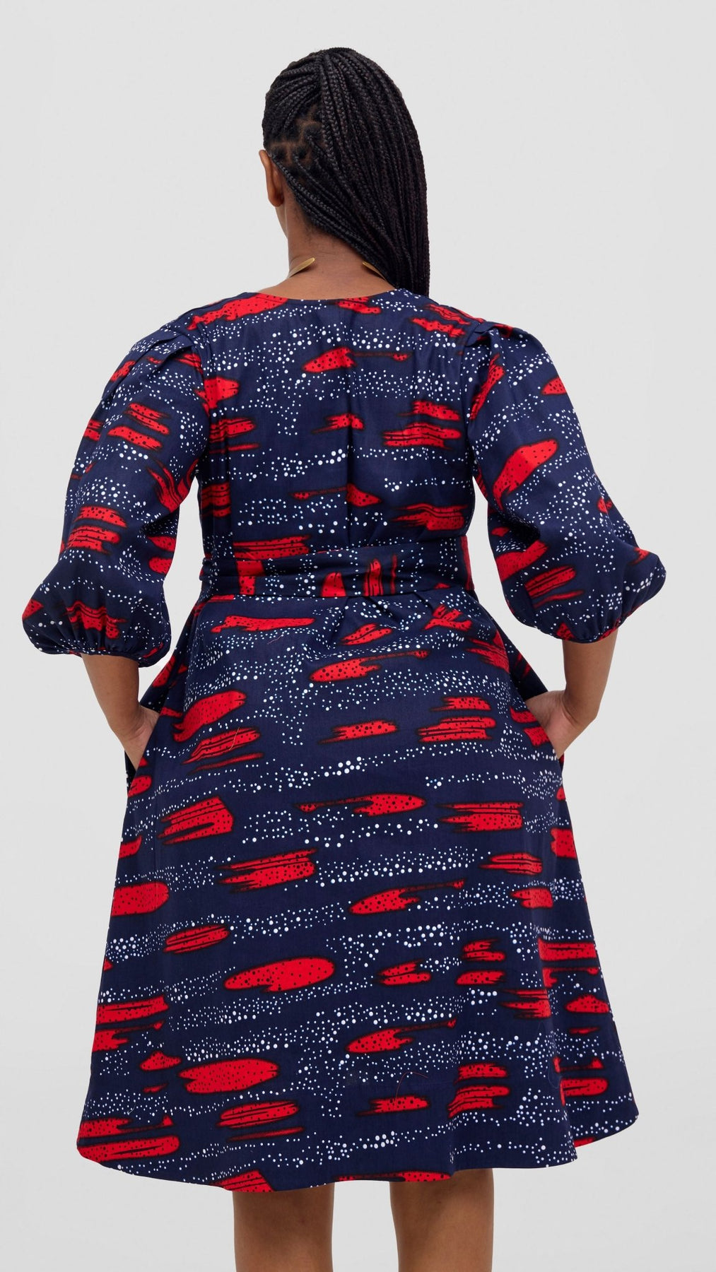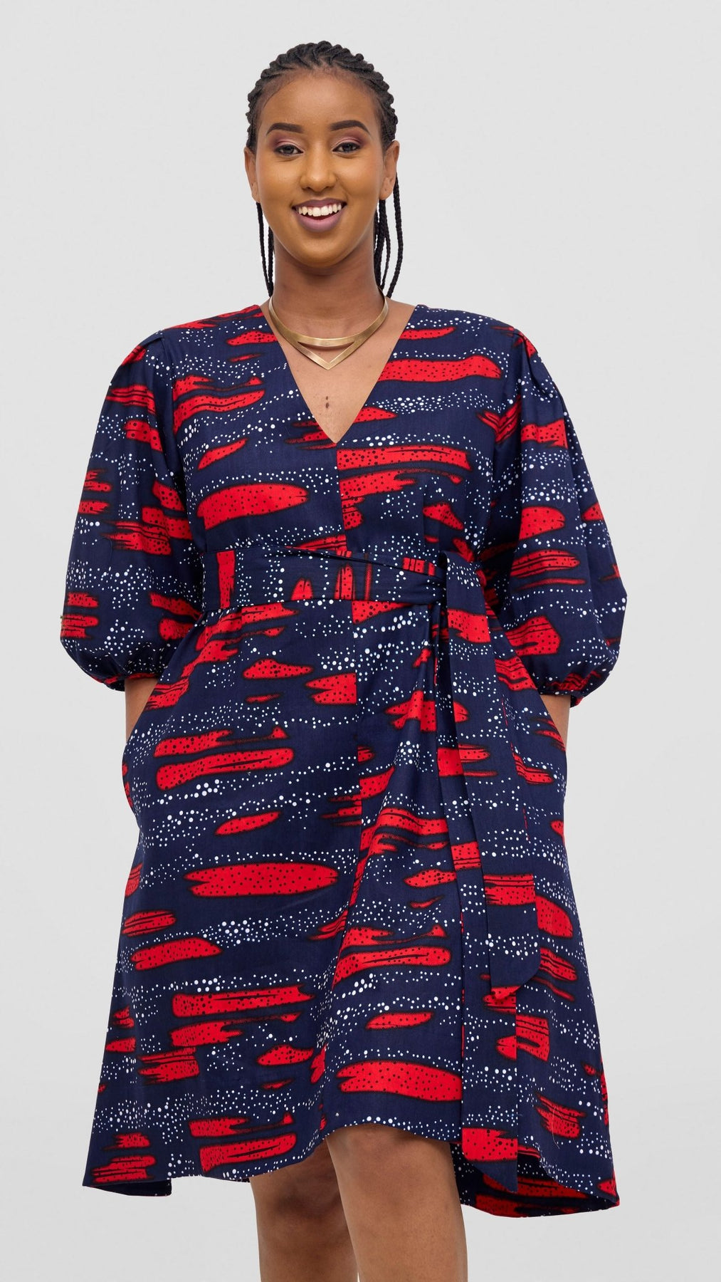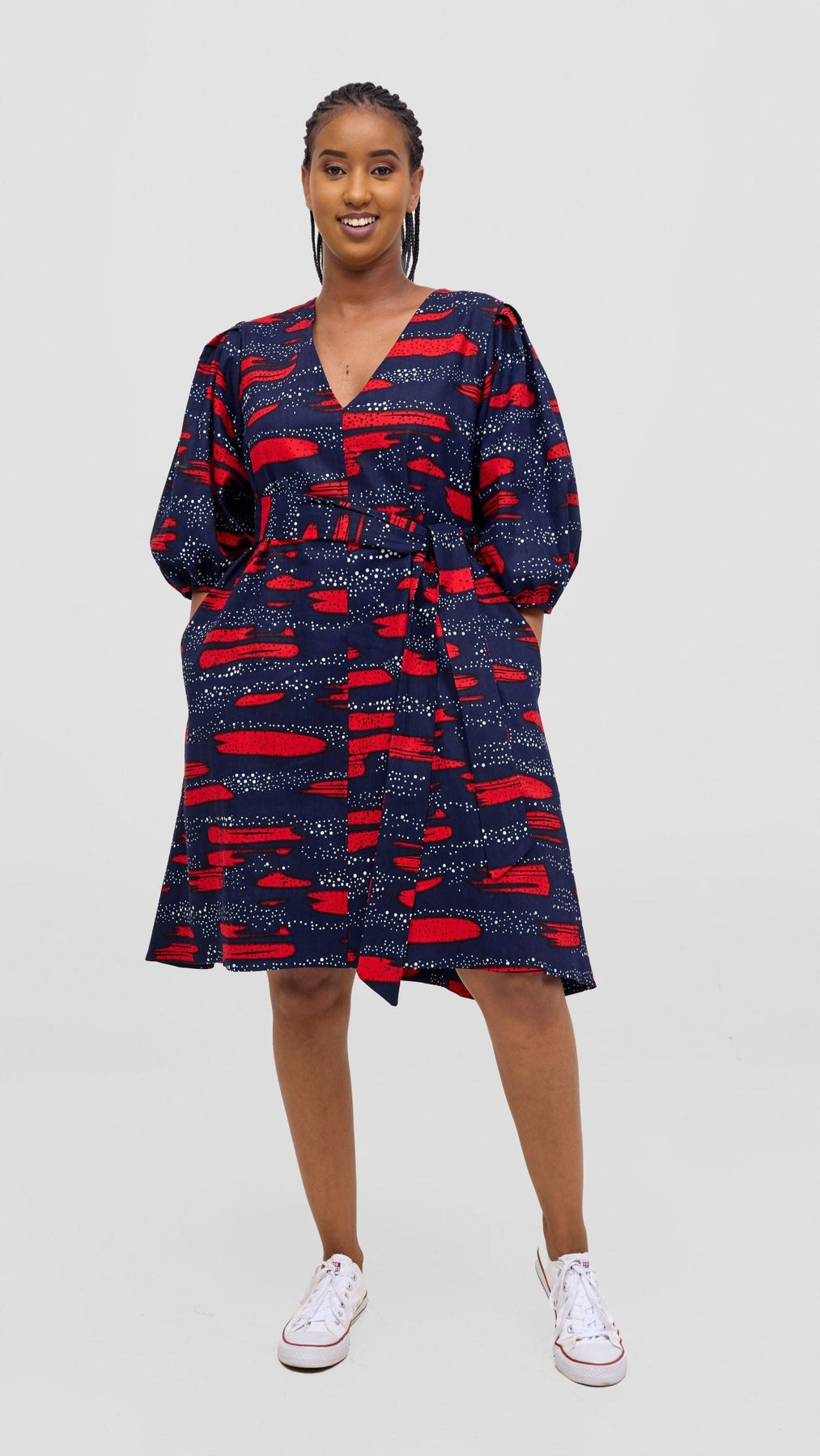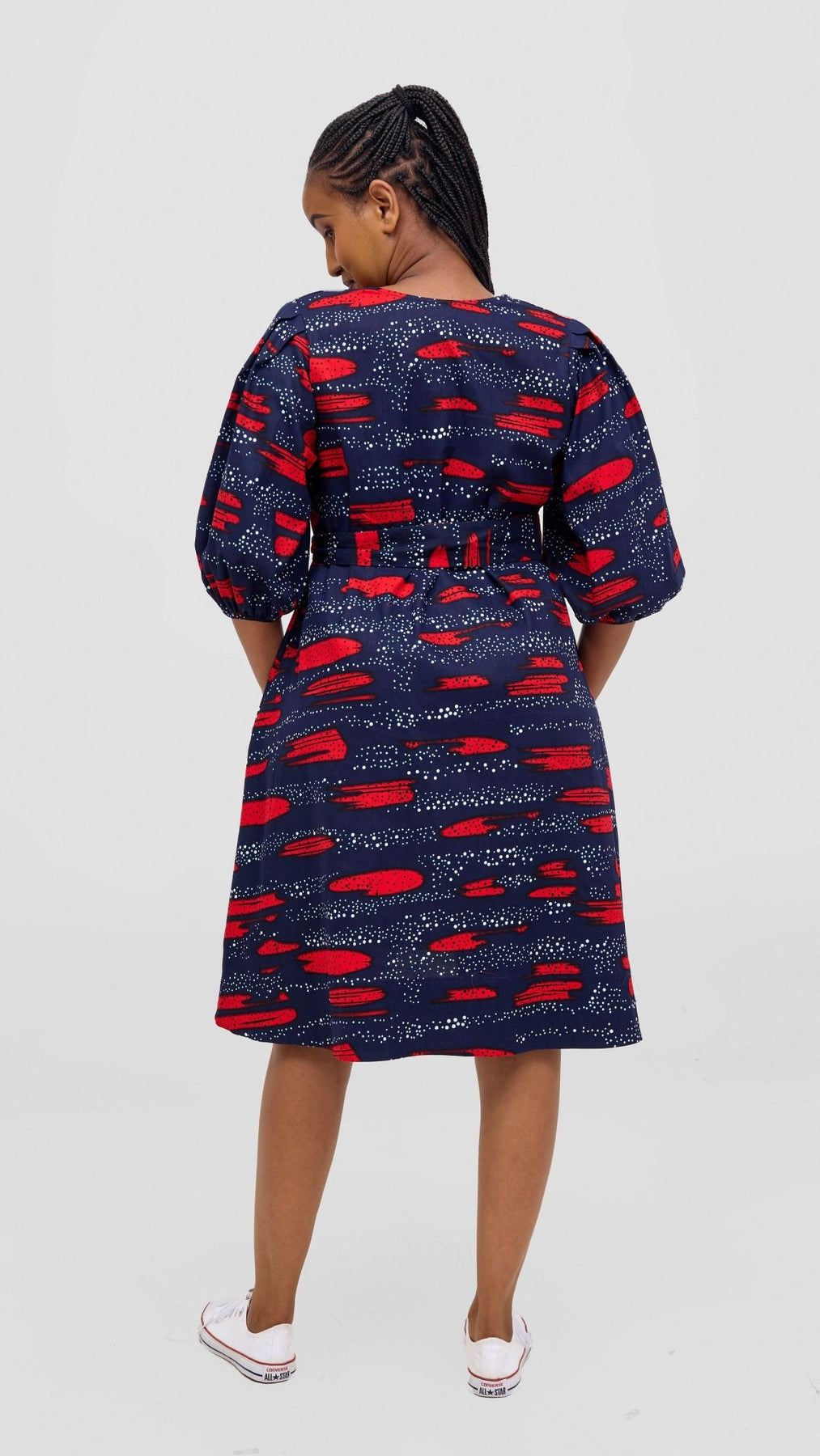 Safari Tara Bishop Sleeve Dress - Navy / Red Maya Print - Shopzetu