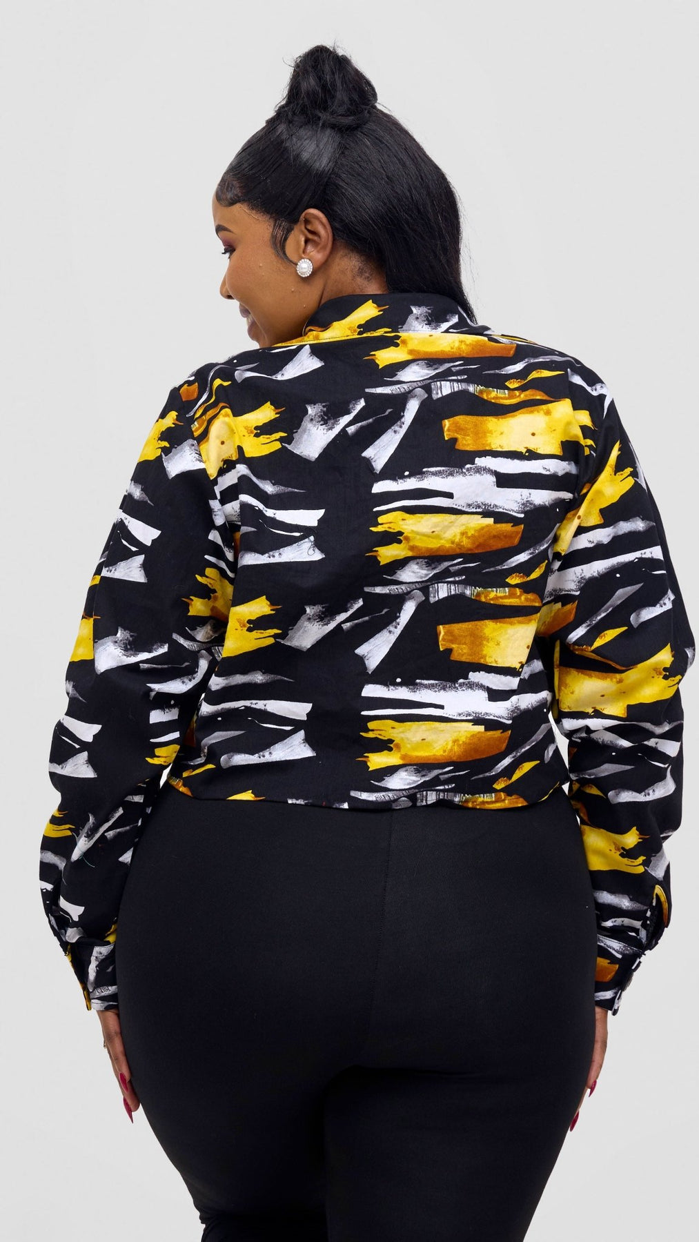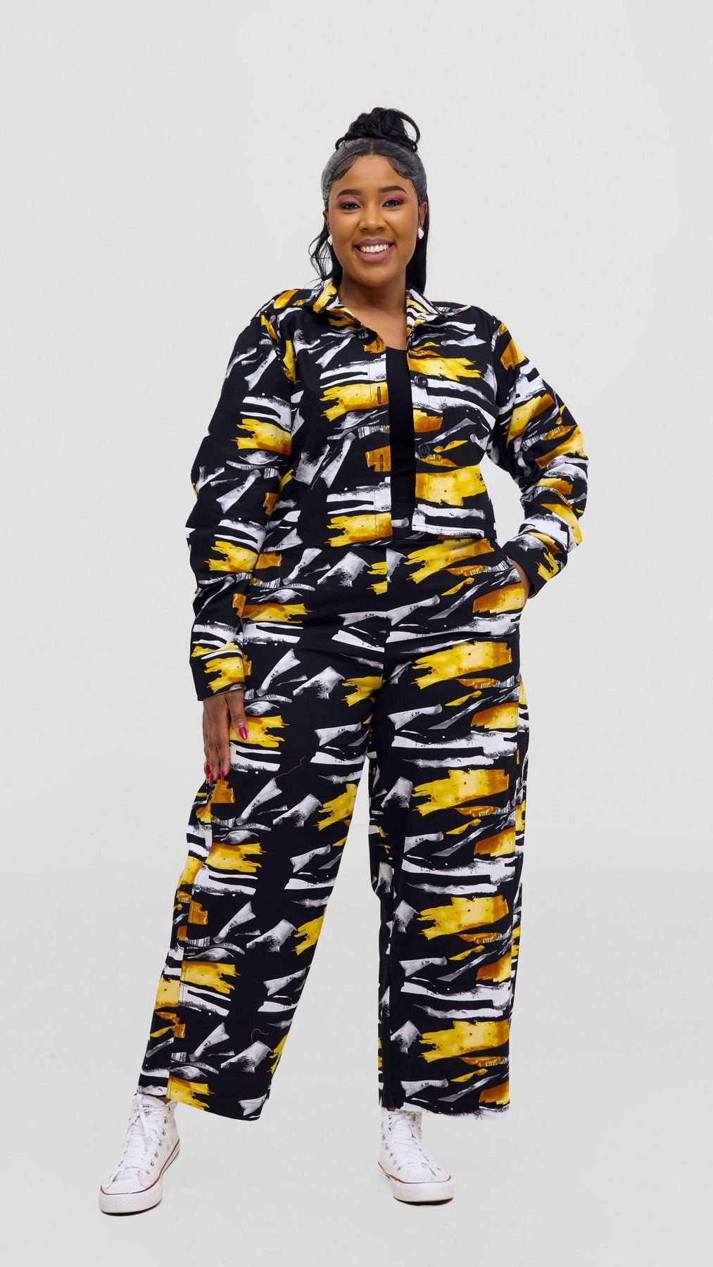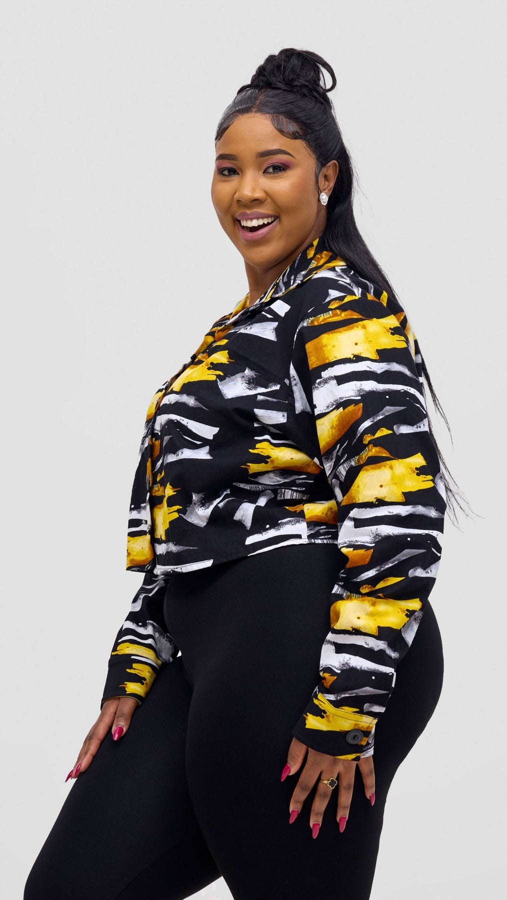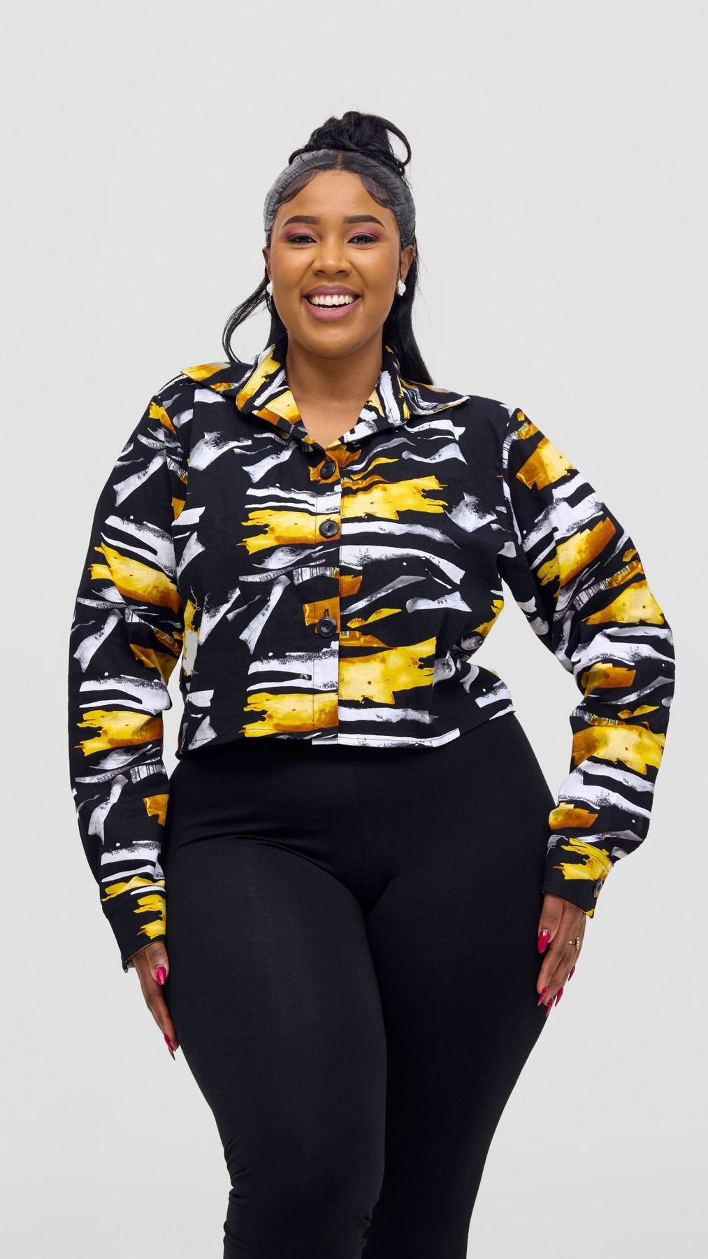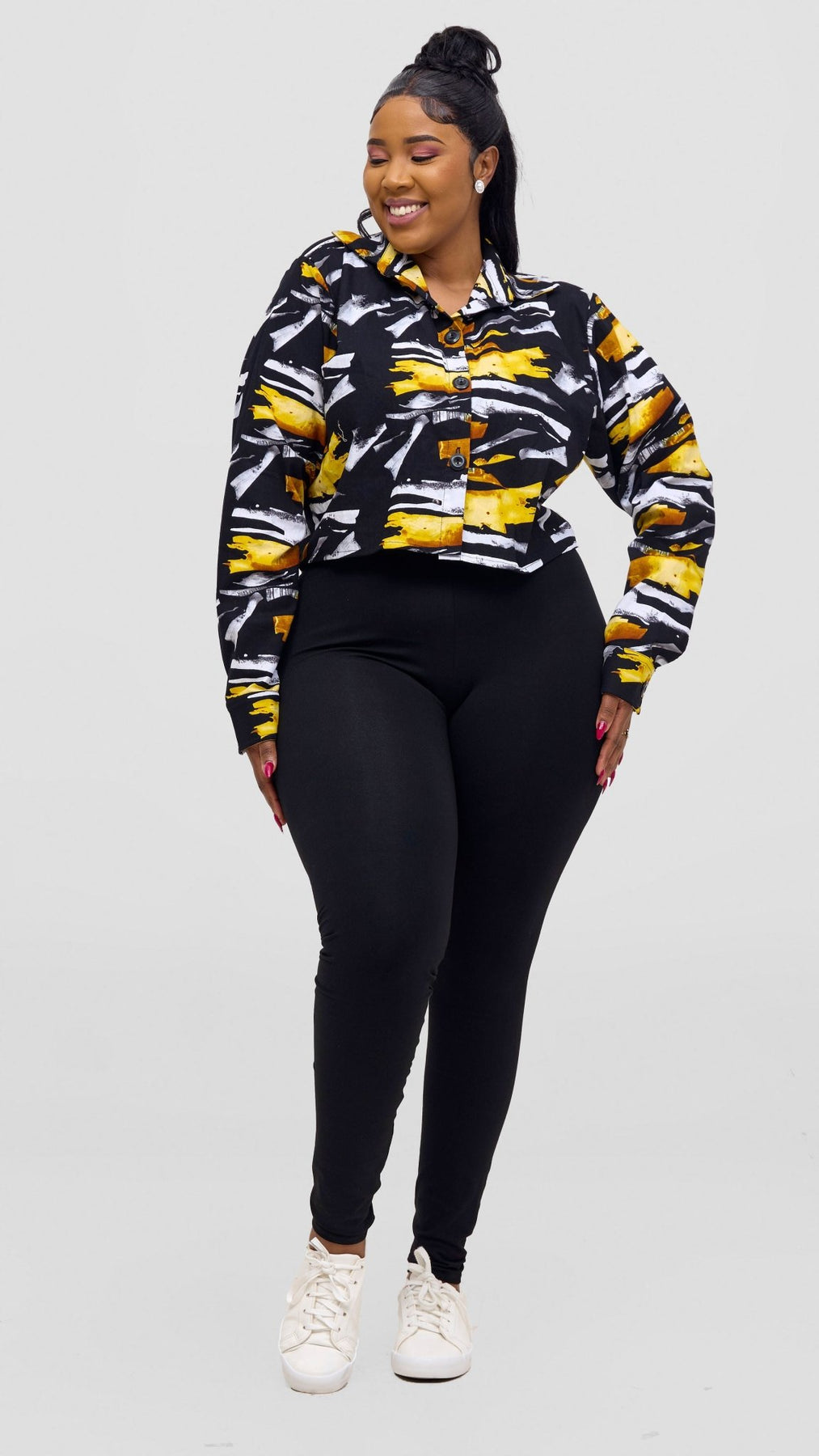 The Safari Tara Crop Shacket in Black with Yellow Fali Print offers versatile style, perfect for wearing alone or paired with matching pants for a coordinated look. Its cropped design combines the structure of a jacket with the comfort of a shirt, making it an expert choice for layering and elevating your wardrobe with bold, cultural-inspired patterns.