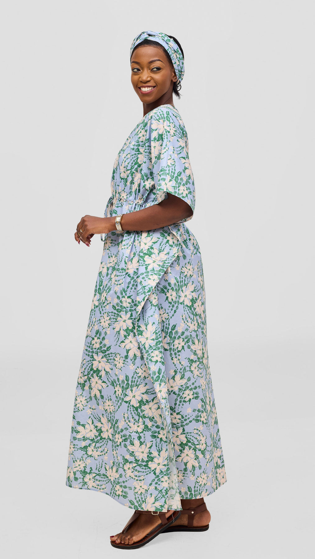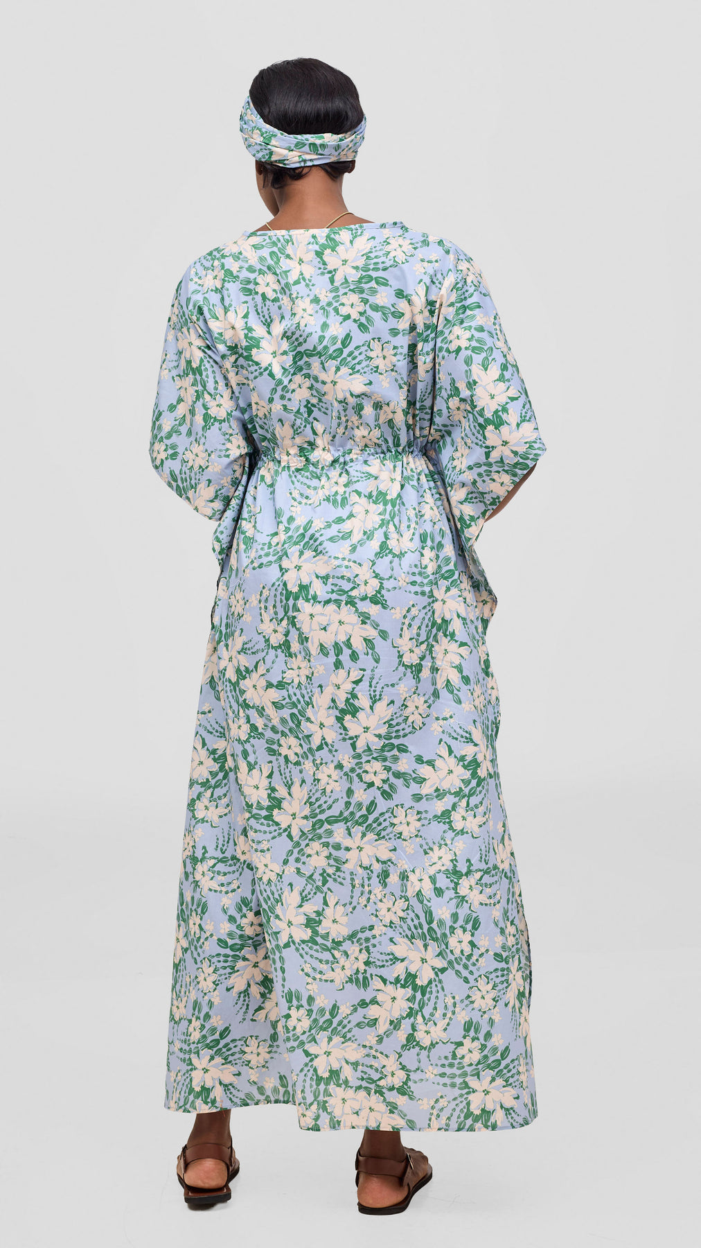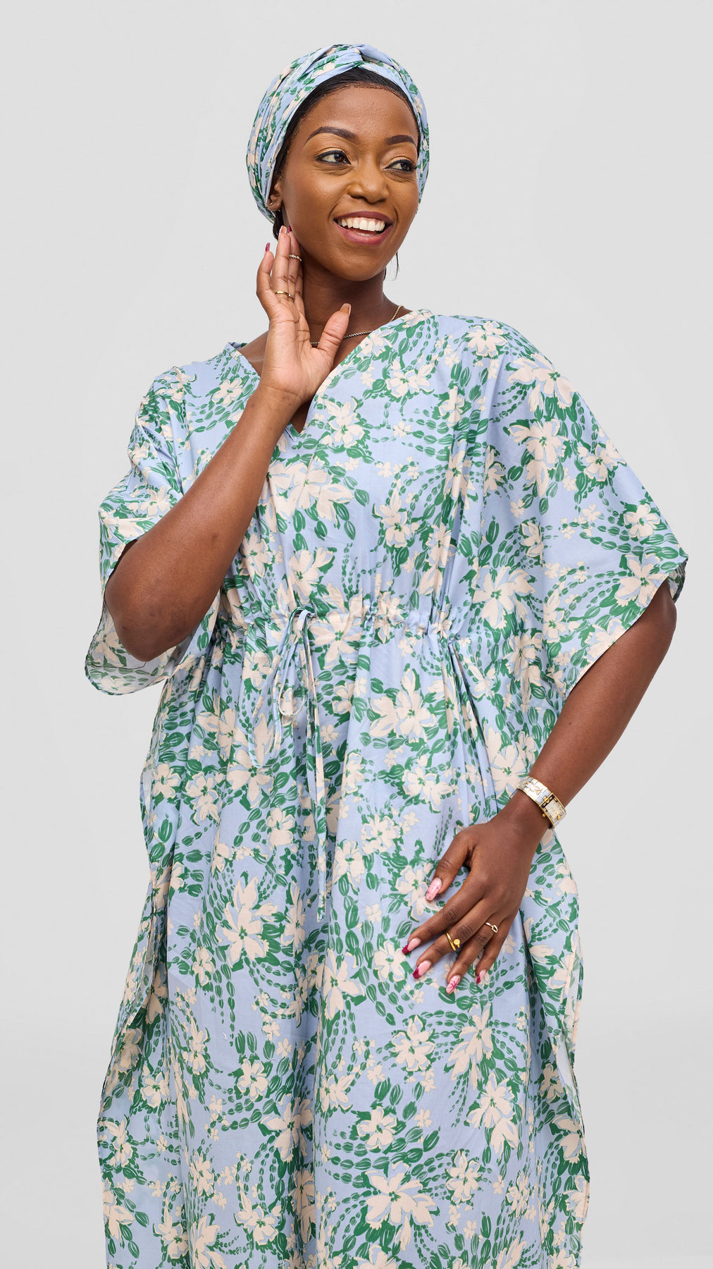 Embrace effortless elegance with this cotton kaftan, crafted from breathable fabric that moves with you. The wide drawstring silhouette offers flattering comfort while the striking light blue and purple print adds visual intrigue to your wardrobe. Perfect for leisurely afternoons or casual gatherings, this versatile piece transitions seamlessly from day to evening wear. A timeless addition to any collection seeking understated sophistication.