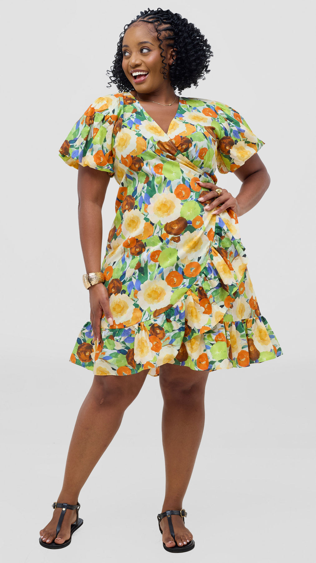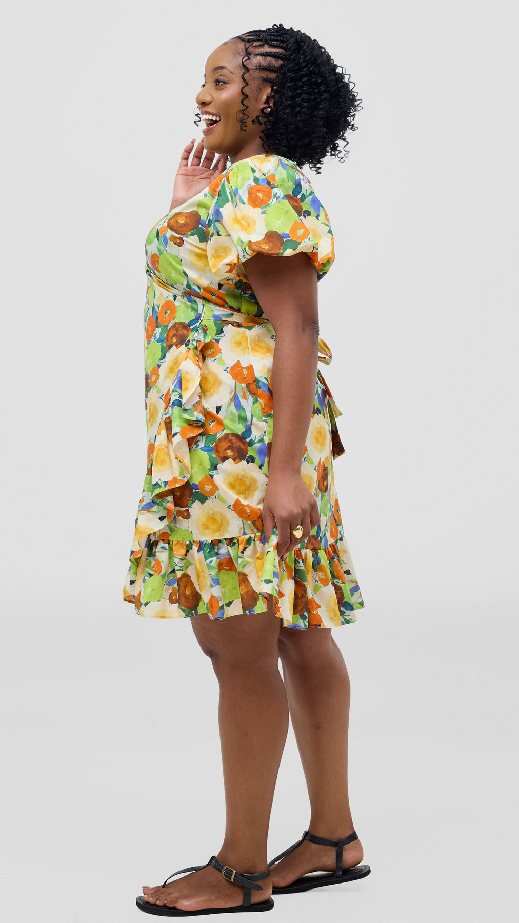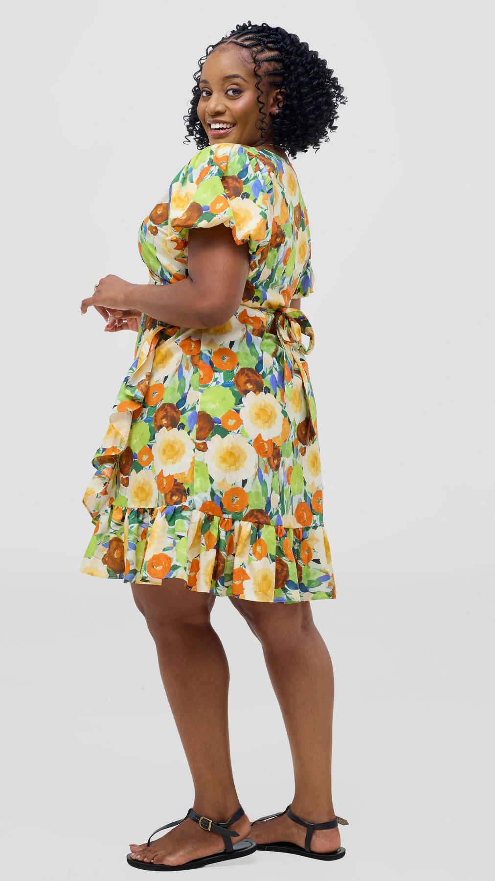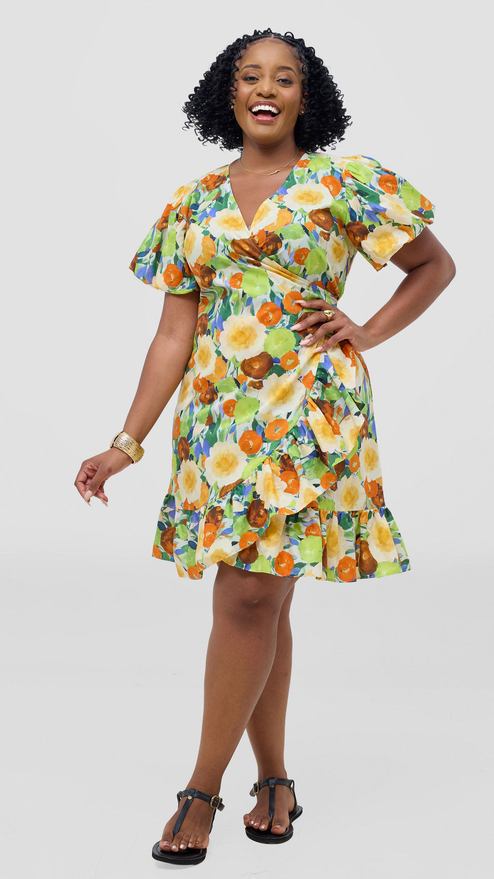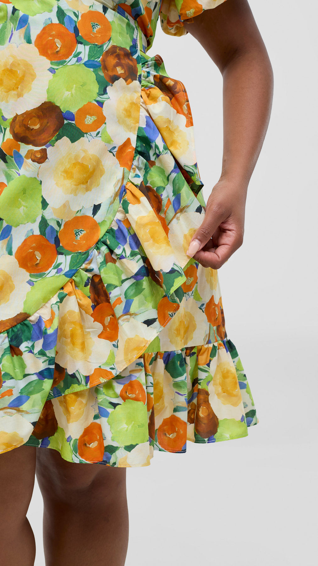 Embrace relaxed sophistication with this cotton wrap dress that adapts to your lifestyle. Constructed from soft, breathable cotton fabric, it offers all-day comfort without compromising on style. The knee-length cut paired with charming ruffles creates a feminine silhouette that feels both modern and timeless. The vibrant orange and green print brings warmth and personality to your wardrobe. Dress it down with casual sandals for weekend errands, or elevate it with heels for evening plans. This is the one piece that bridges your casual and dressy moments, delivering effortless elegance whenever you need it.