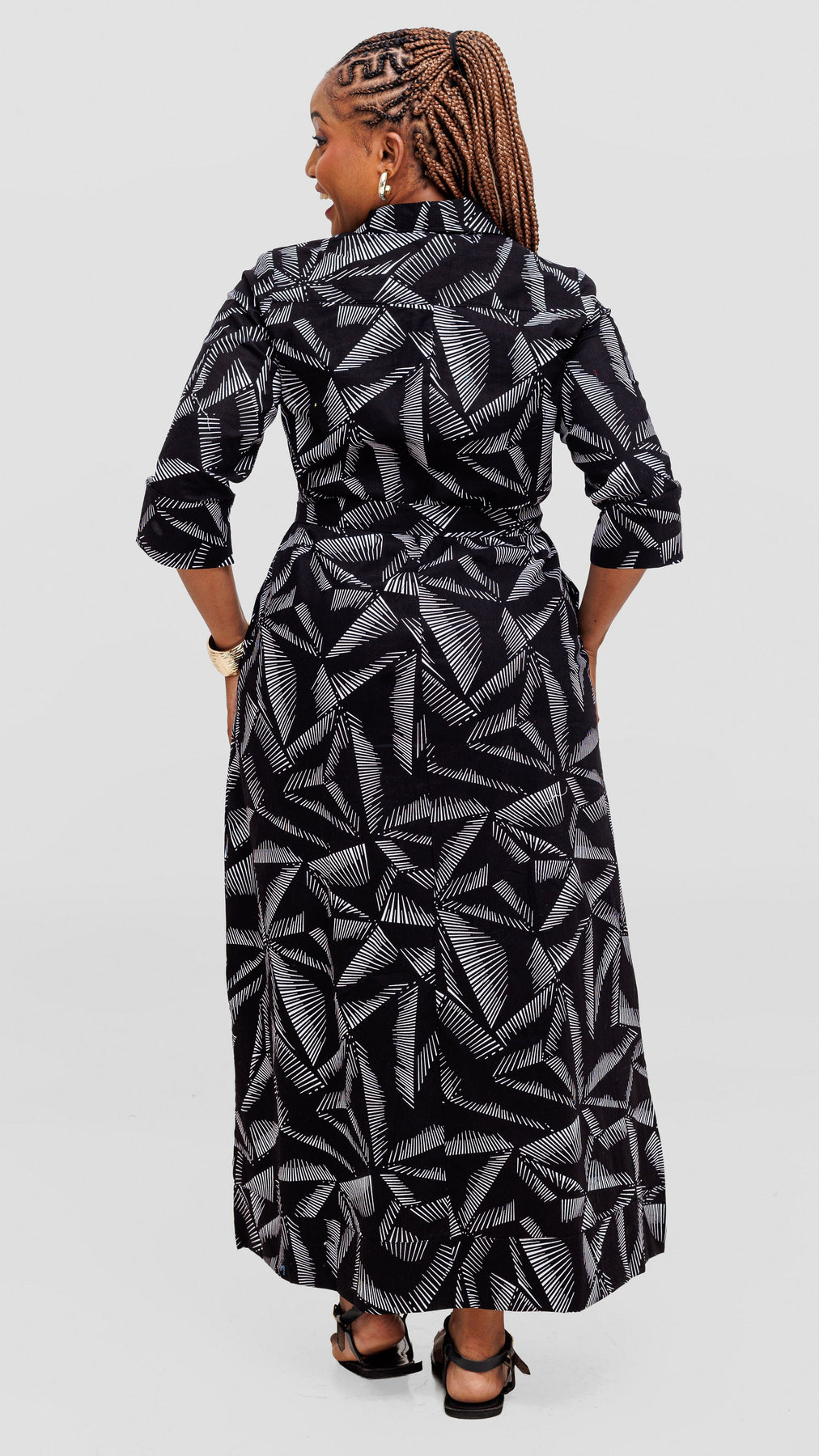 Embrace timeless elegance with this striking kitenge maxi dress from Safari by Vivo Zehra. Crafted from authentic African fabric, the black and white ana print delivers bold visual interest while maintaining refined sophistication. The flowing maxi silhouette paired with three-quarter sleeves creates a graceful, versatile look suitable for both casual gatherings and special occasions. The traditional kitenge material ensures comfort and breathability, while the classic color palette complements various skin tones. Perfect for those seeking to celebrate African heritage with contemporary style and understated luxury.