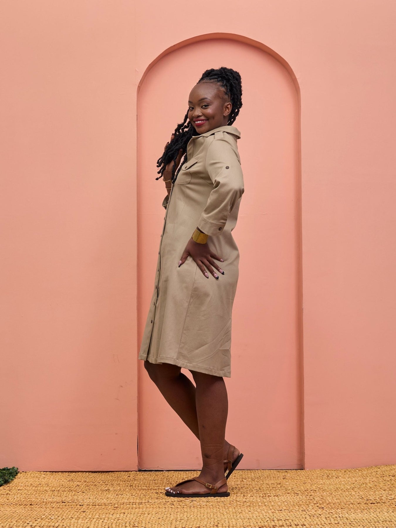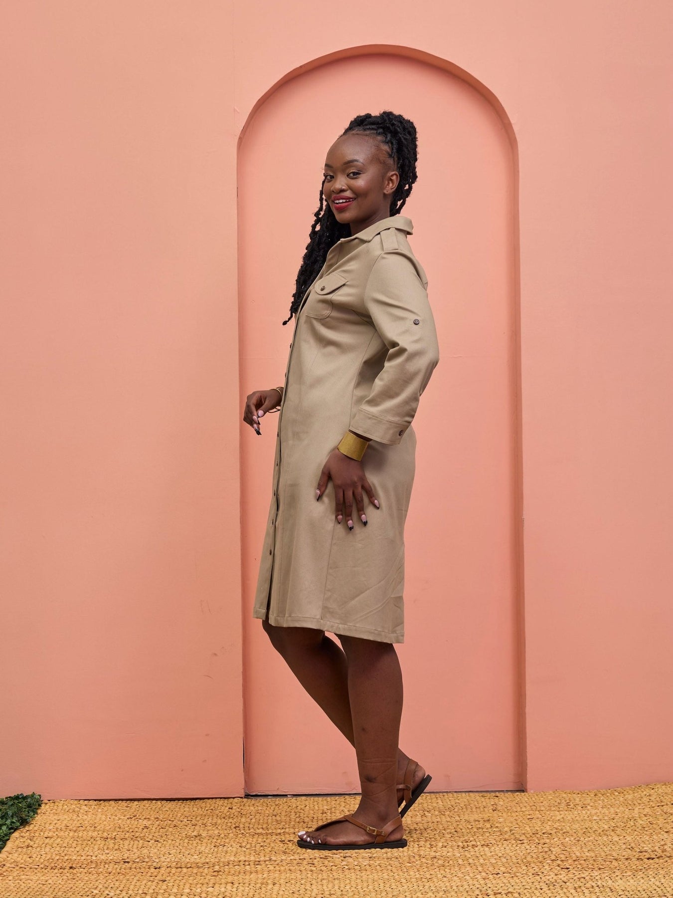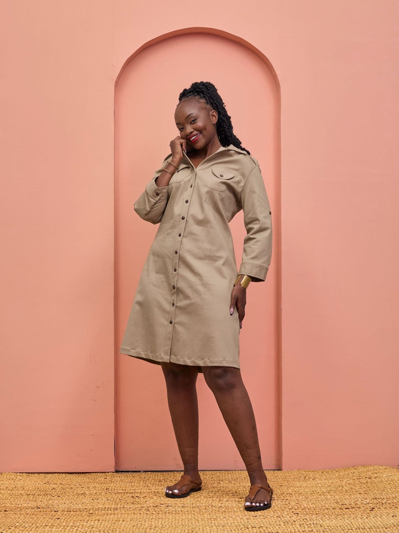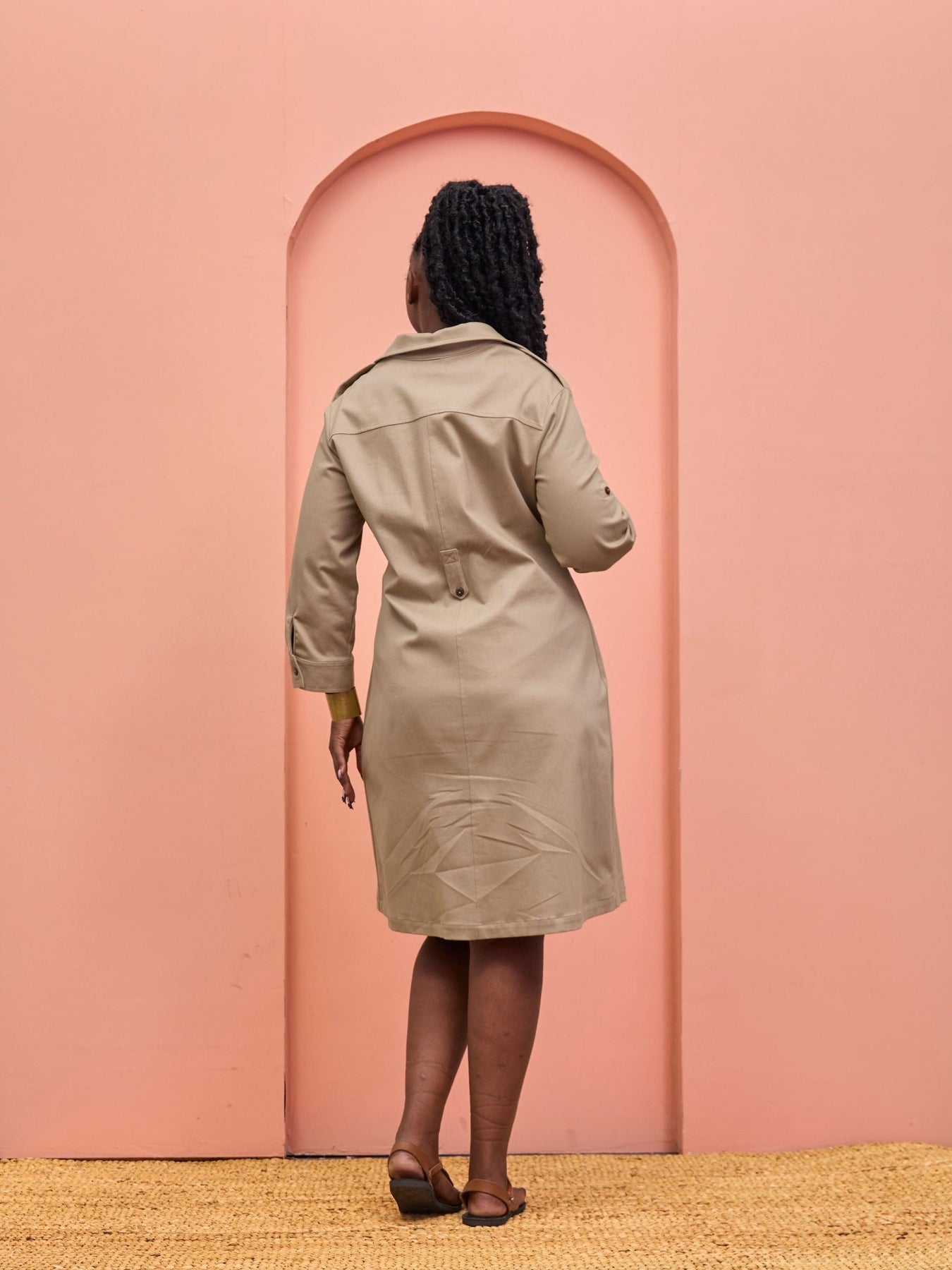 Safari Chui 3/4 Sleeve A - Line Dress - Taupe - Shopzetu