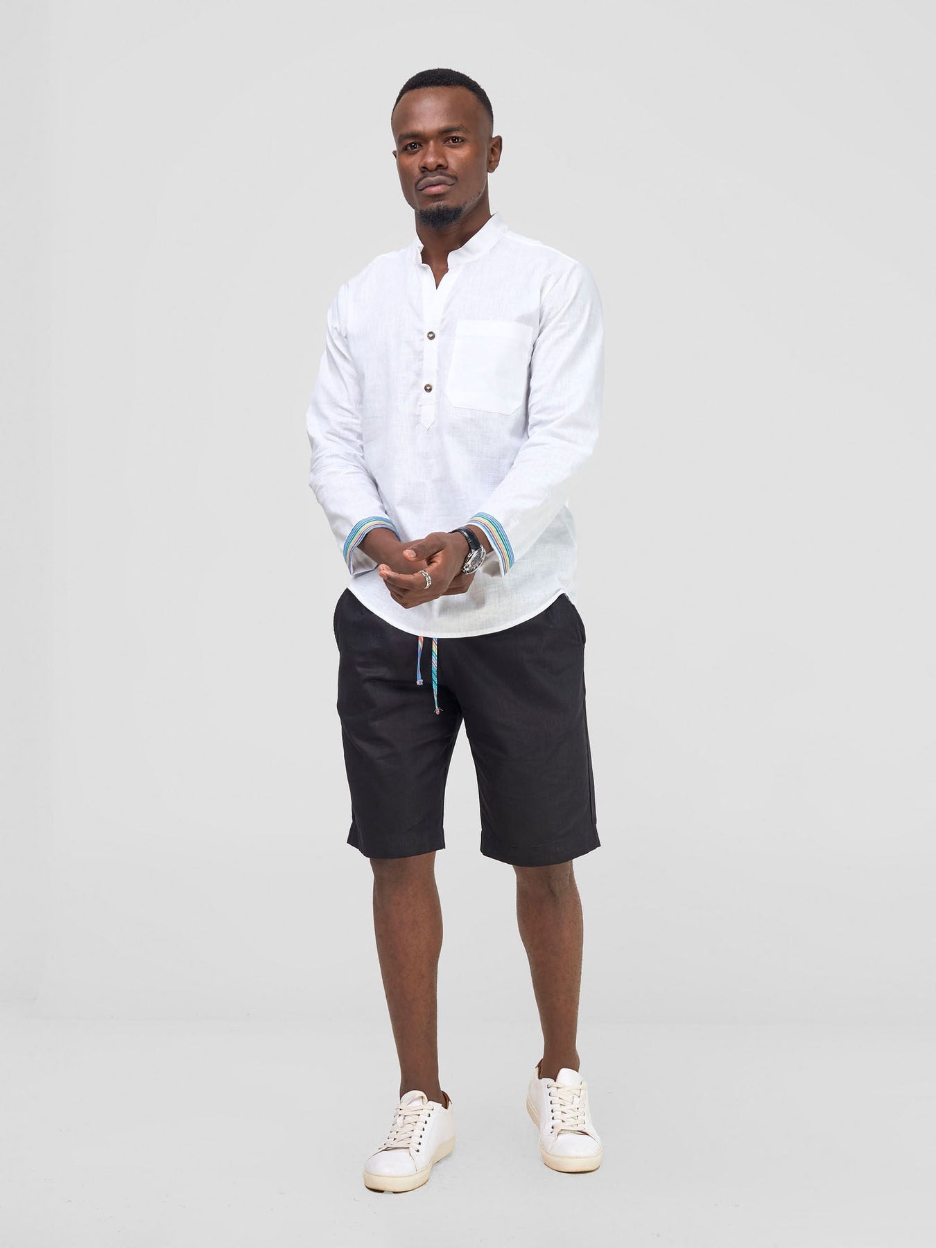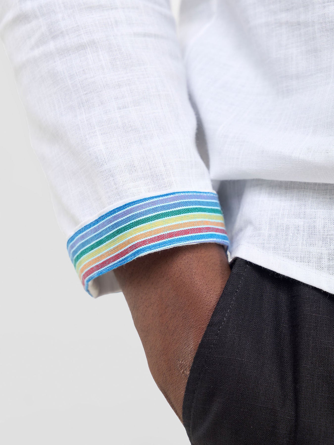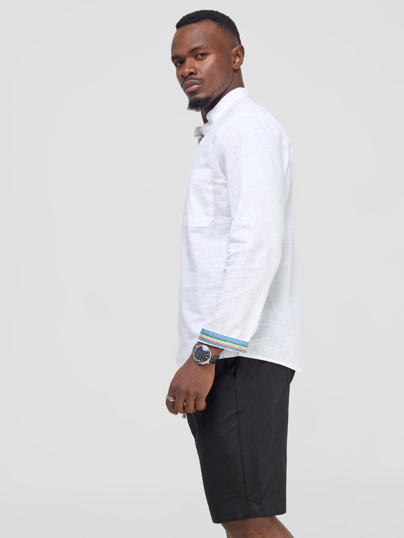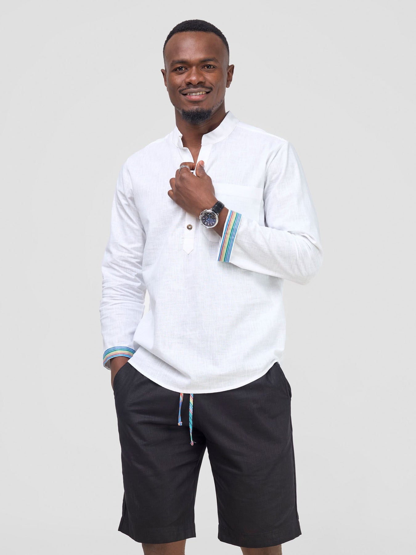 • This half-placket shirt features a minimalist design with a plain Mandarin collar, complemented by vibrant multicolored cuffs for a subtle yet stylish contrast