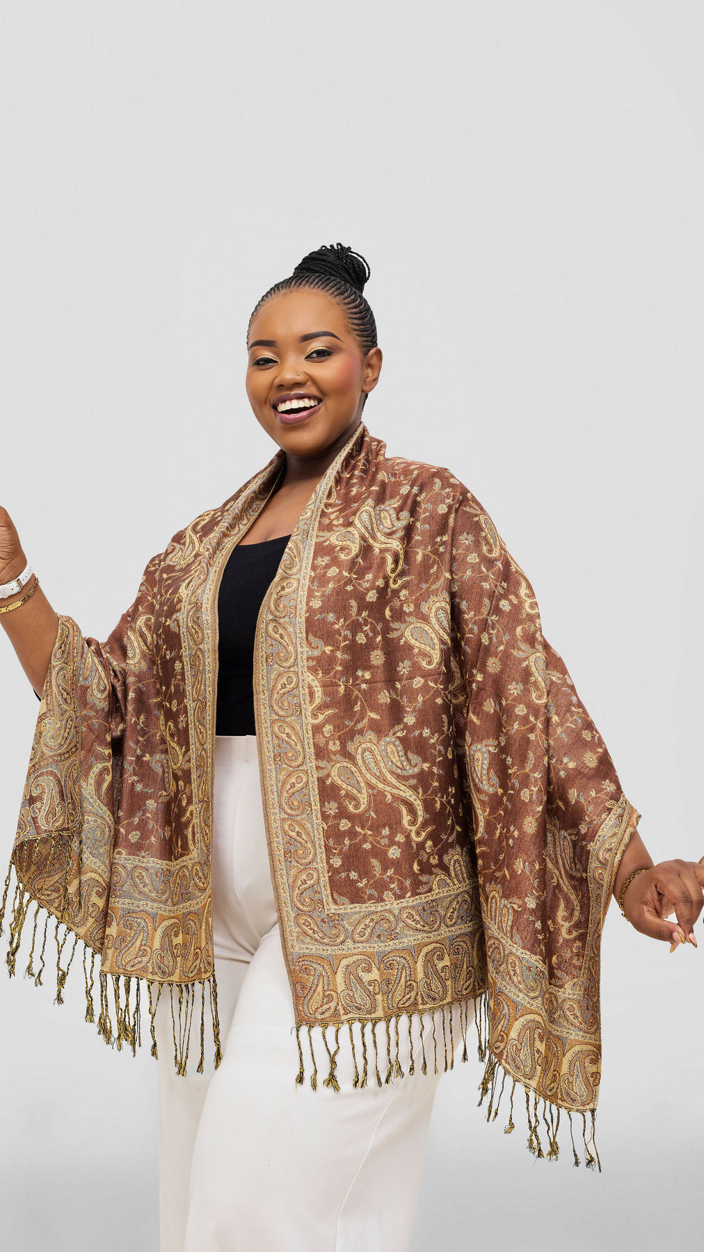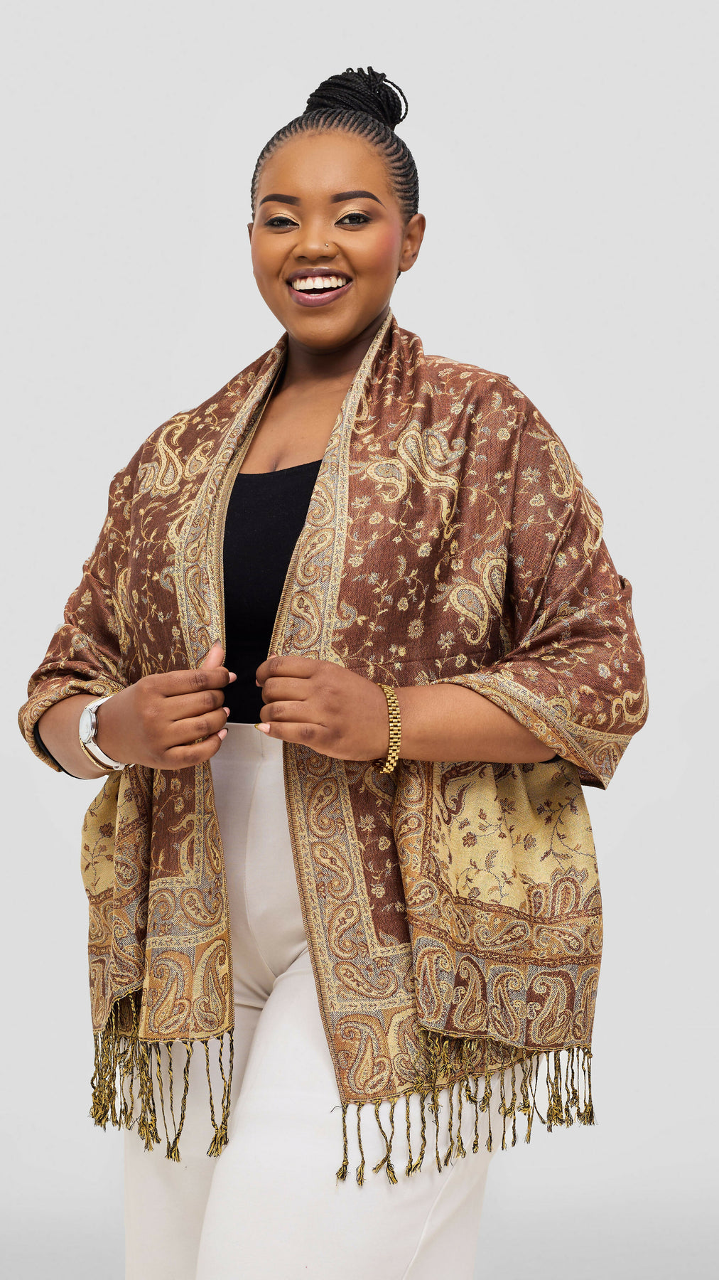 Mostly warm brown with beige, gold, and subtle blue paisley elements, ending in gold fringes.