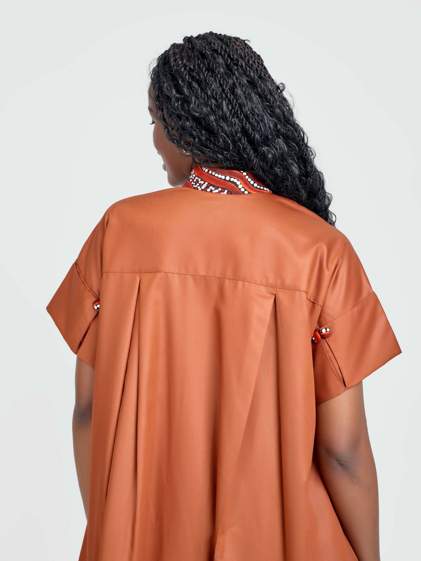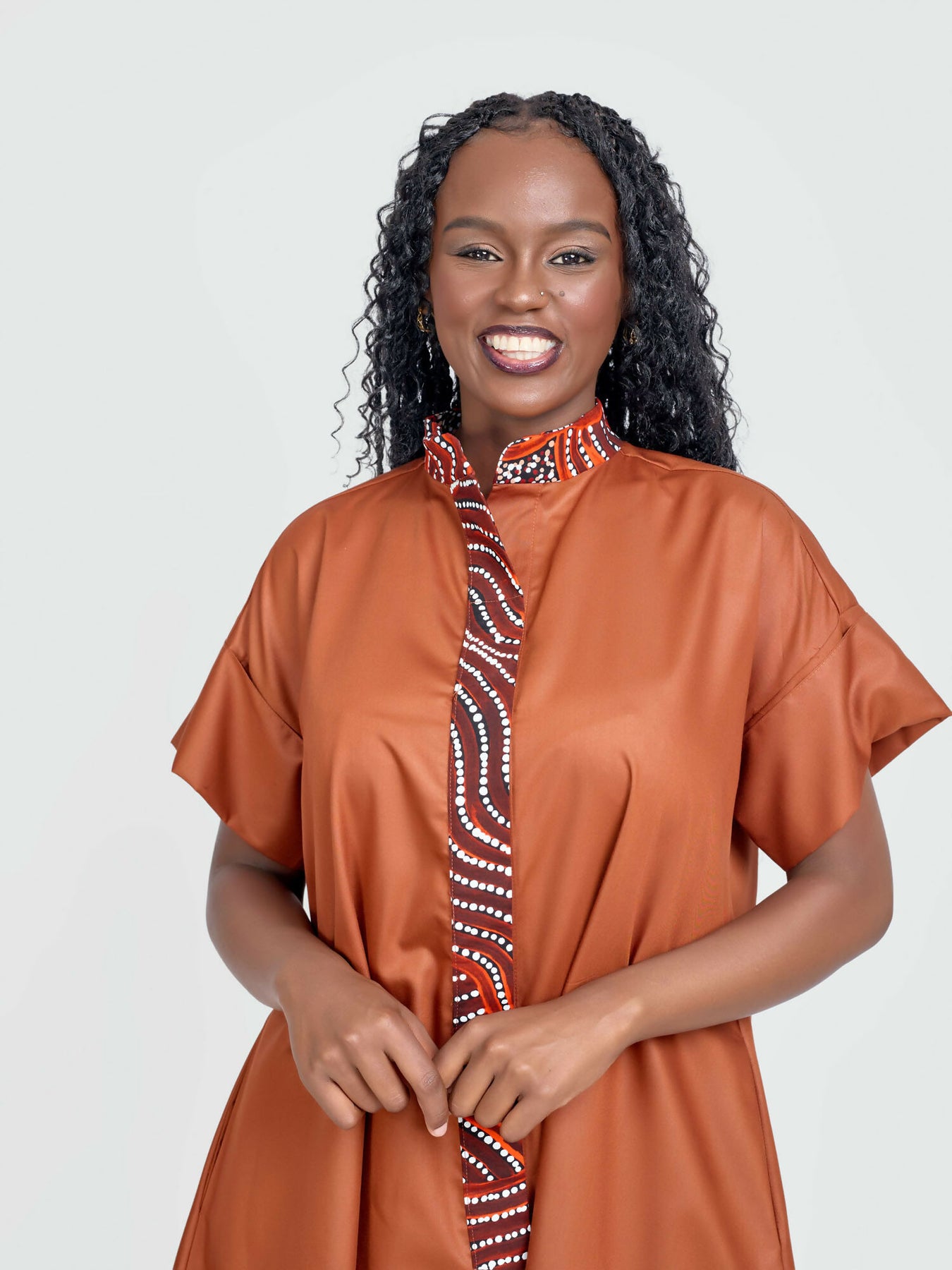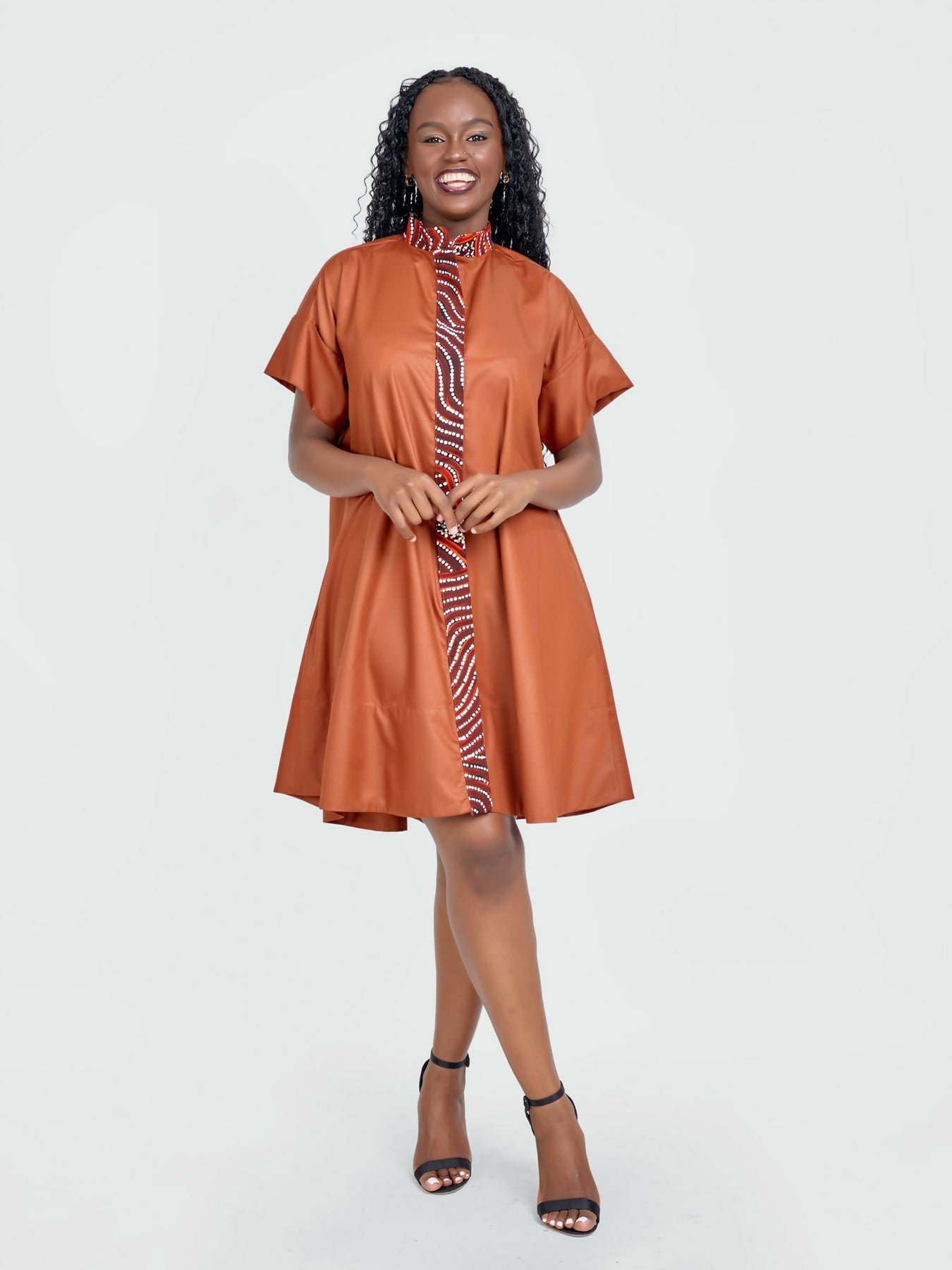 Product Details: This knee-length dress features a high-low hem, front buttons, inseam pockets, and short sleeves with decorative buttons. A hint of Ankara on the collar and down the front adds a pop of colour.