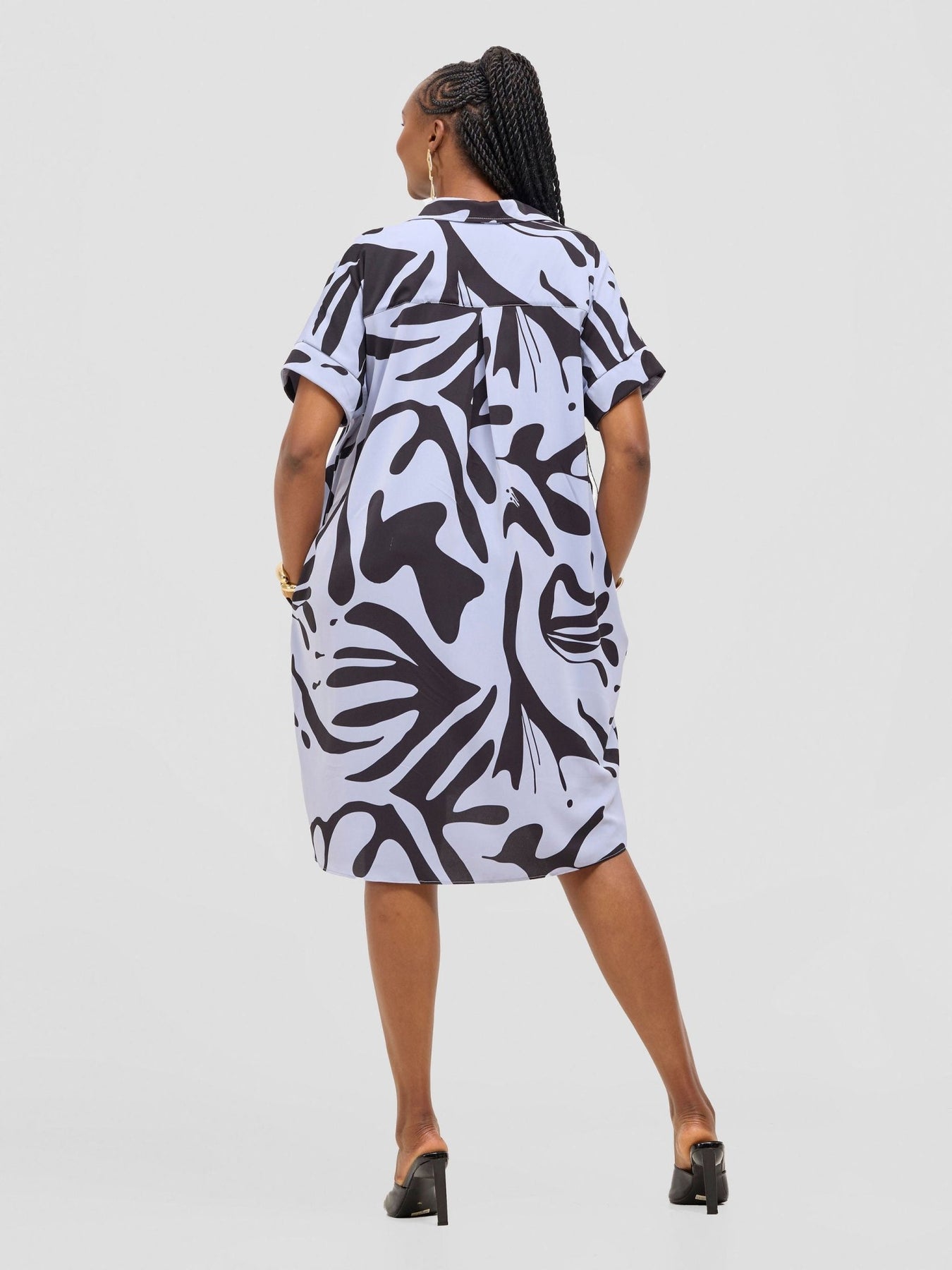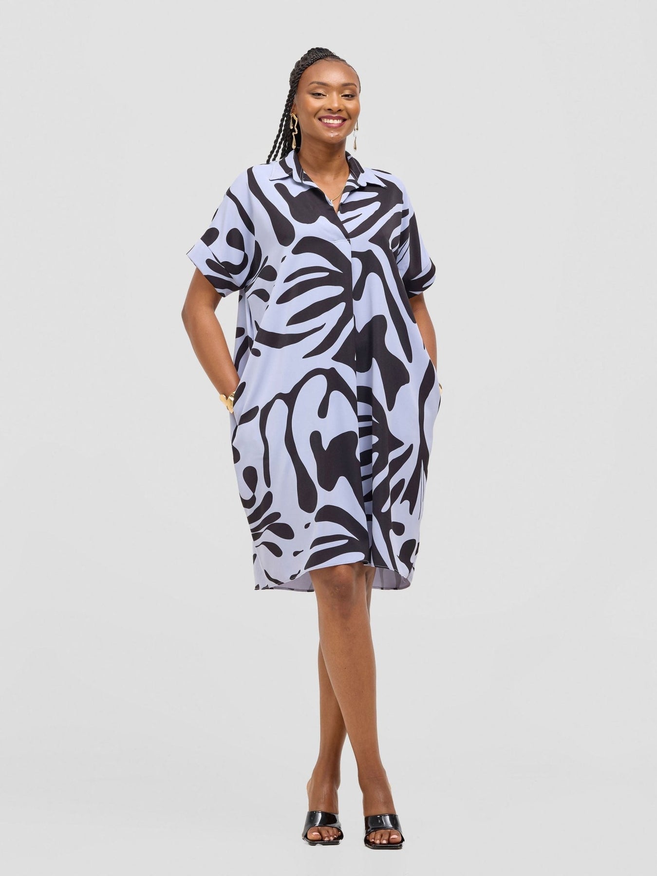 Vivo Reba Drop Shoulder Shirt Dress - Light Blue / Black Zari Print - Shopzetu