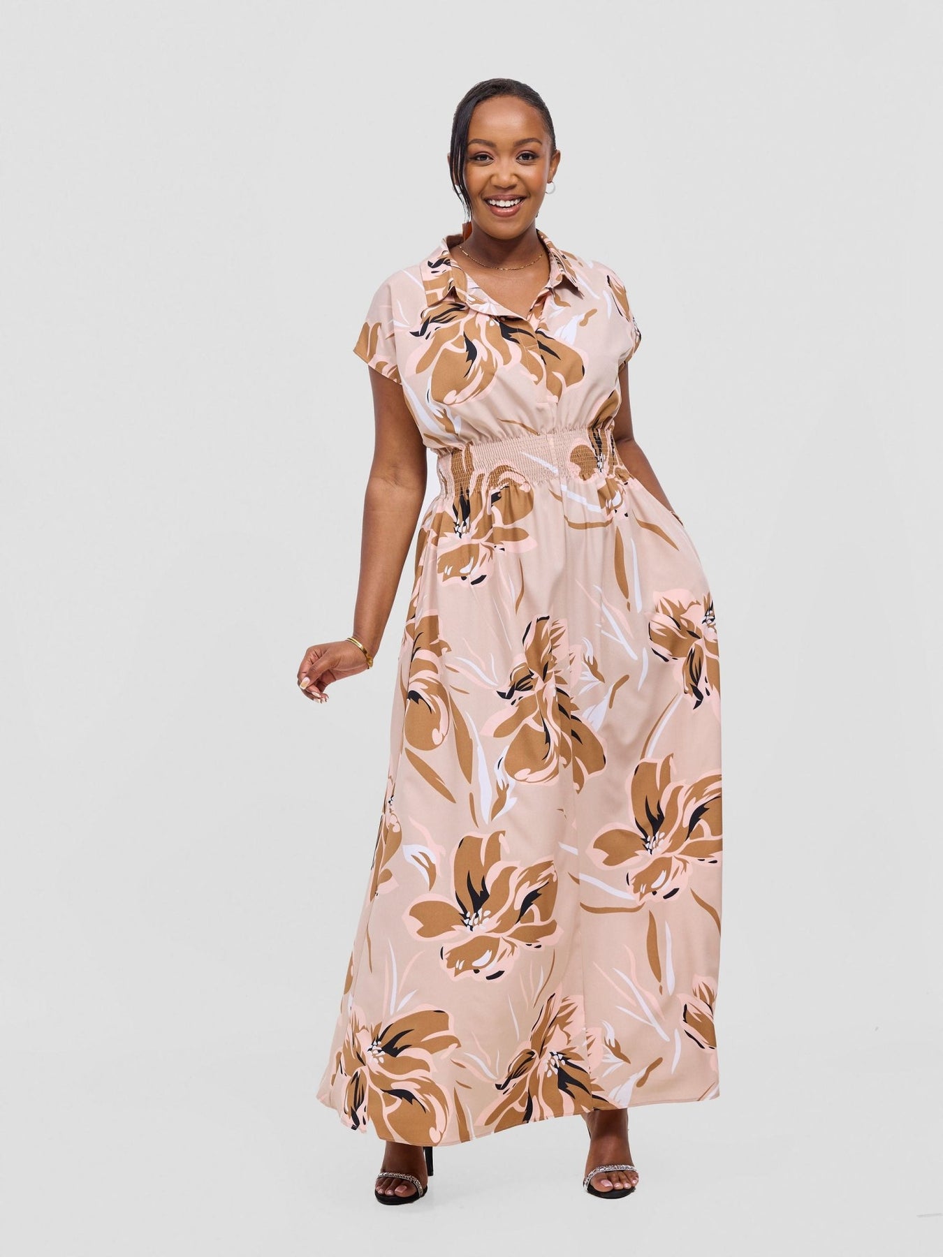 Vivo Zena Shirred Waist Maxi Shirt Dress - Taupe Jazah Print - Shopzetu