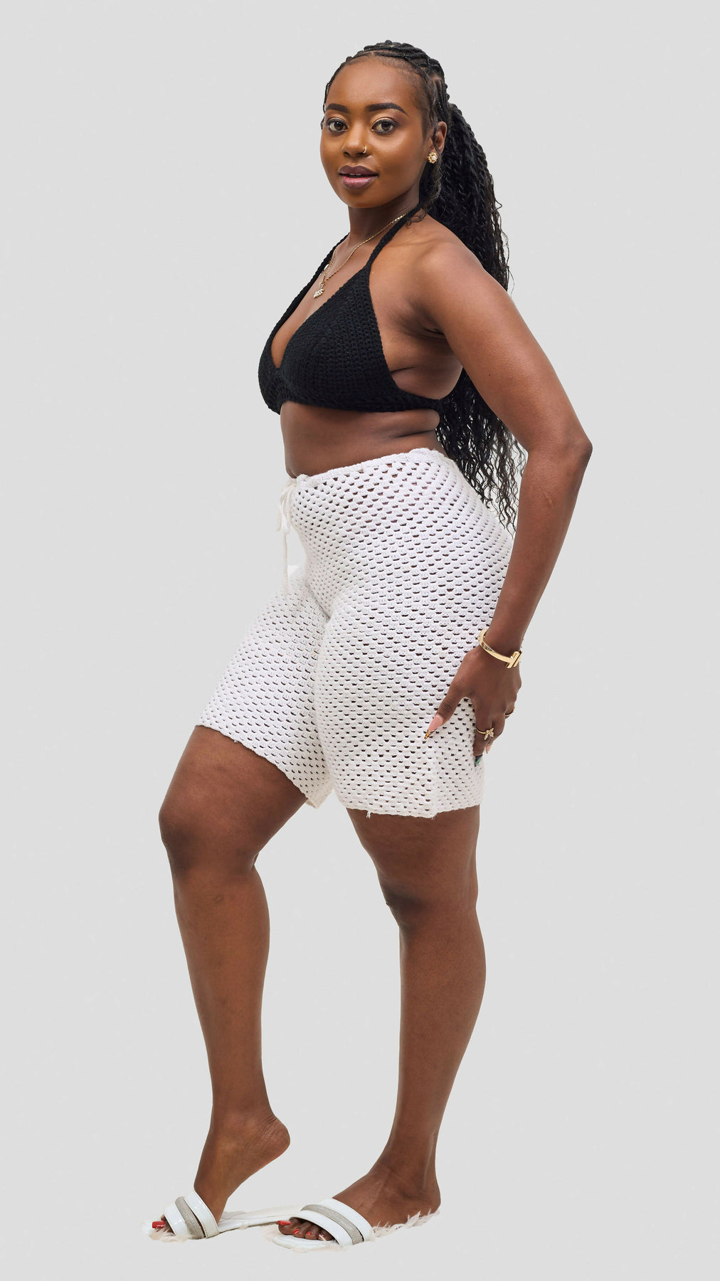 High-waisted white crochet knit shorts strike the perfect balance between chic and casual — ideal for sunny getaways, beach hangouts, or relaxed summer strolls.