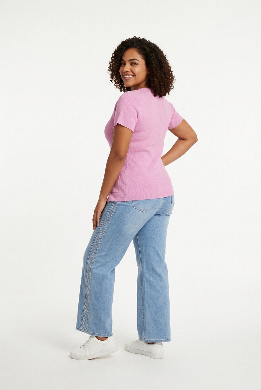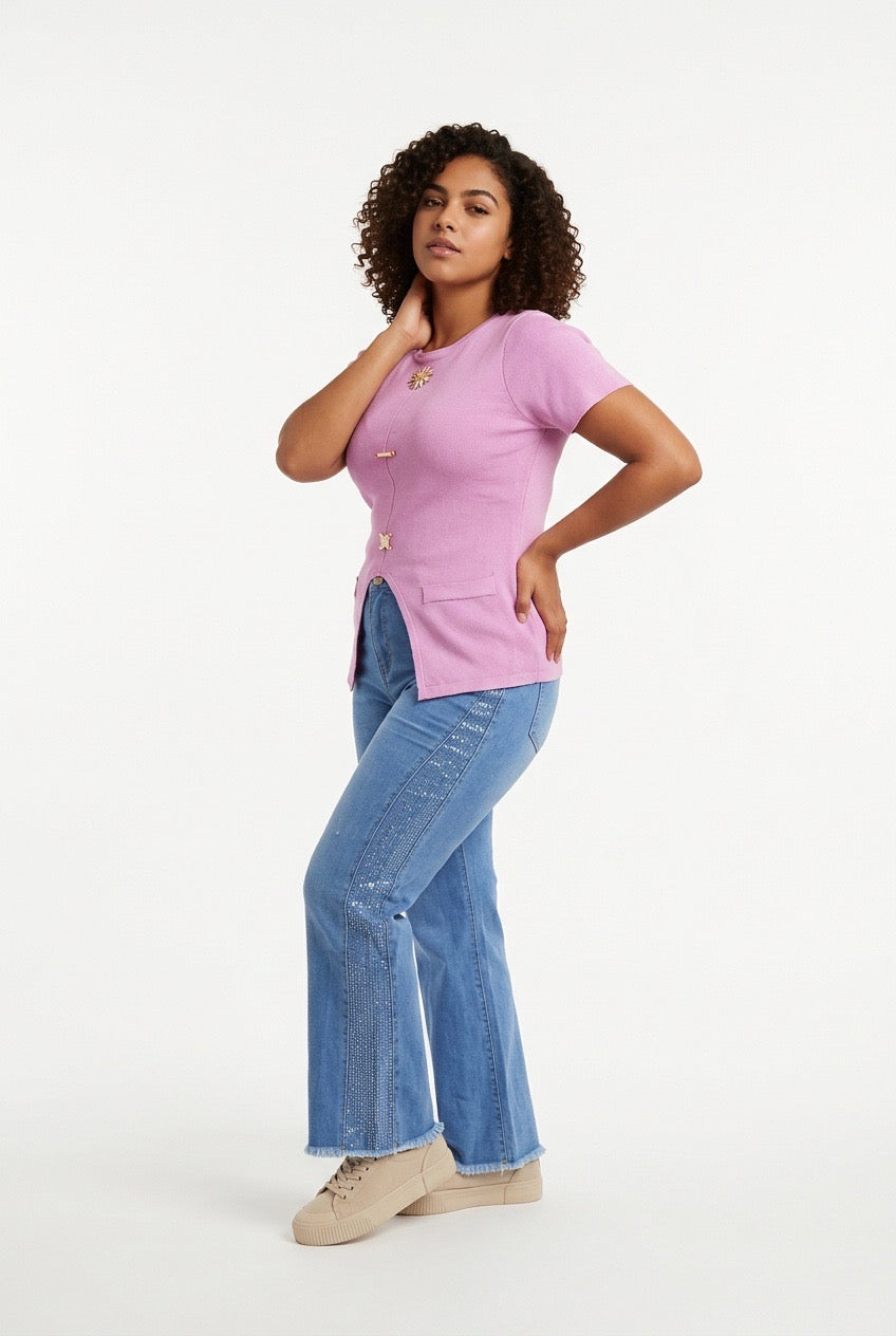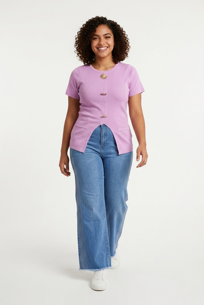 Stylish Sisters Crew Neck Gold Button Detailed Slit Top - Purple