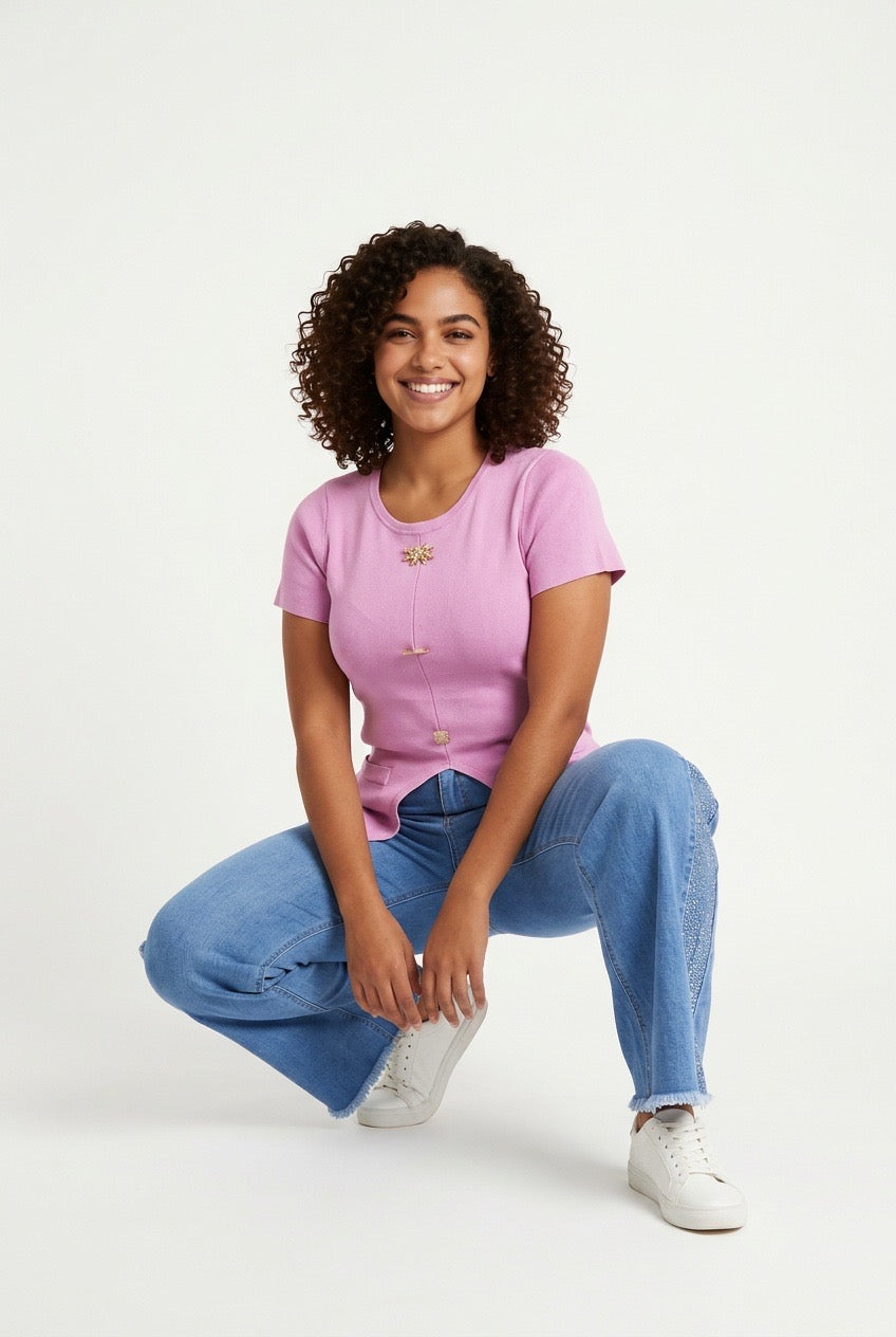 Item: This top is a purple, short-sleeved blouse or t-shirt characterized by its structured fit and prominent gold-toned hardware.