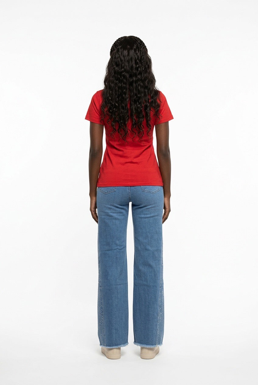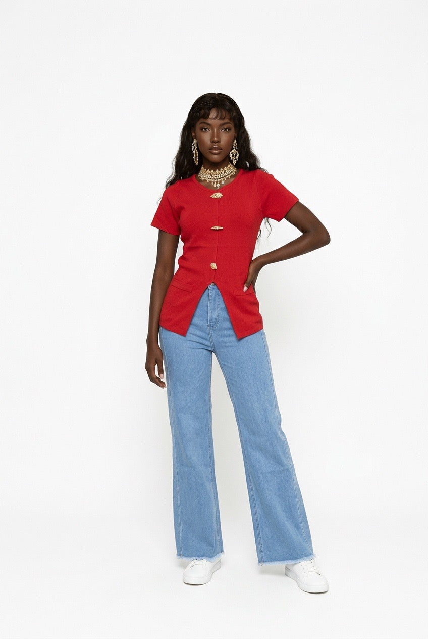 Item: This top is a red, short-sleeved blouse or t-shirt characterized by its structured fit and prominent gold-toned hardware.