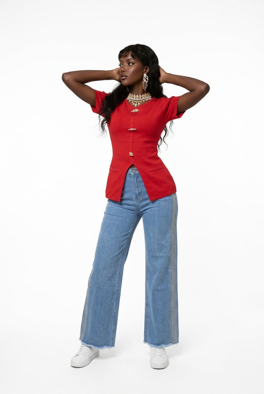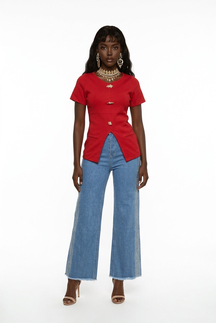 Stylish Sisters Crew Neck Gold Button Detailed Slit Top - Red
