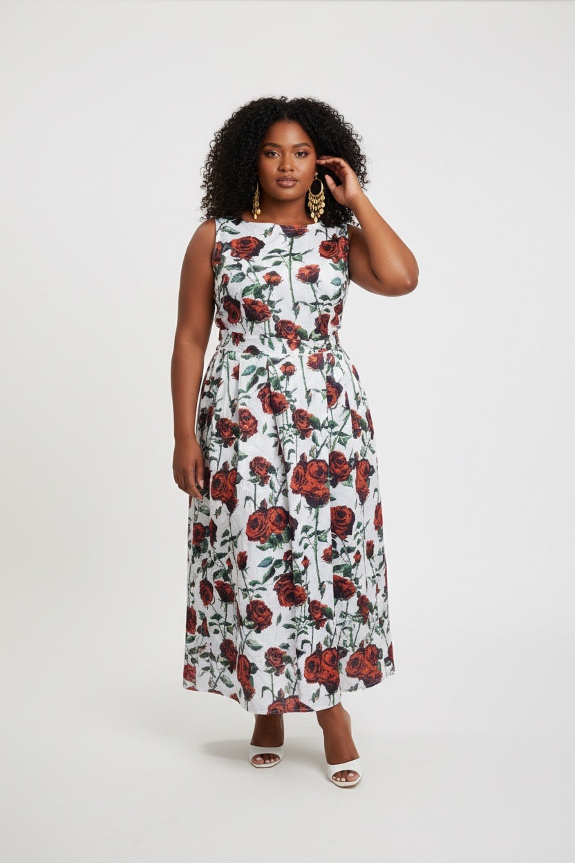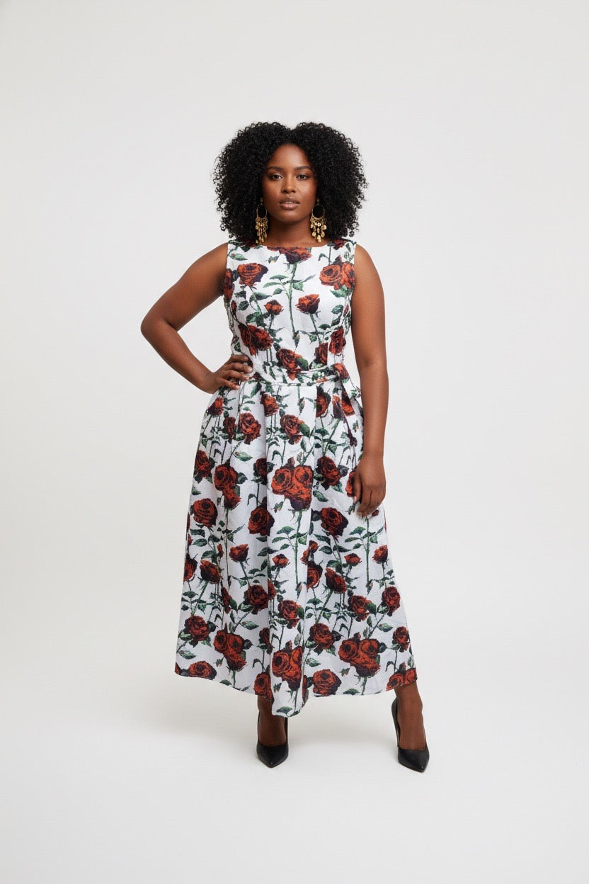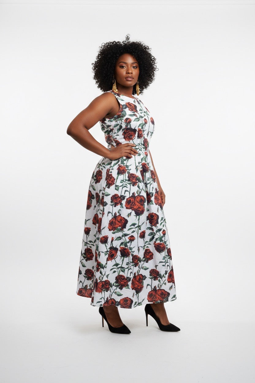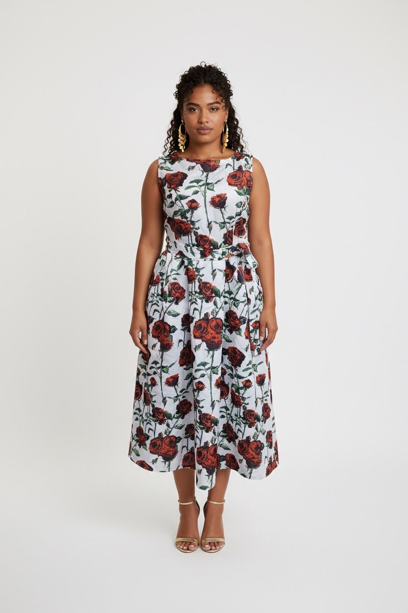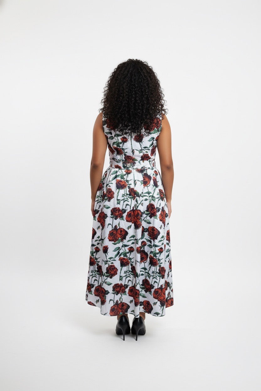 • Print: It features a bold, all-over botanical print of large red roses with green stems and leaves, set against a crisp white or off-white background.