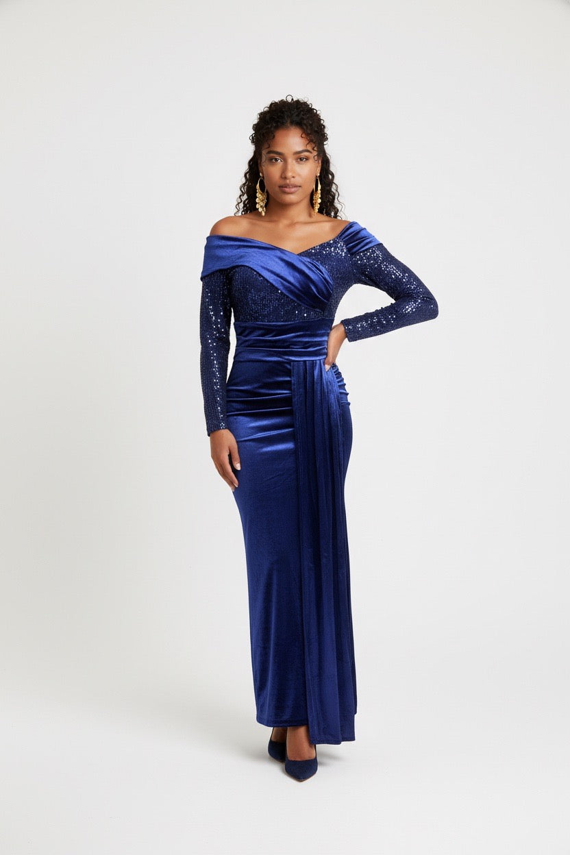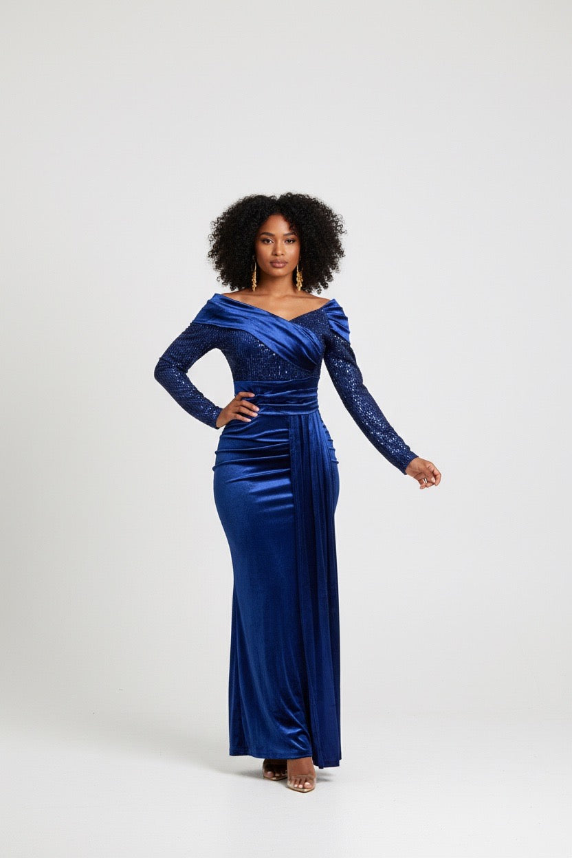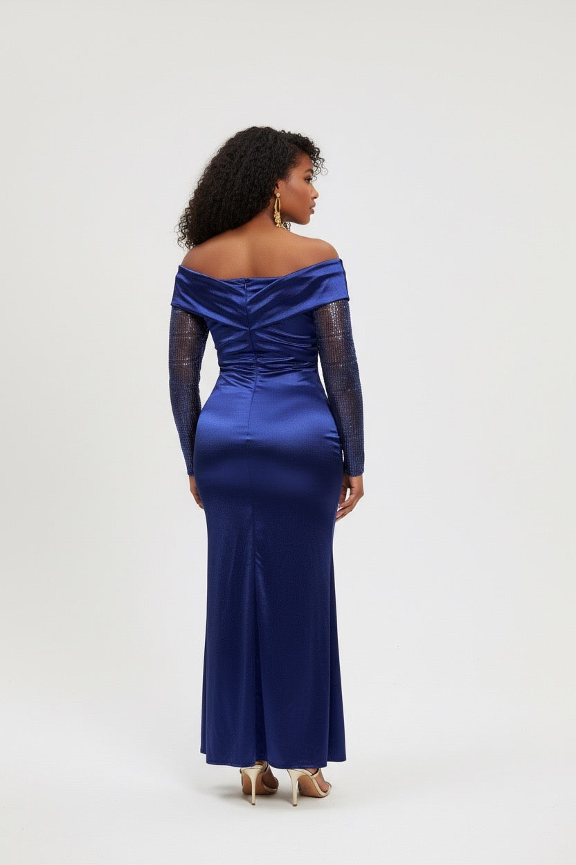 Item: Women's gown is characterized by a sophisticated off-the-shoulder or asymmetric neckline and long sleeves.