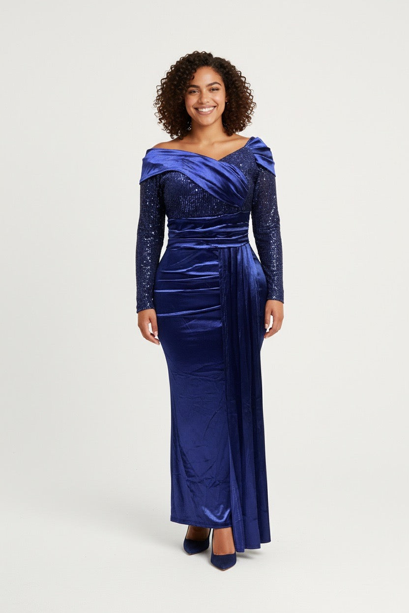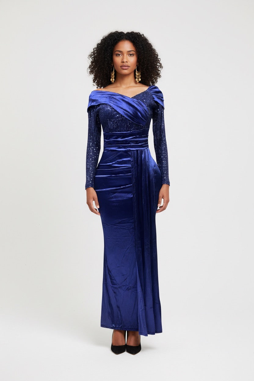 This floor-length gown features a striking asymmetric off-the-shoulder neckline that elegantly frames the collarbone. It is designed with a sequin patchwork bodice and long sleeves, adding a touch of glittering luxury. The lower portion is crafted from smooth satin and features pleated and ruched detailing that transitions into a fitted fishtail hem with a subtle train