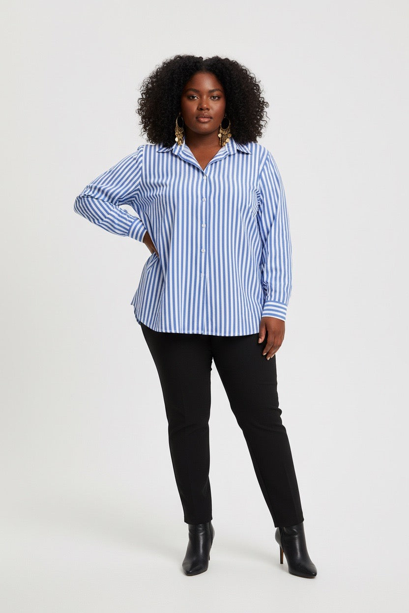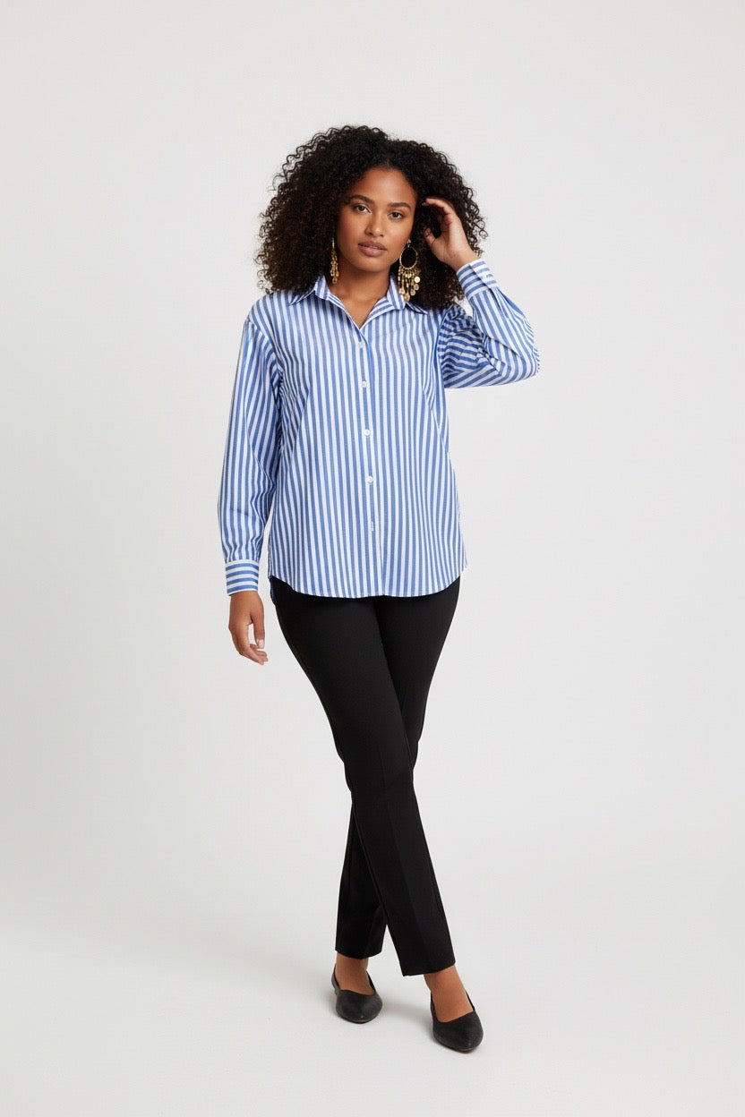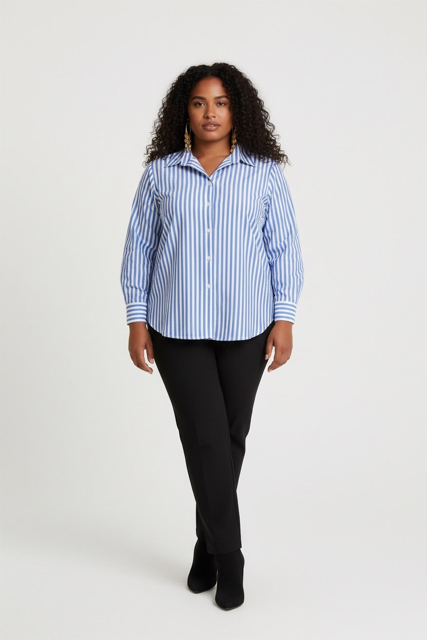 Item: Women's Relaxed-Fit Blue and White Vertical Striped Long-Sleeve Shirt.