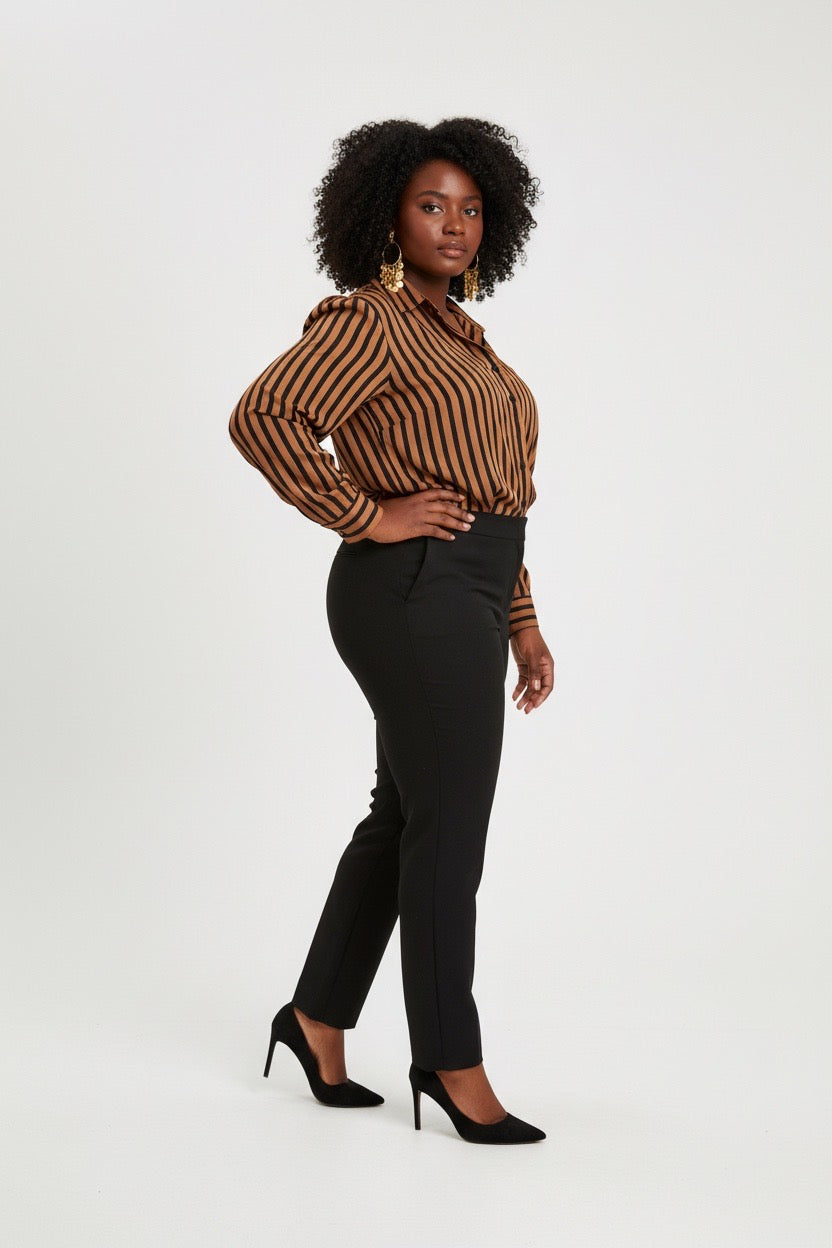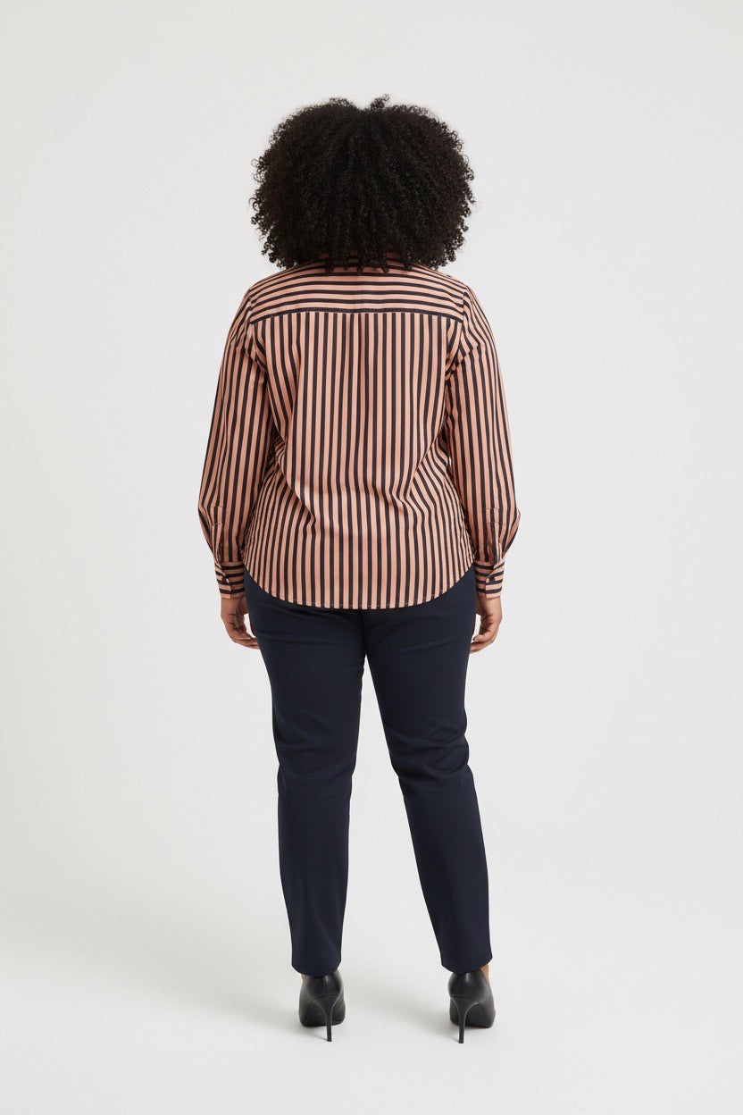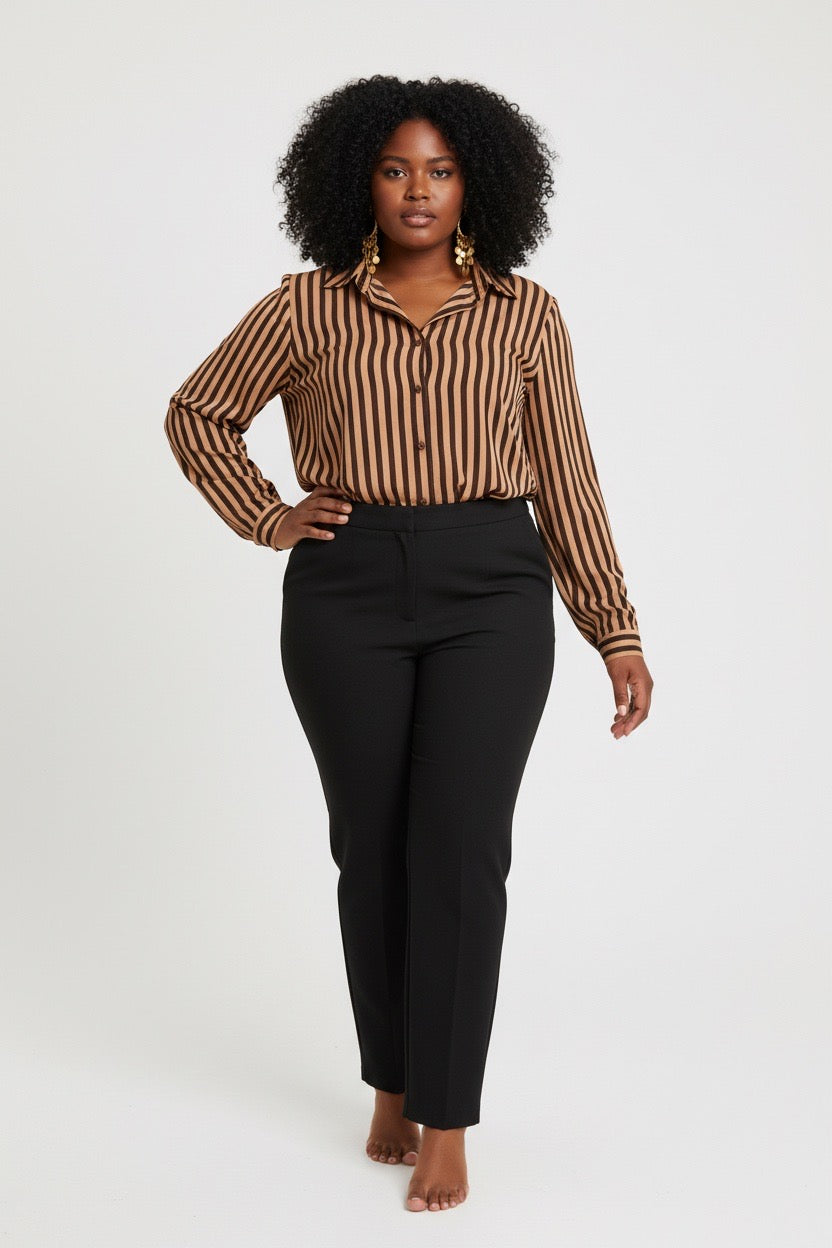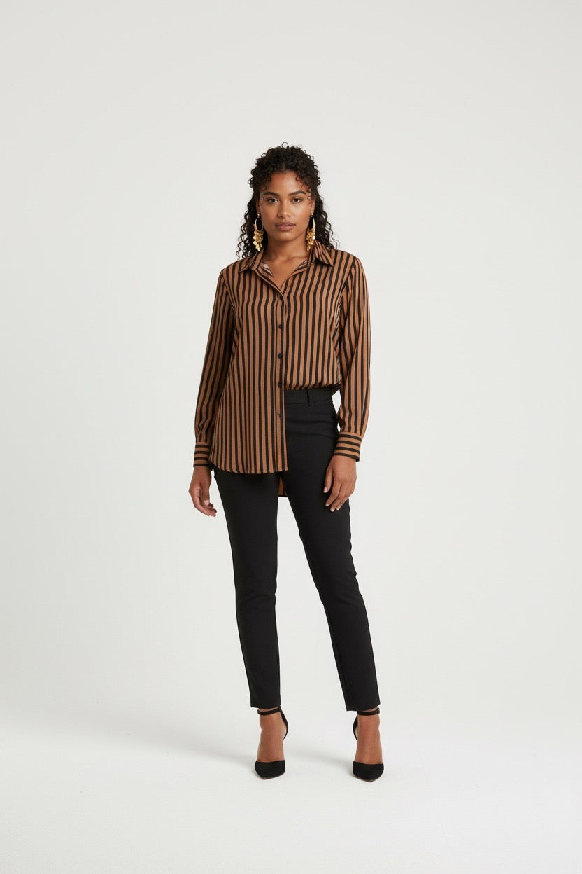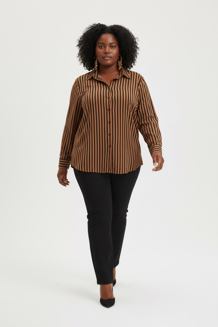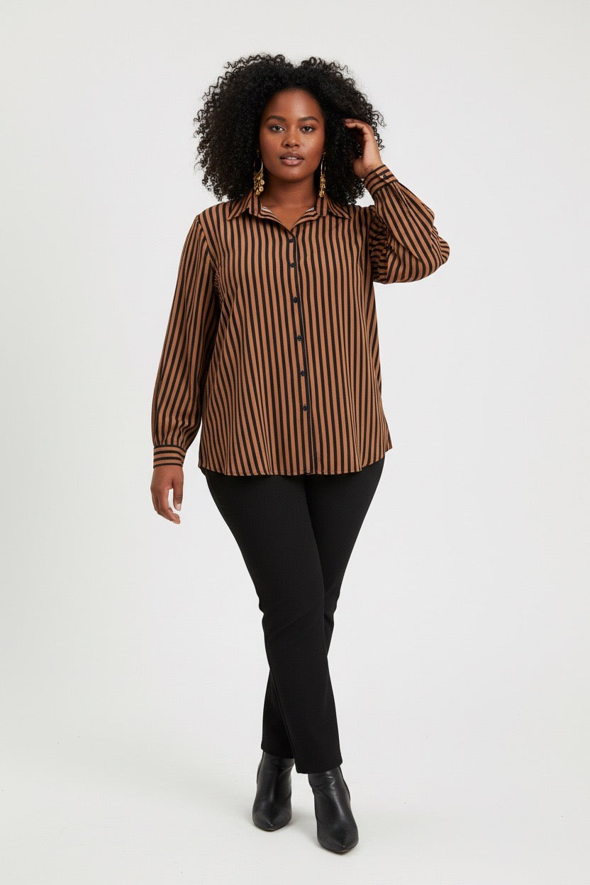 Item: Women's Relaxed-Fit Brown and Black Vertical Striped Long-Sleeve Shirt.